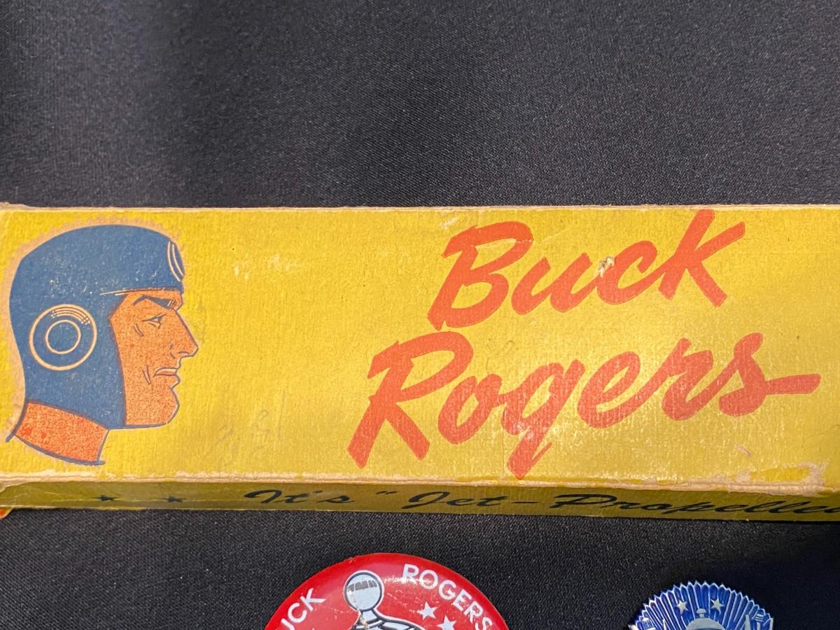 Lot of 5 Buck Rogers Strato Kite in Box Buttons and Pins. Includes Buck Rogers Strato-Kite in box, 1936 cream of wheat pin with pin back, Buck Rogers in the 25th Century Button, and 1930s Buck Rogers Solar Scouts Pin. Condition as shown.