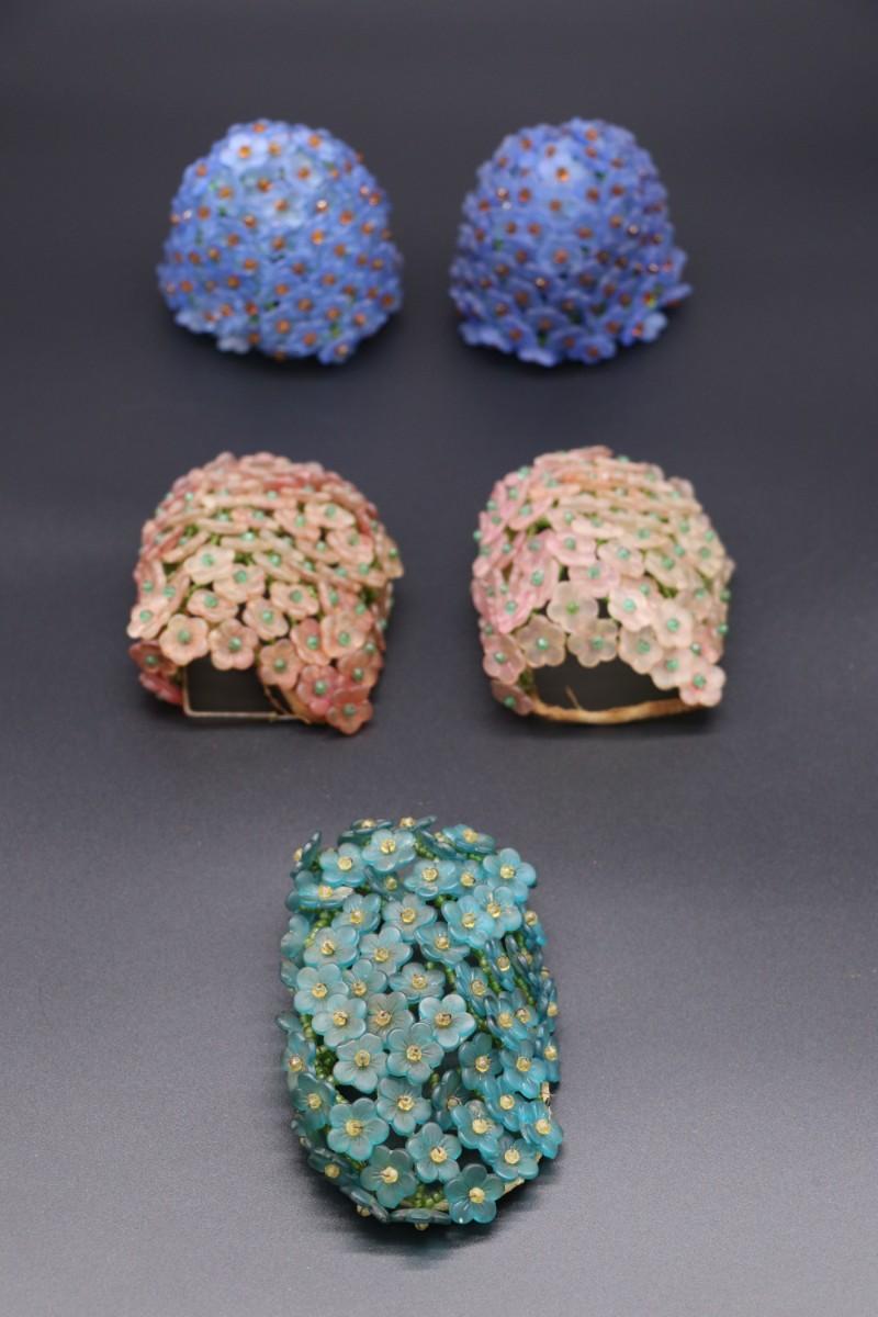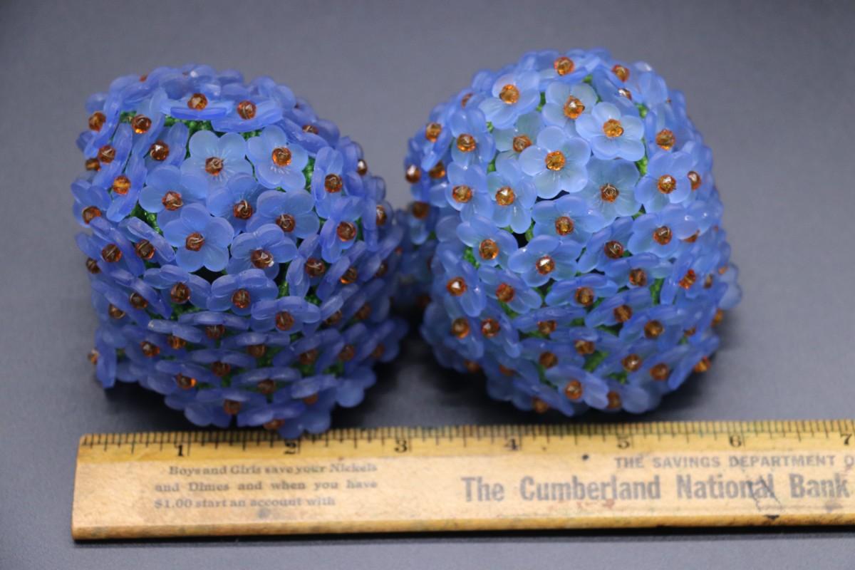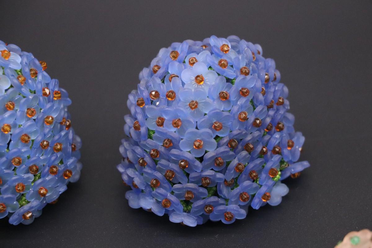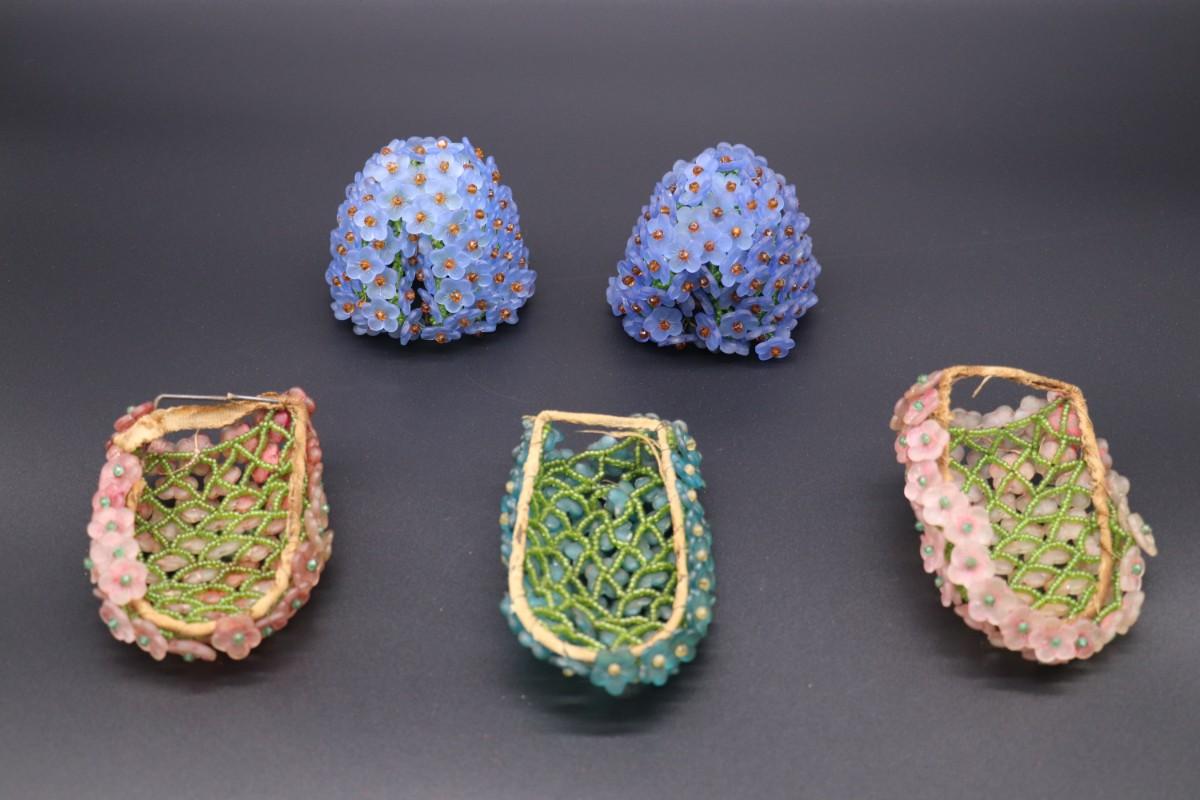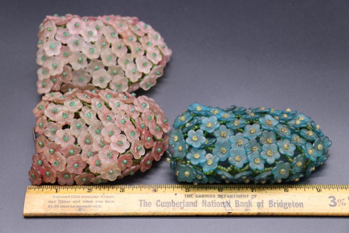 Lot of 5 Czechoslovakian Antique Flower Beaded Bulb Cover Lamp Shades in Blue, Green, and Pink. From the estate of an antique store owner and lamp enthusiast. Condition as shown, some signs of wear.