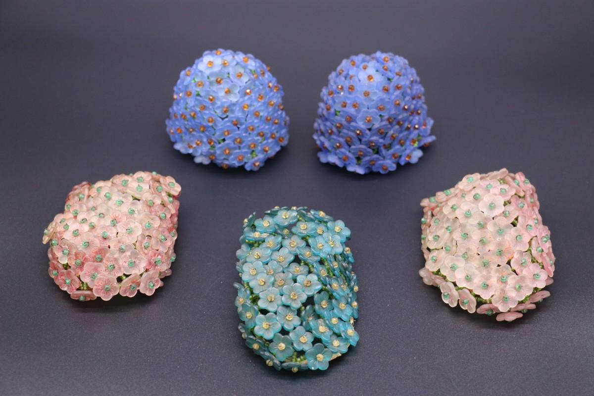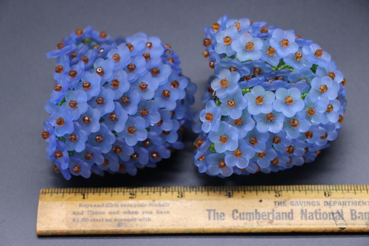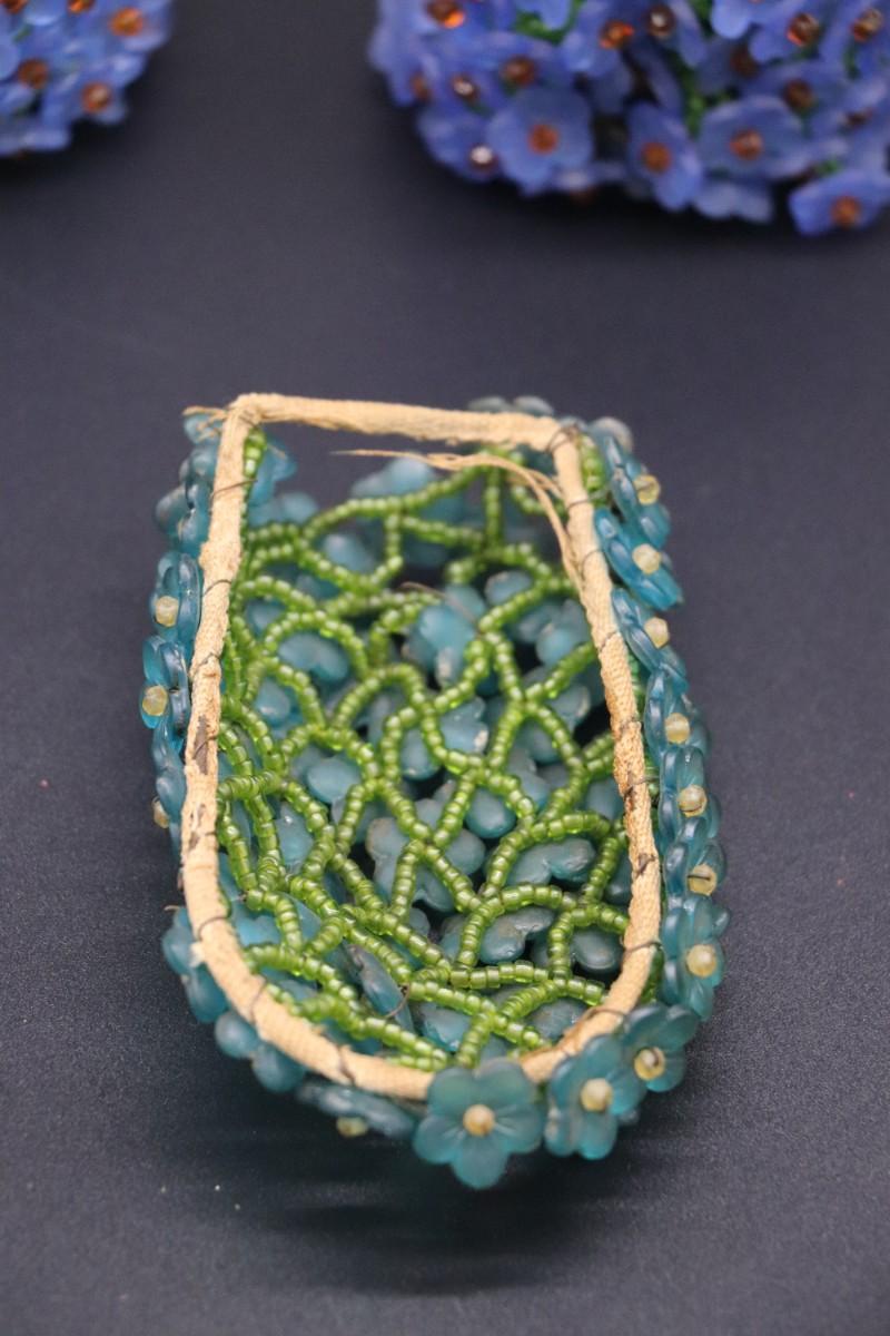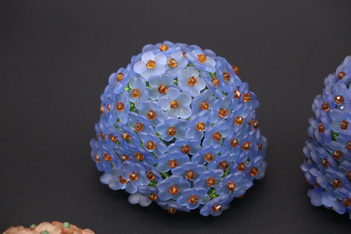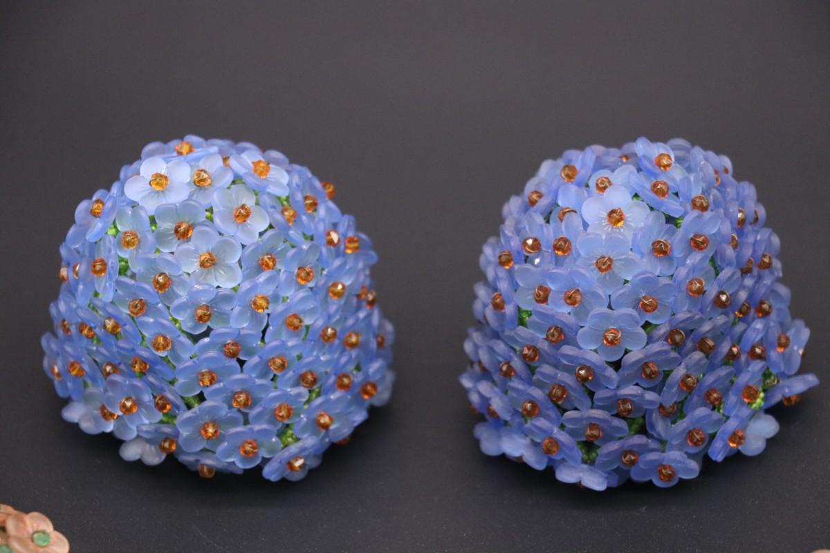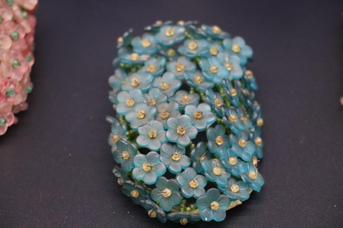 Lot of 5 Czechoslovakian Antique Flower Beaded Bulb Cover Lamp Shades in Blue, Green, and Pink. From the estate of an antique store owner and lamp enthusiast. Condition as shown, some signs of wear.
