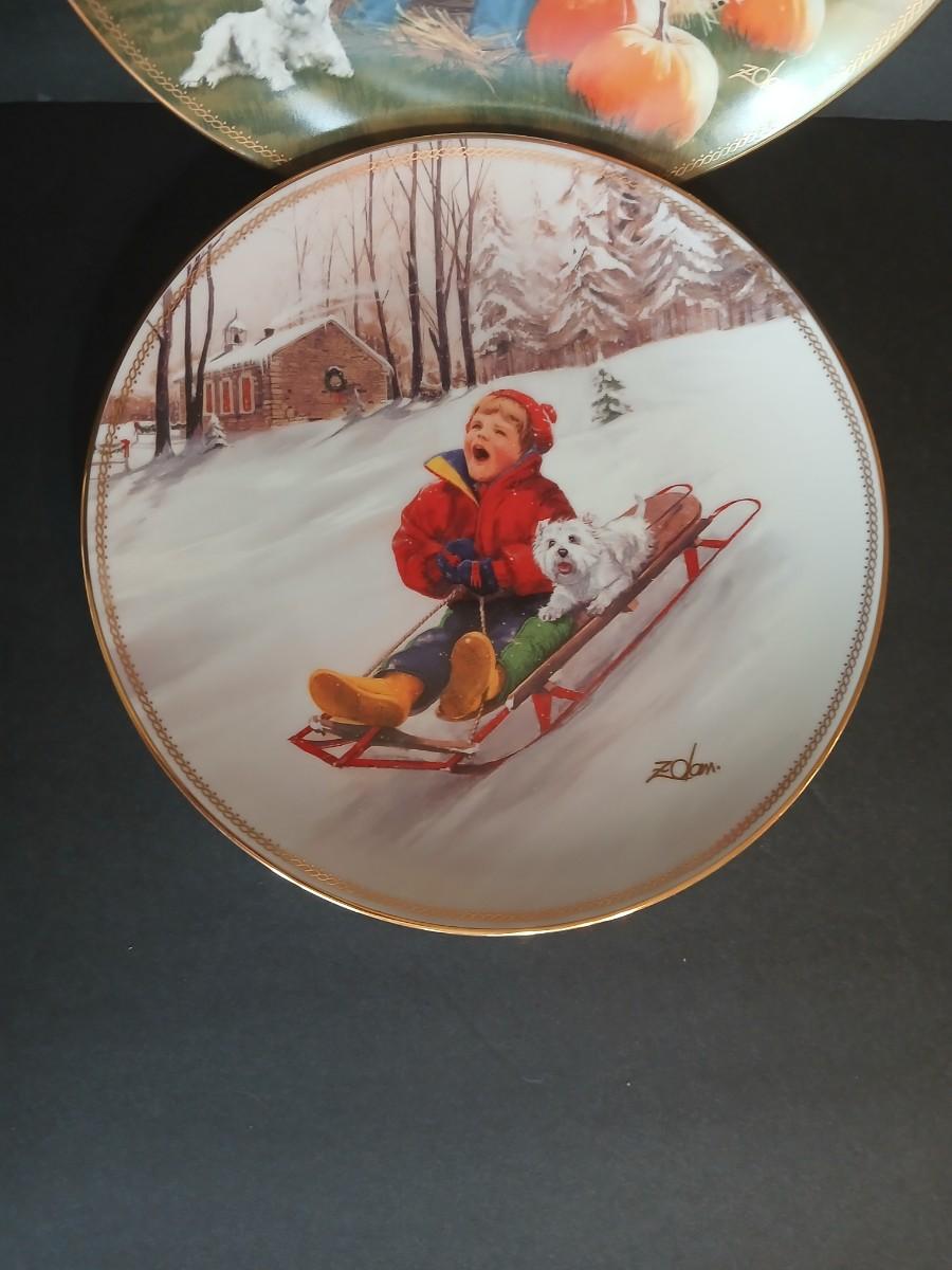 This lot includes five charming limited-edition plates from the Puppy Pals collection by beloved artist Donald Zolan, issued by the Danbury Mint. Each plate features heartwarming scenes of children, and their Westie puppy companions in classic Americana settings. Titles include: