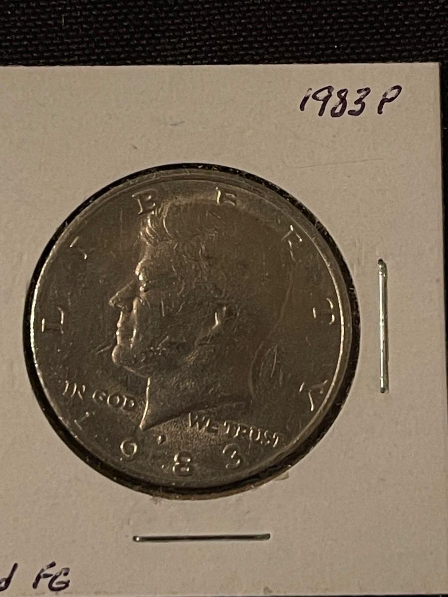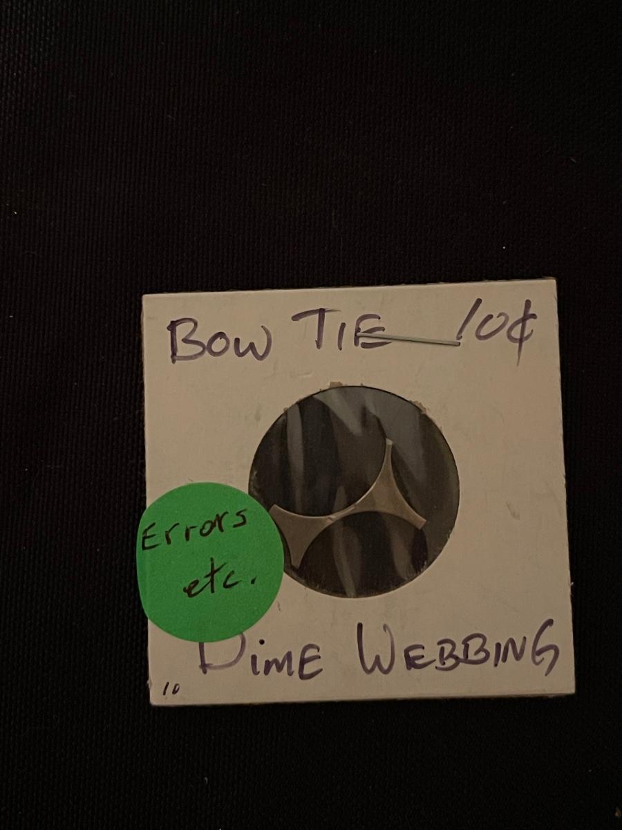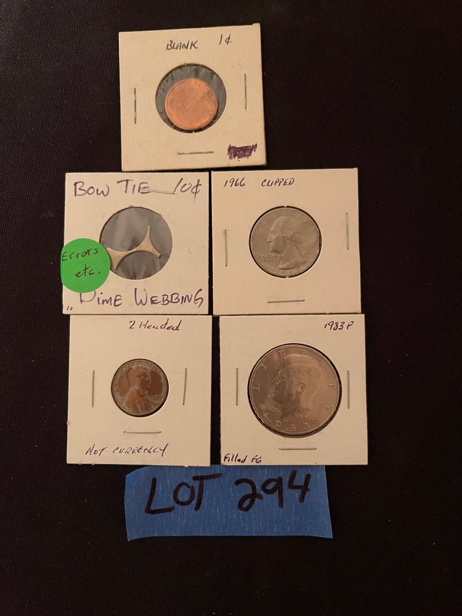 Blank 1 cent, bow tie 10 cent Dime Webbing, 1966 clipped quarter, 2 headed penny, 1983 P Kennedy Half Dollar Filled FG