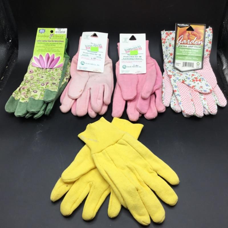 Five gardening gloves as pictured. For our unused with the original packaging, and one is gently used. See pictures.
