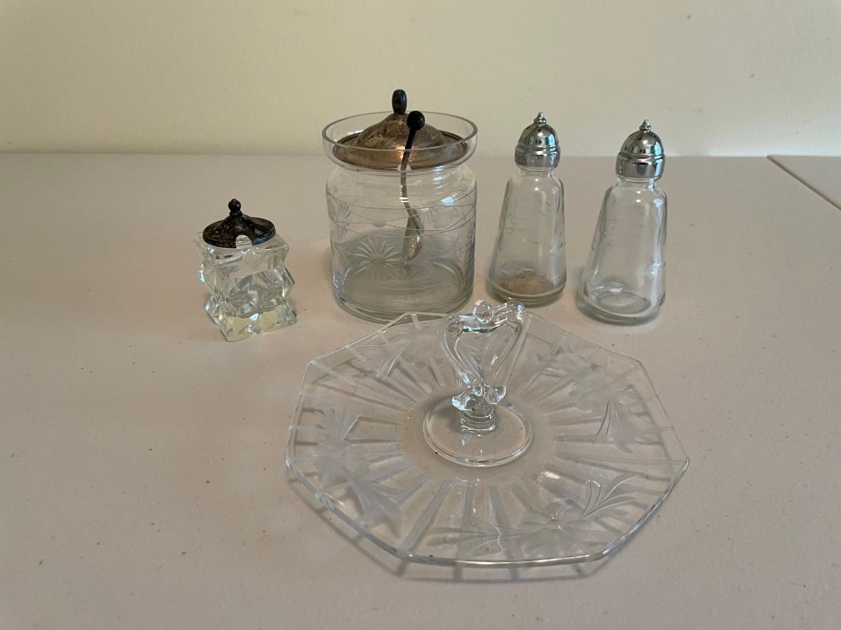 Serving tray, sugar, salt and pepper