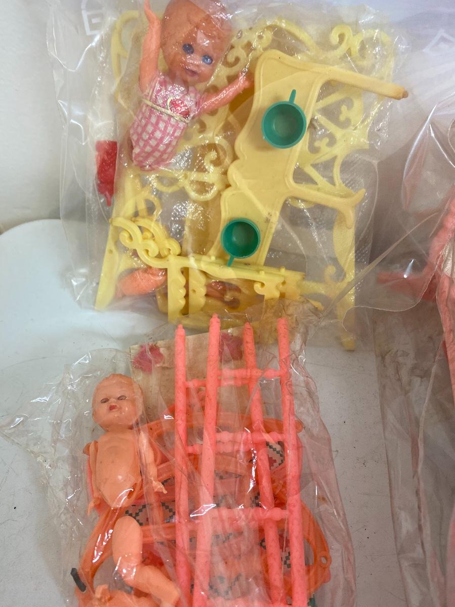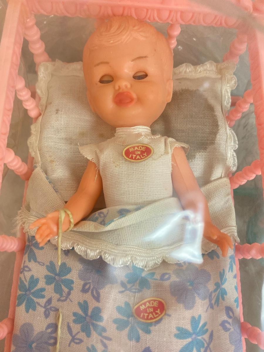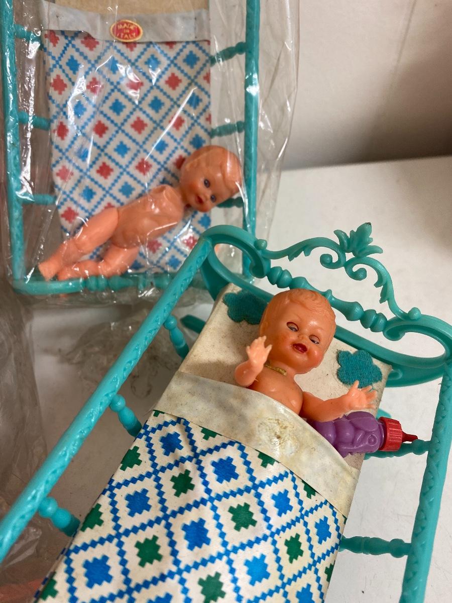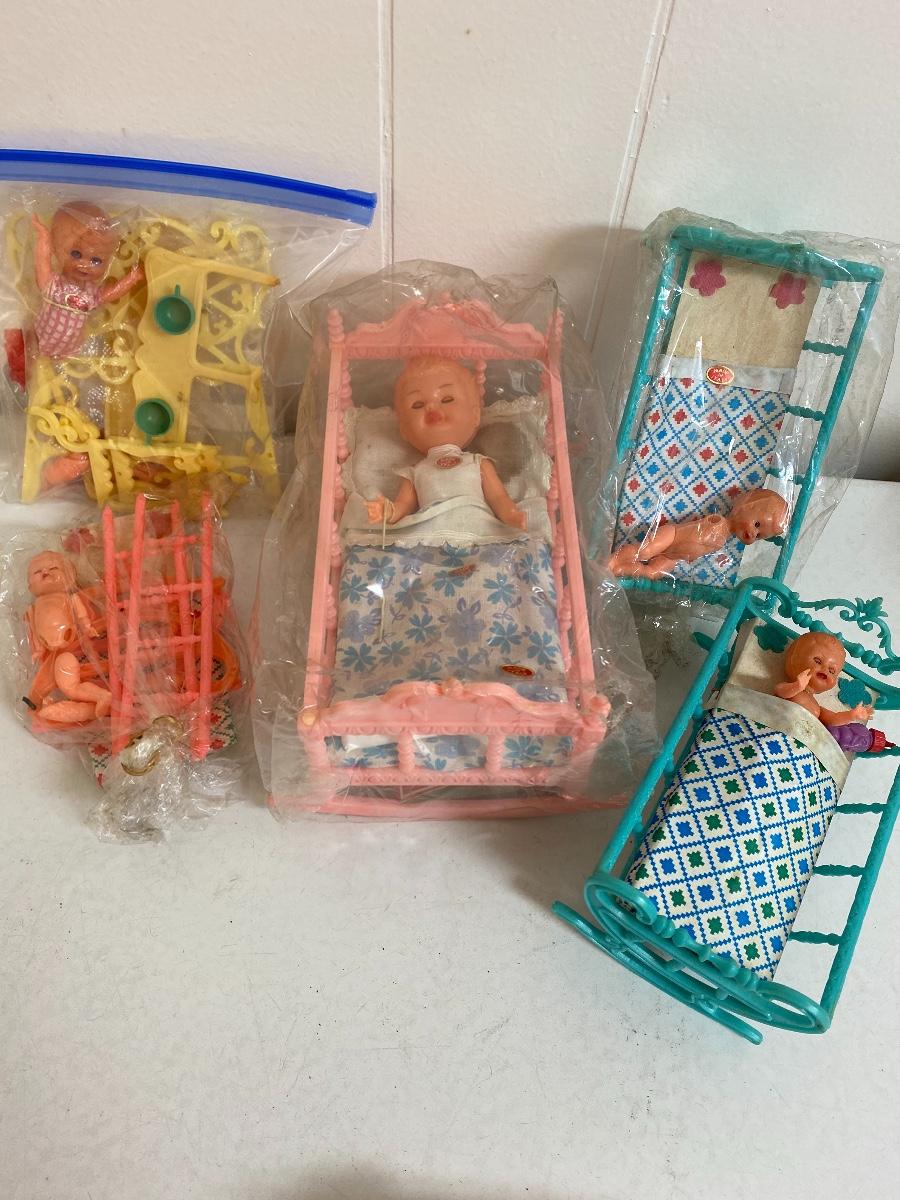Lot of 5 Italian vintage plastic baby dolls with cradles. Largest doll is six inches and smallest is 3 inches. Good condition.