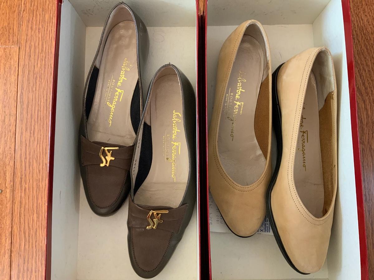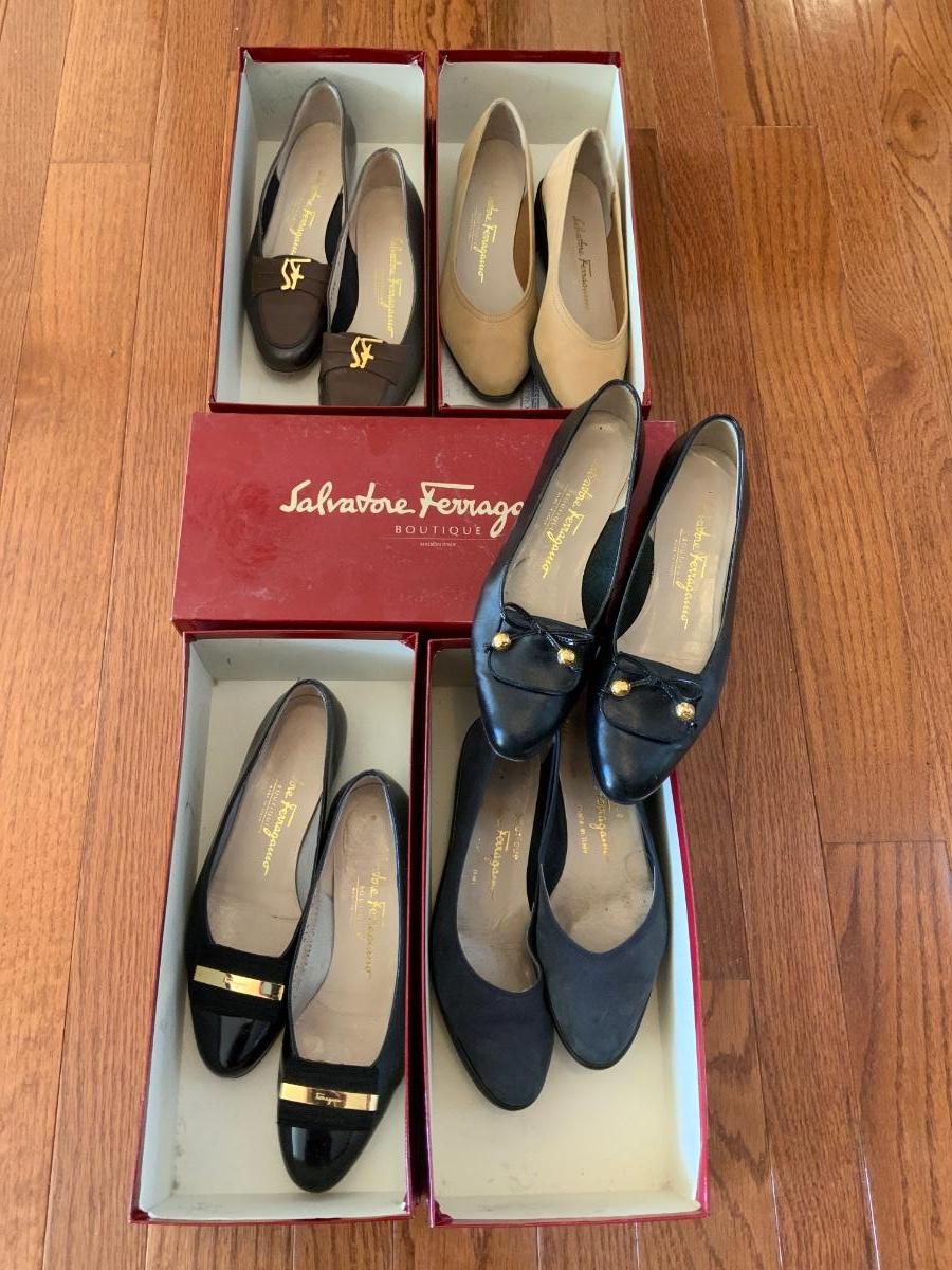 Nice lot of ladies 4 1/2 B ladies Salvatore Ferragamo Italian Shoes. Lot of 5. Brown, Tan, Black and Gray.