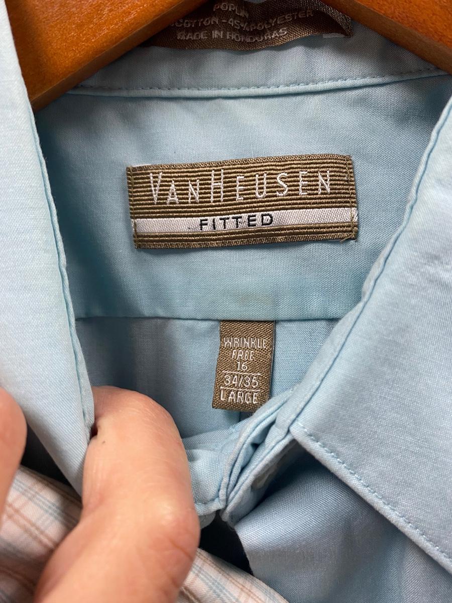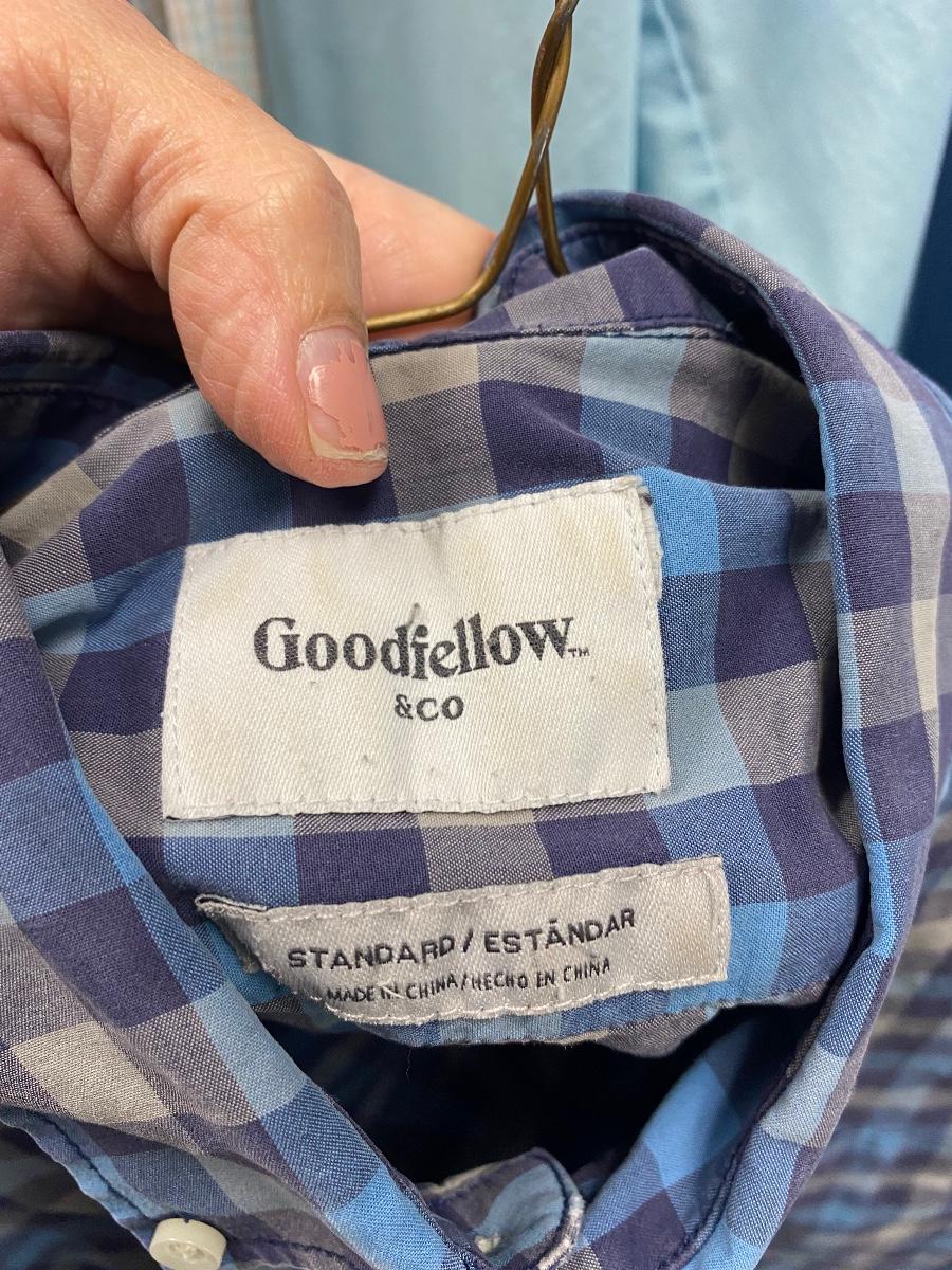 Lot of 5 men's button front long sleeve dress shirts. Business casual. Size medium/large, may be slim fits. Brands include Perry Ellis, Van Heusen, Merona, & Goodfellow. Good worn condition, no holes or spots.
