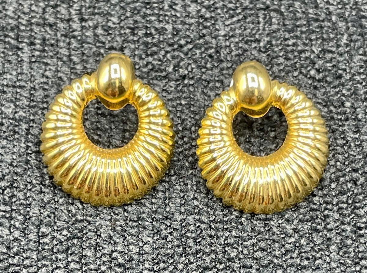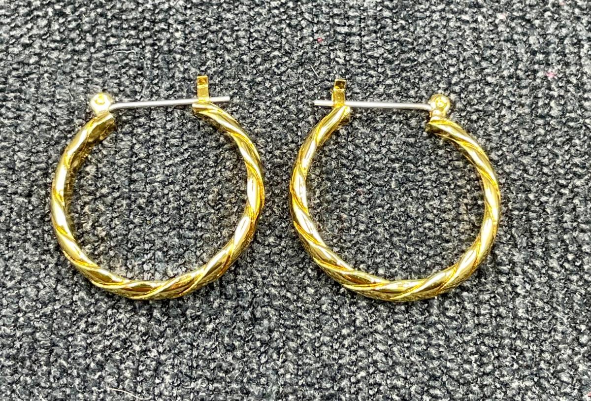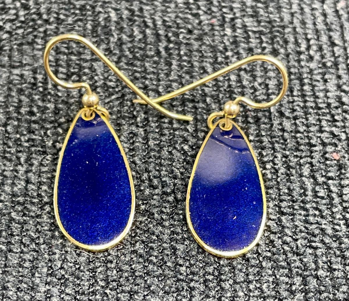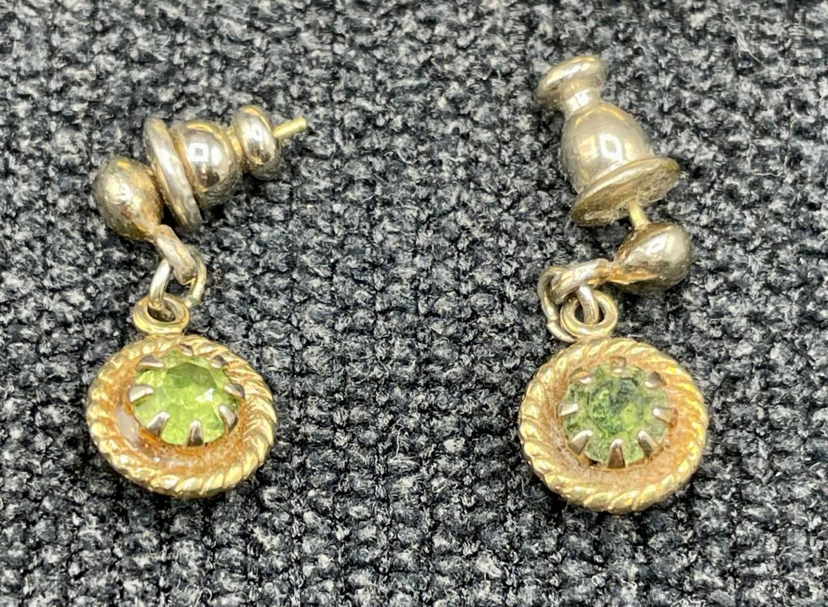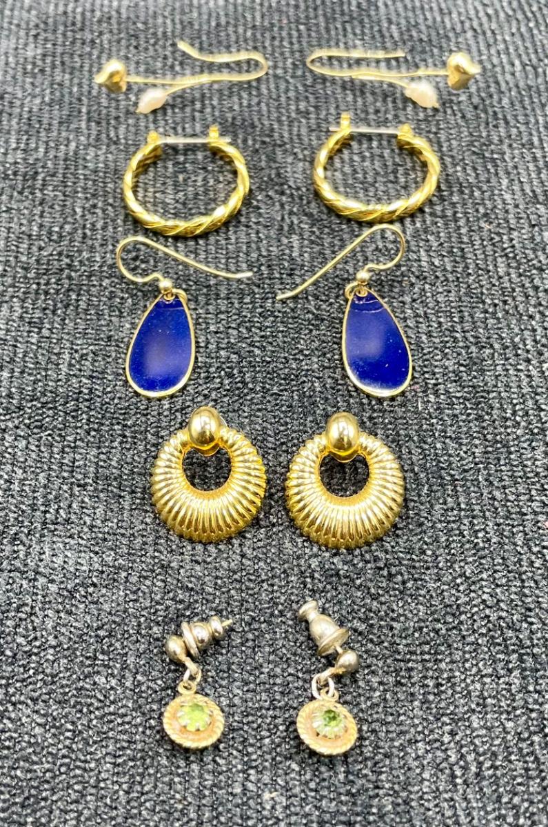 Gold-tone metal. Different styles: Hoops, small emerald-like stones, and blue-colored dangling features.
