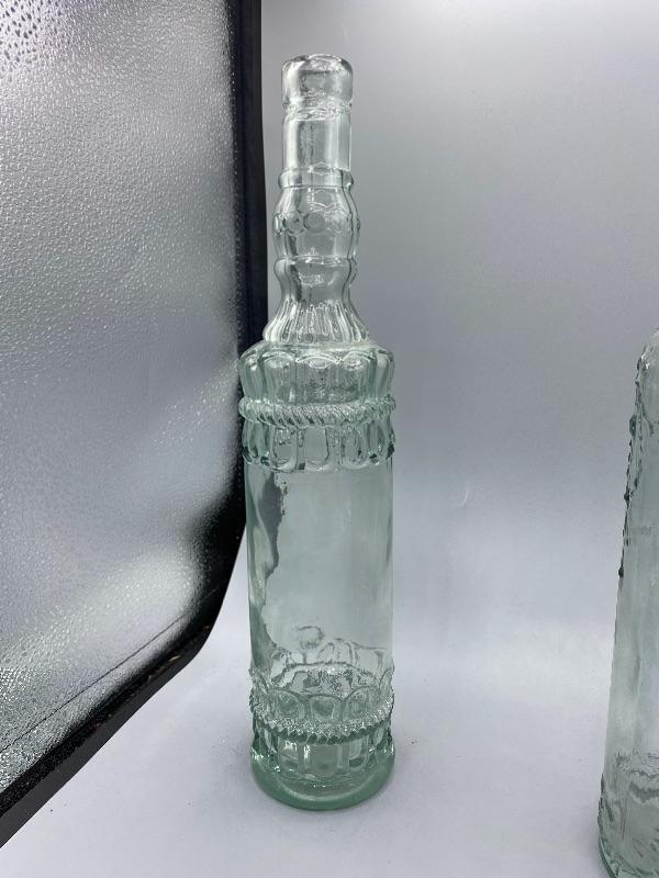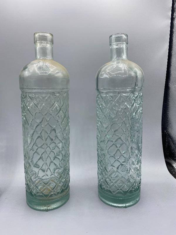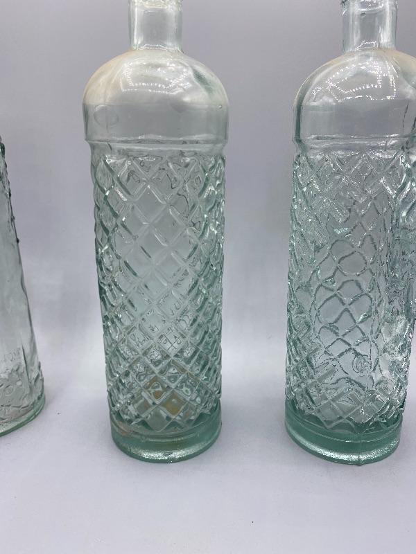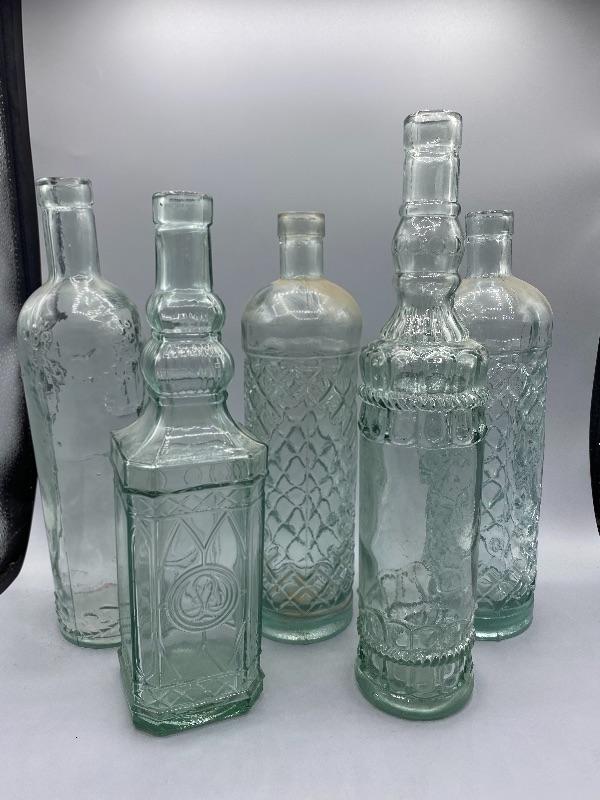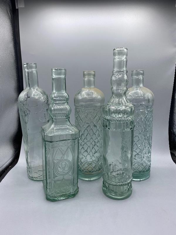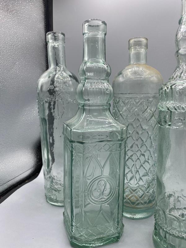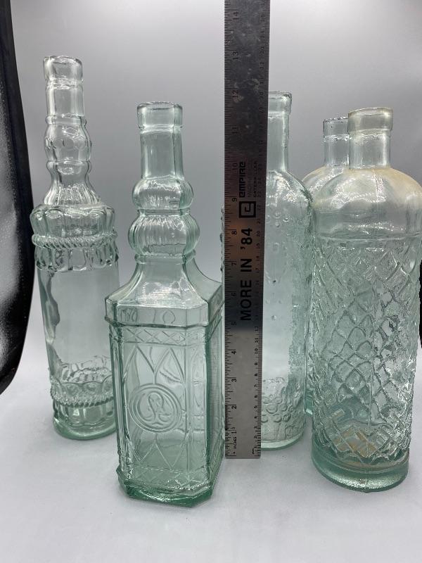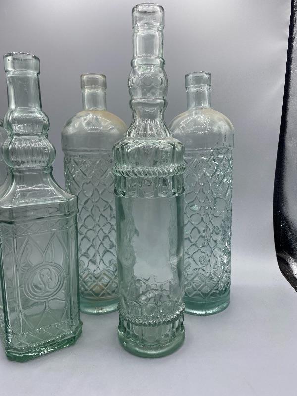 Lot of 5 pale green glass bottles. Great shapes for displaying. They are a little dusty but no chips or damage. There is a few bubbles in the glass here and there. Two of them are identical.