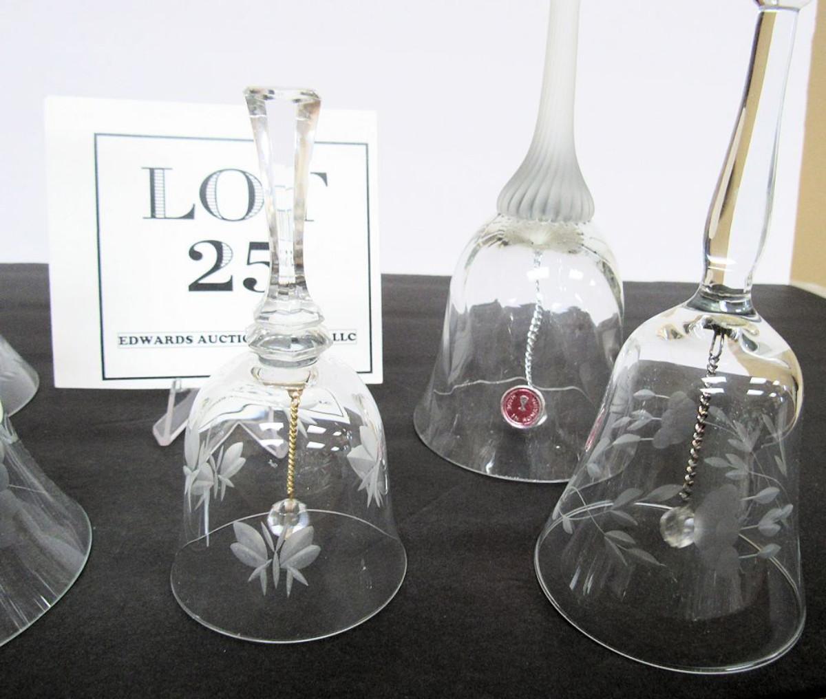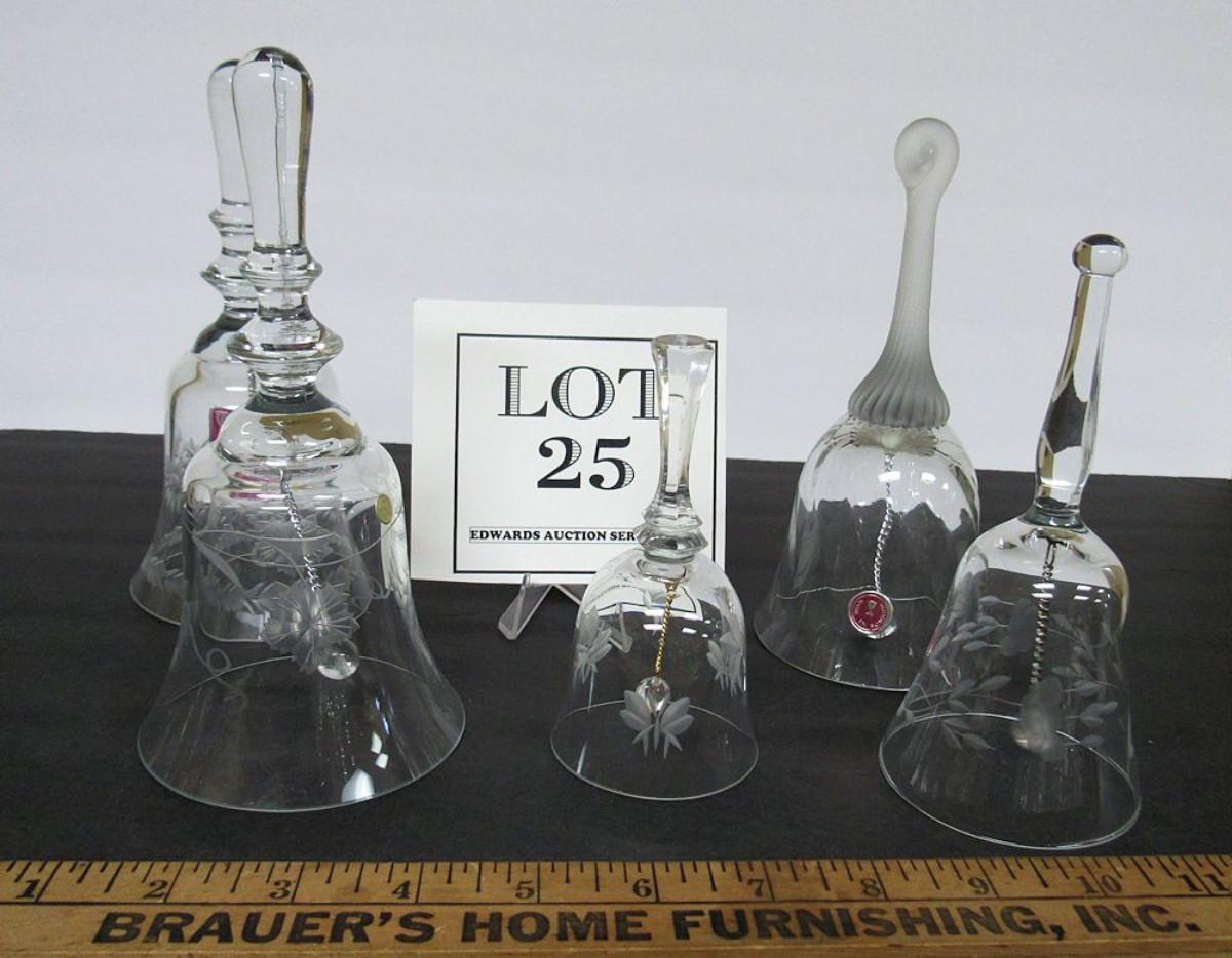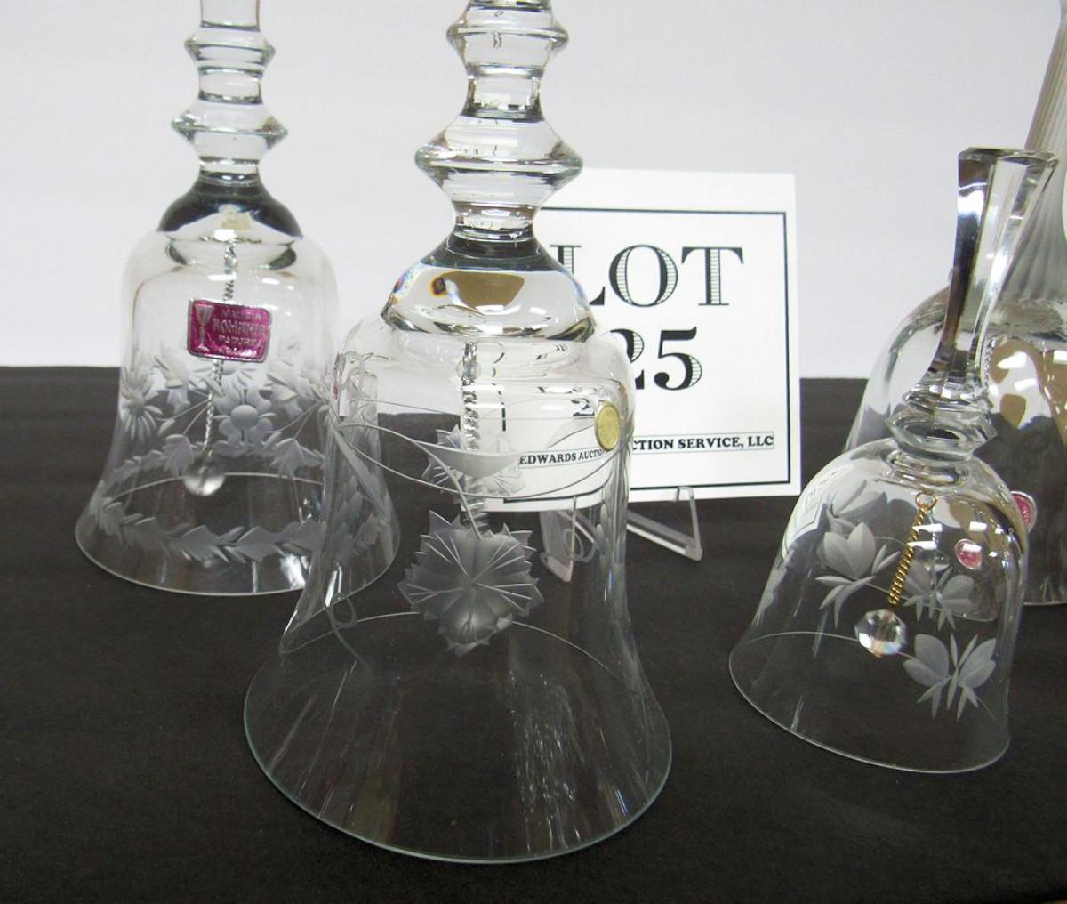 Lot of 5 Pretty Cut Glass Bells, 2 Romania, 1 Hungary, 2 Unmarked, Nice Lot
