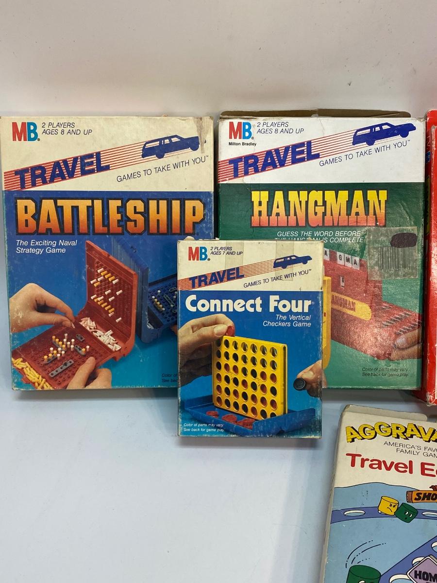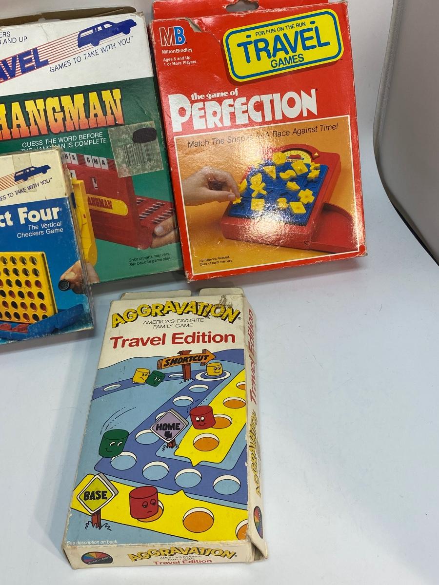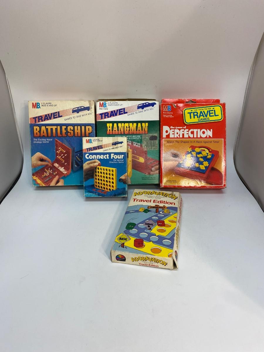 Lot of 5 Travel Road Trip Board Games - Battleship, Hangman, Perfection, Connect Four, & Aggravation. Did not count pieces but they look pretty complete.