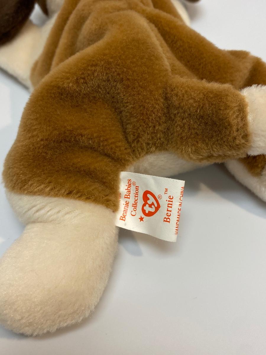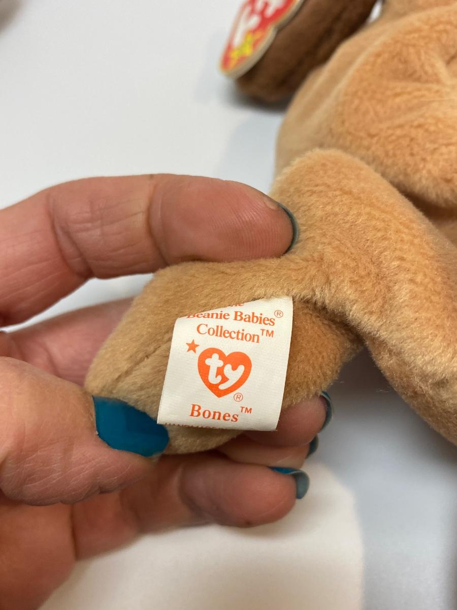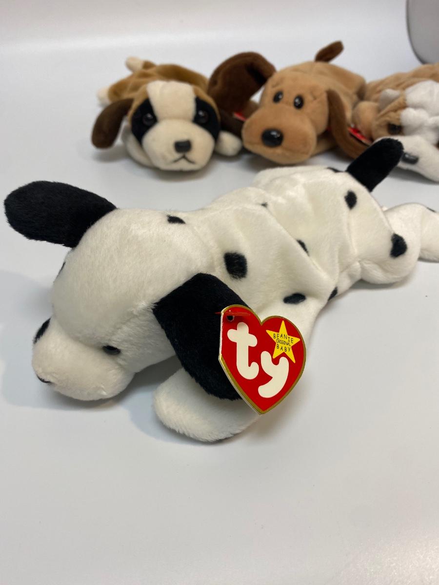 Lot of 5 TY Beanie Baby dog plush animals. One (Wrinkles) is missing original hang tag. Includes Wrinkles, Bones, Bernie, Dotty, and Doby. Good condition.