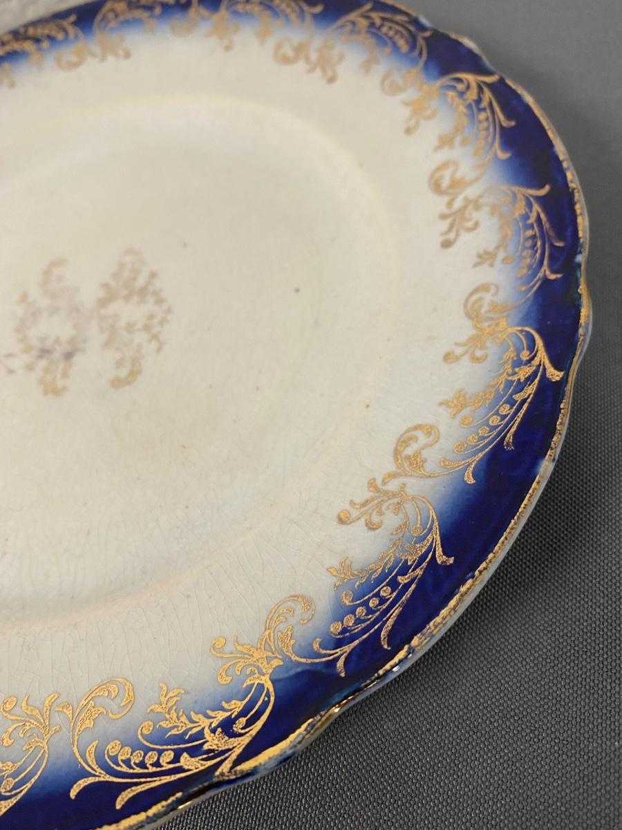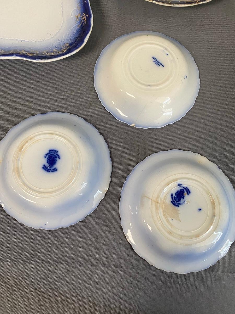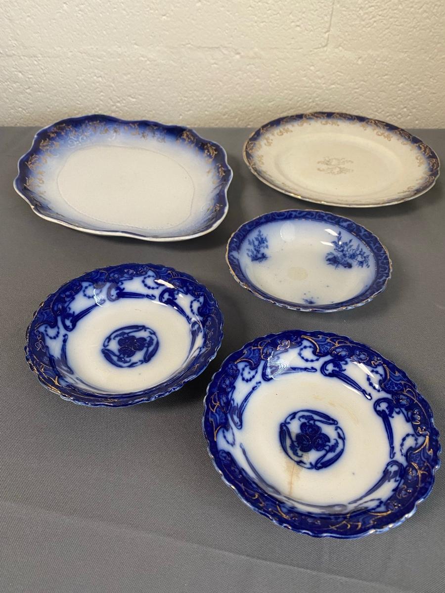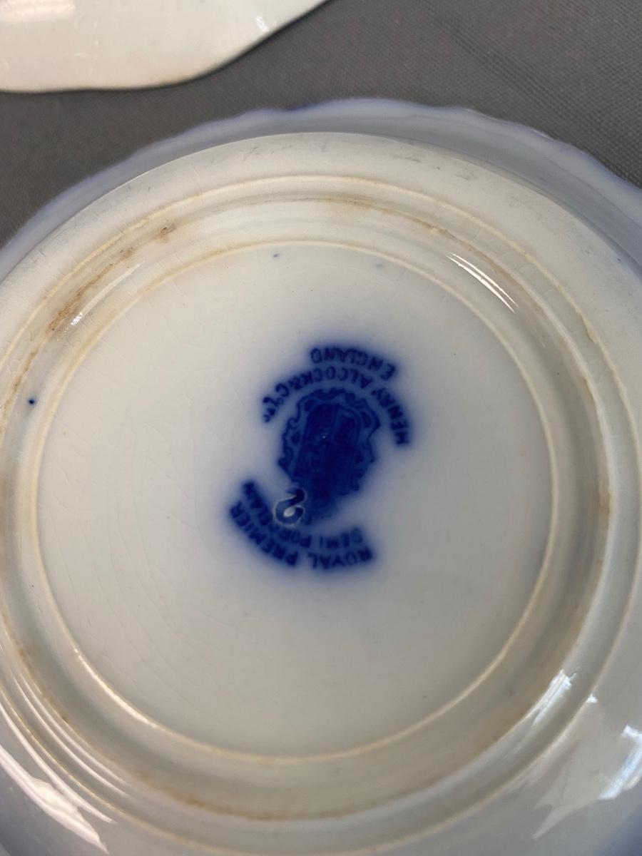 (Lot of 5) Vintage blue and gold Henry Alcock & Co. Royal Premier Semi Porcelain, Made in England, 5.5" Small Dishes & 2 large 12" & 8 5/8" Royal Doulton China Dishes