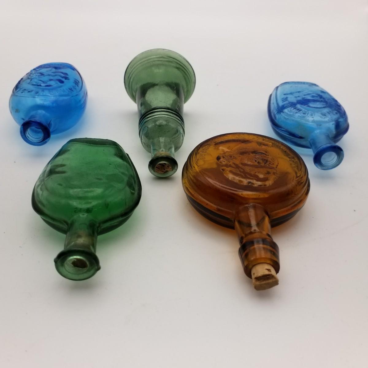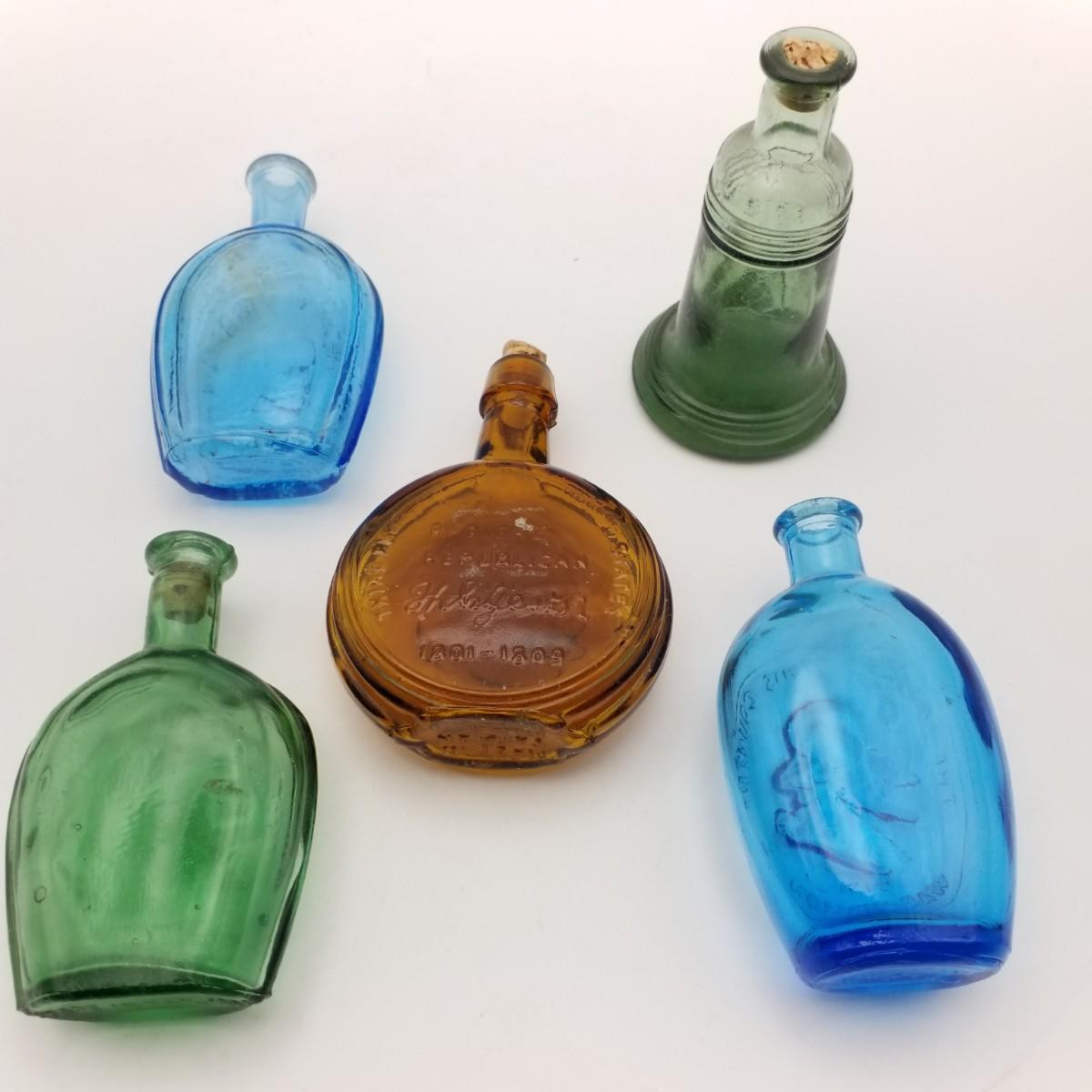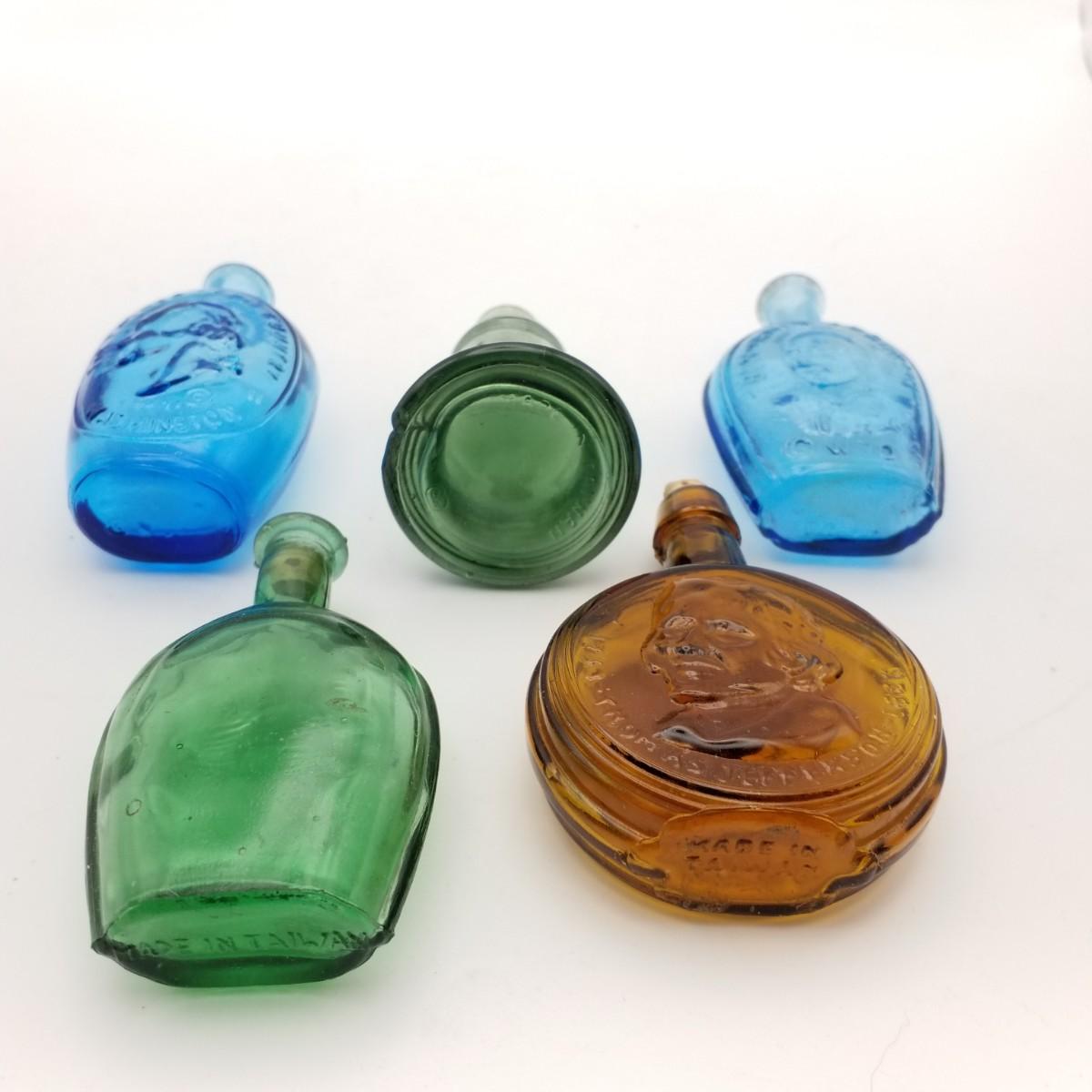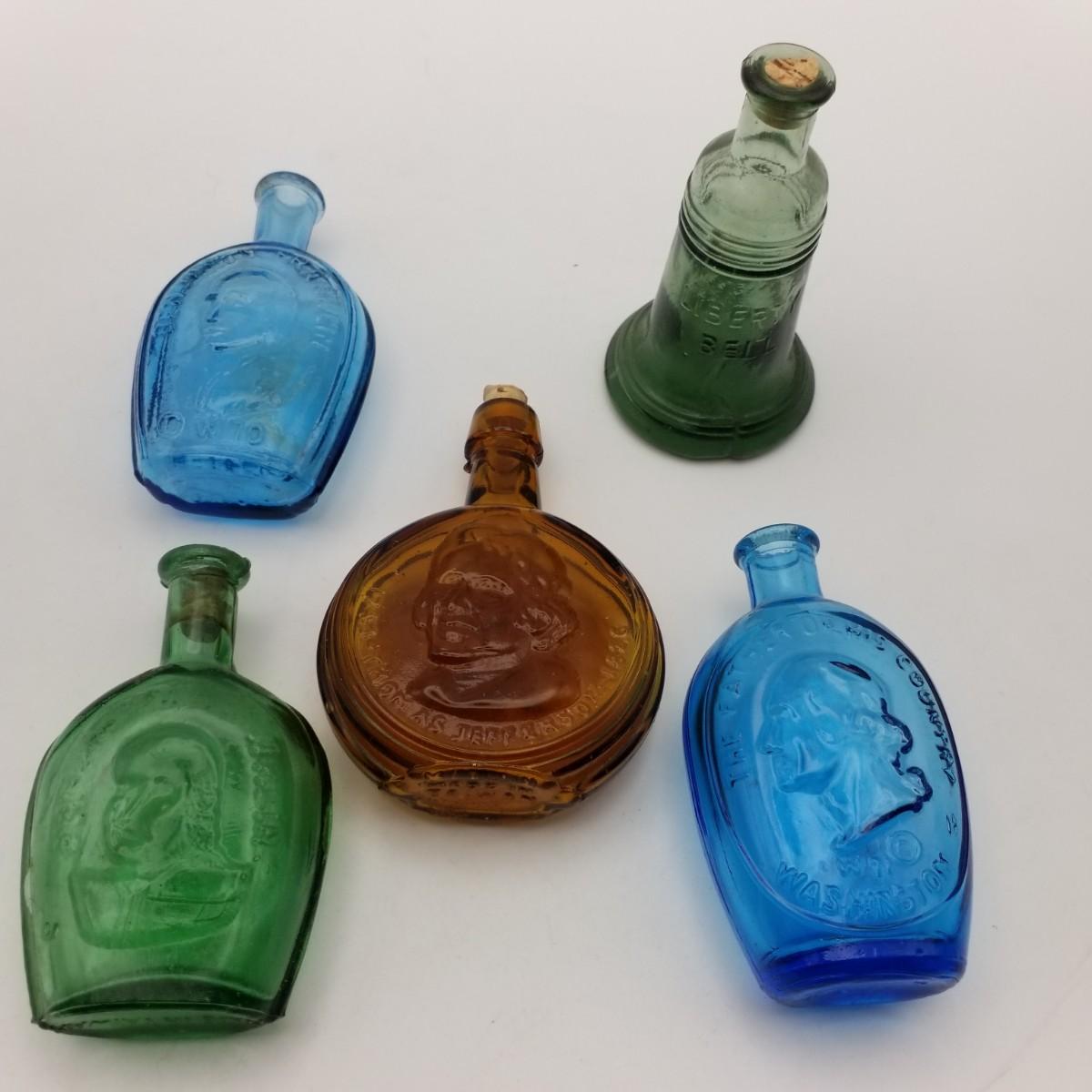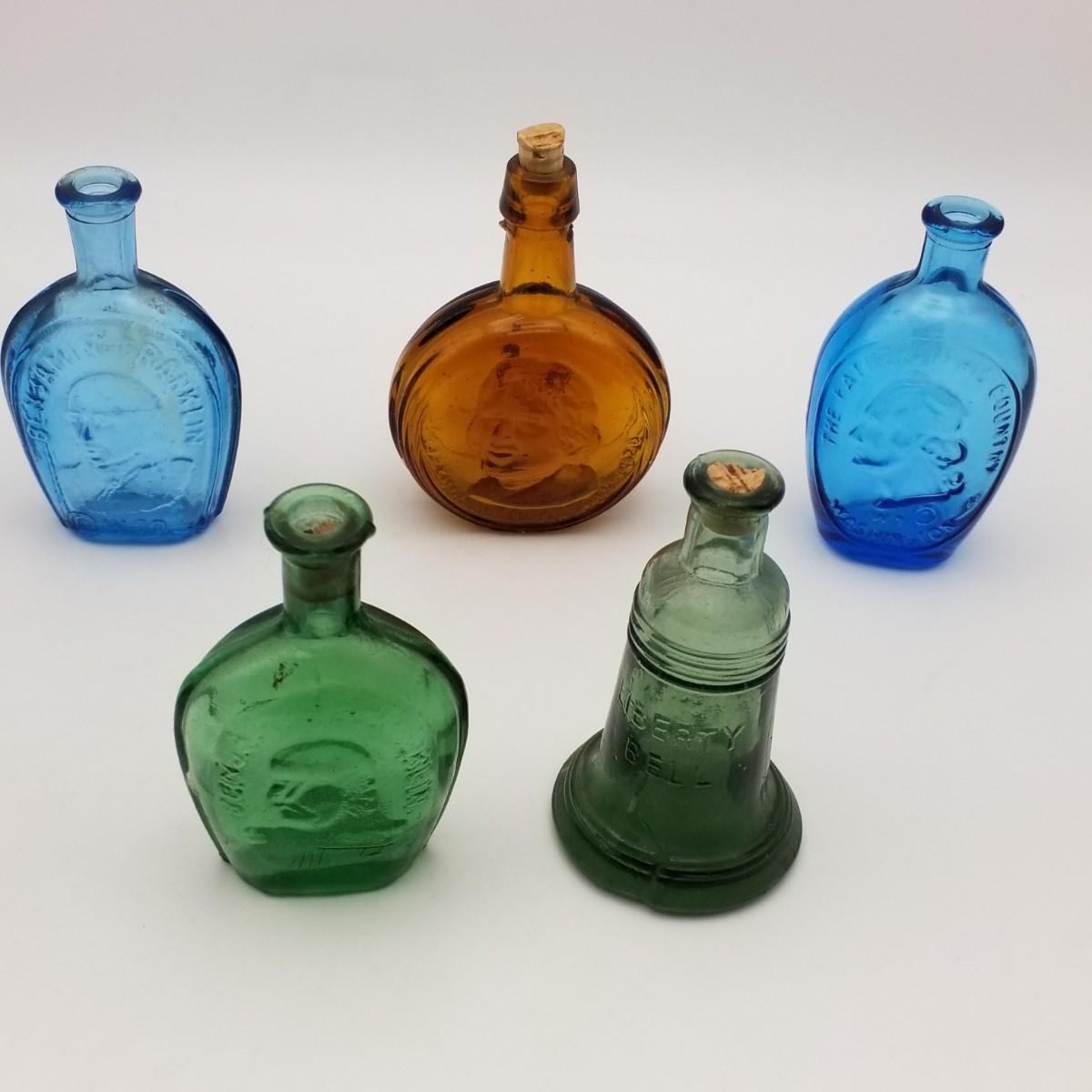 Lot of 5 Vintage Glass Wheaton Industries Liquor Decanter Bottles Franklin Jefferson Washington Librty Bell Amber Blue Green