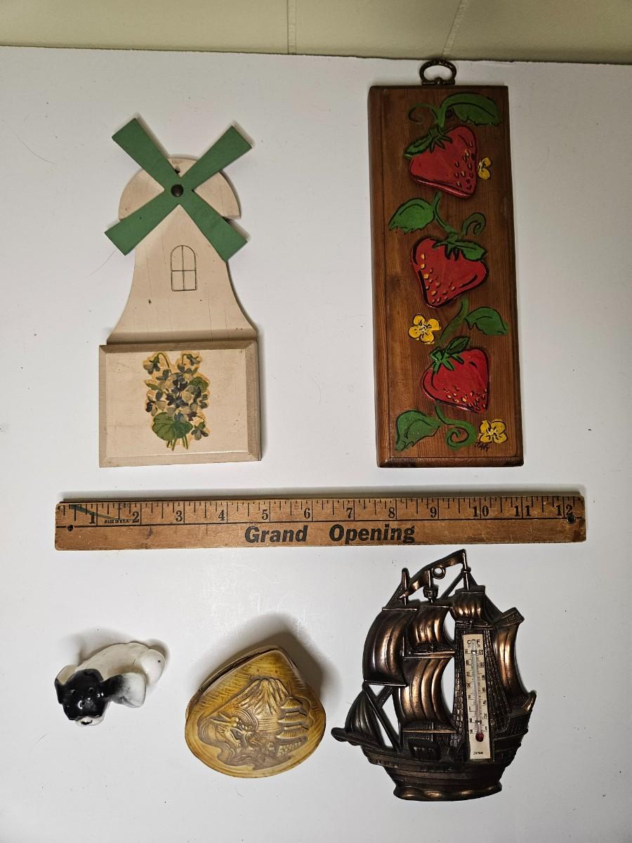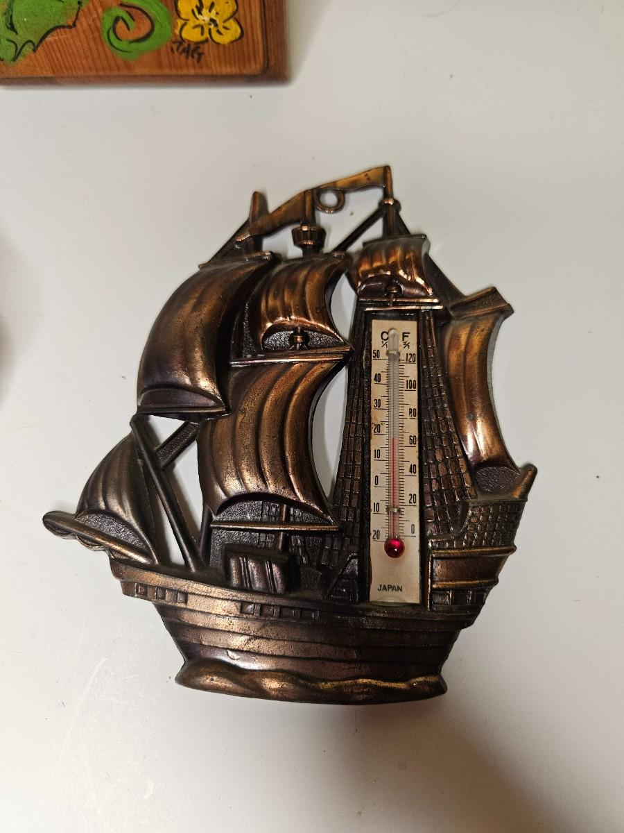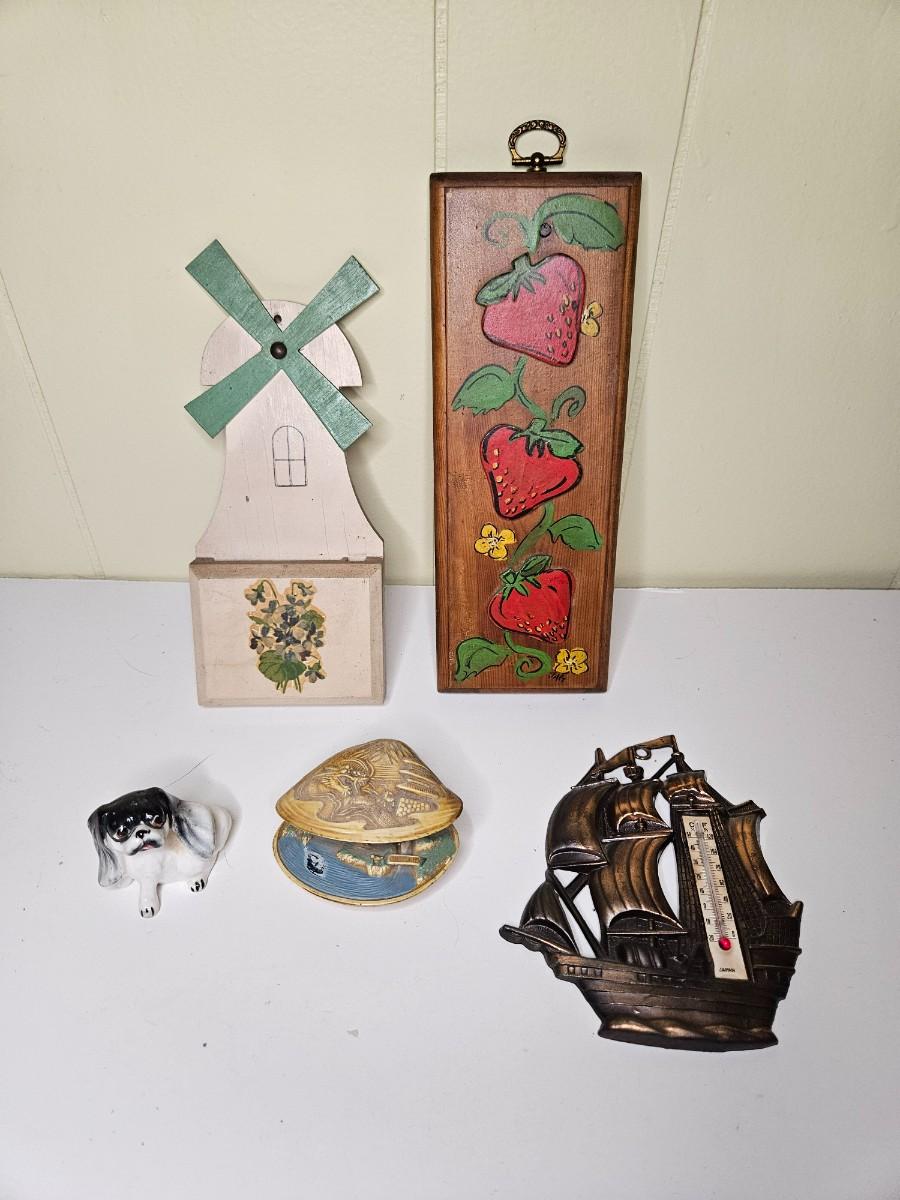 Lot of 5 Vintage Home Decor Including Brass/Copper Type Ship Thermometer