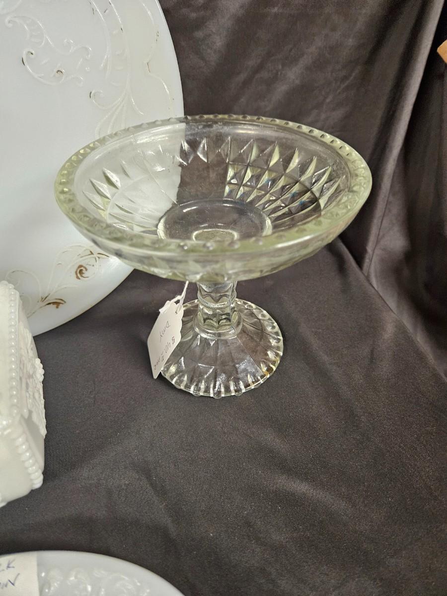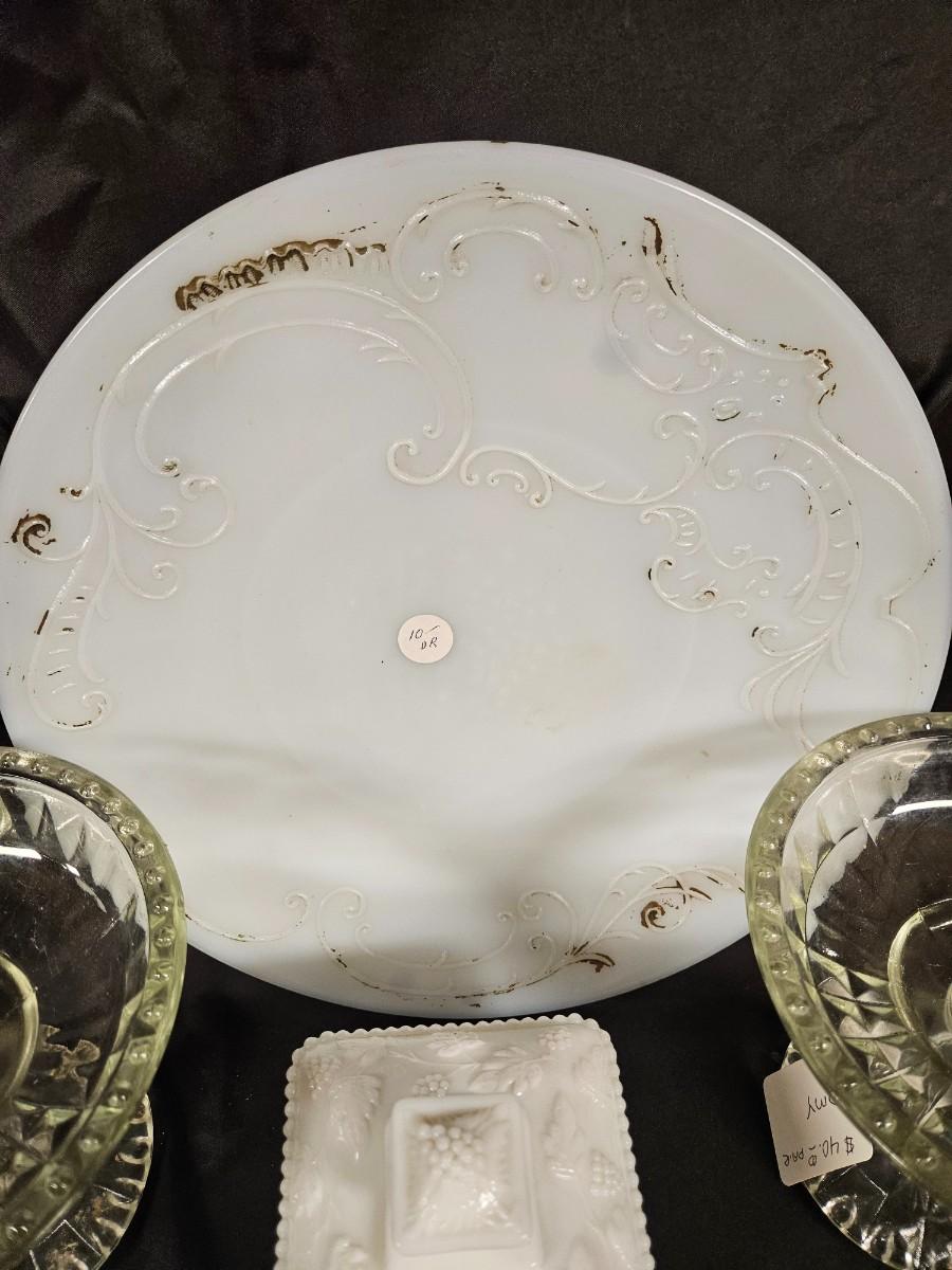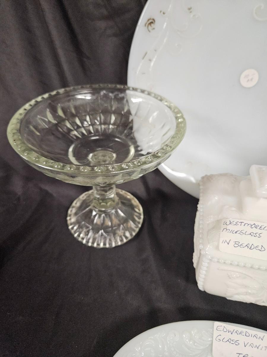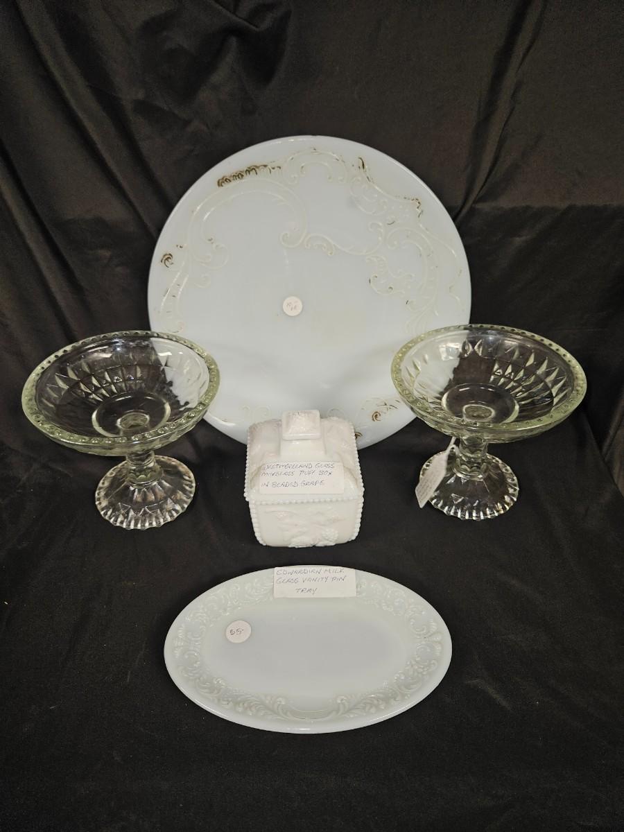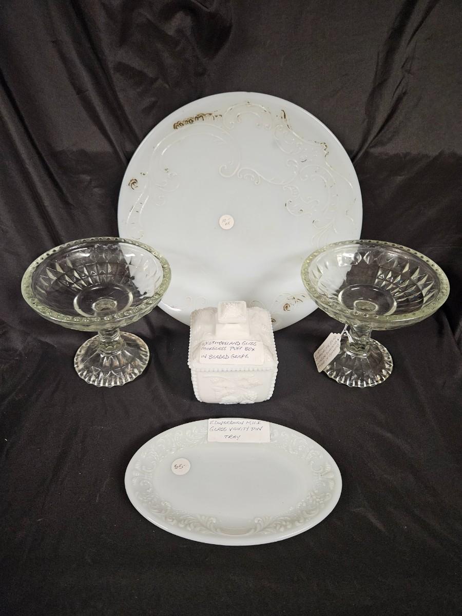 Lot of 5 Vintage Items Including Edwardian Milk Glass, Westmoreland Puff Box and Jeannette Glass Compote