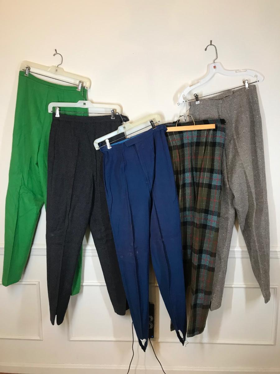 Tweed pair are designer Evan Picone. 1 blue pair of stirrups. In ok to good vintage condition. Some need cleaning or quick mend. Size small. Tags: vintage clothes, vintage clothing,