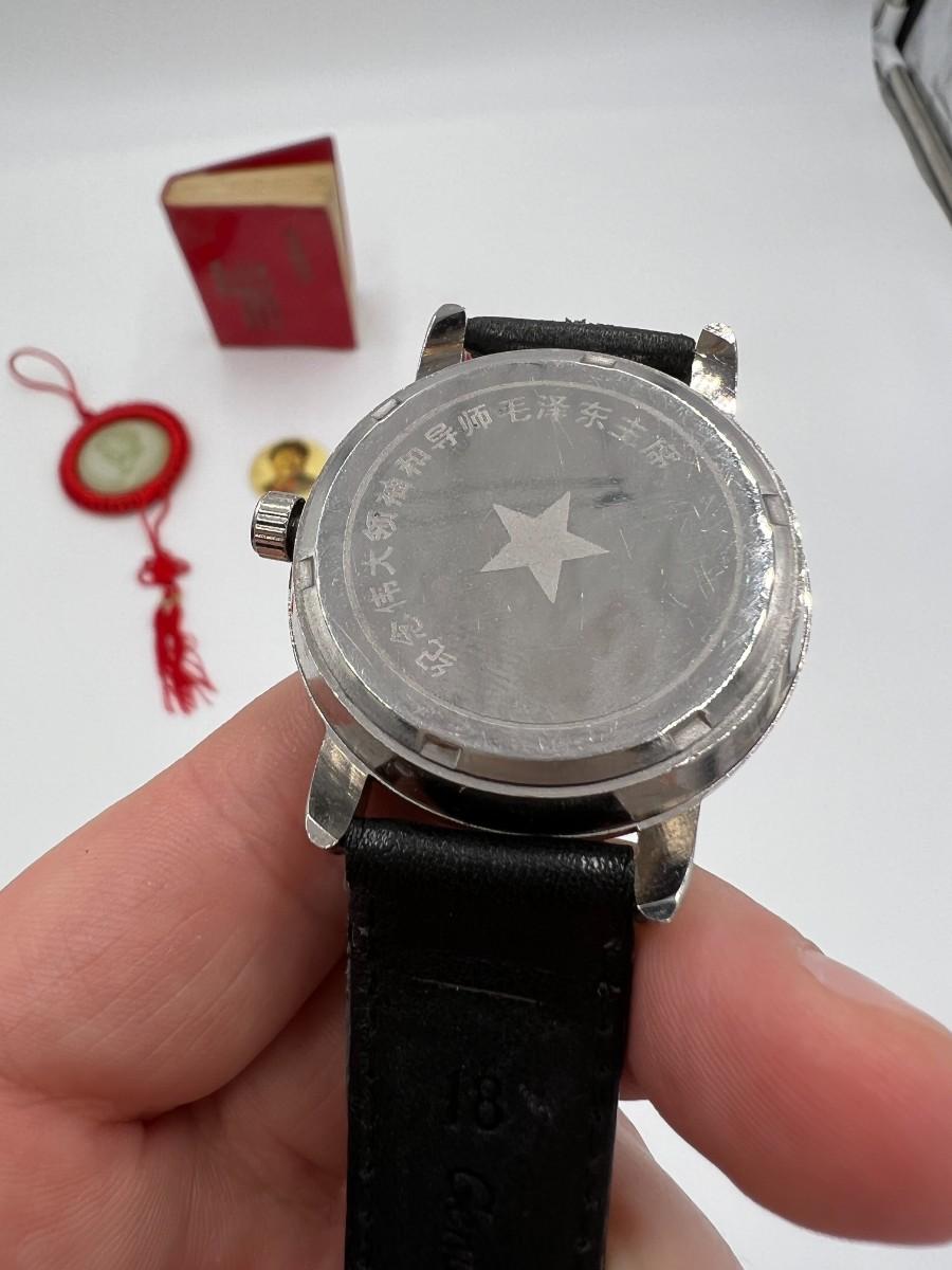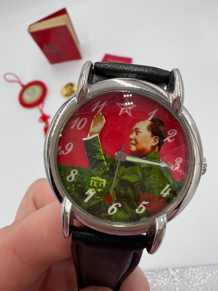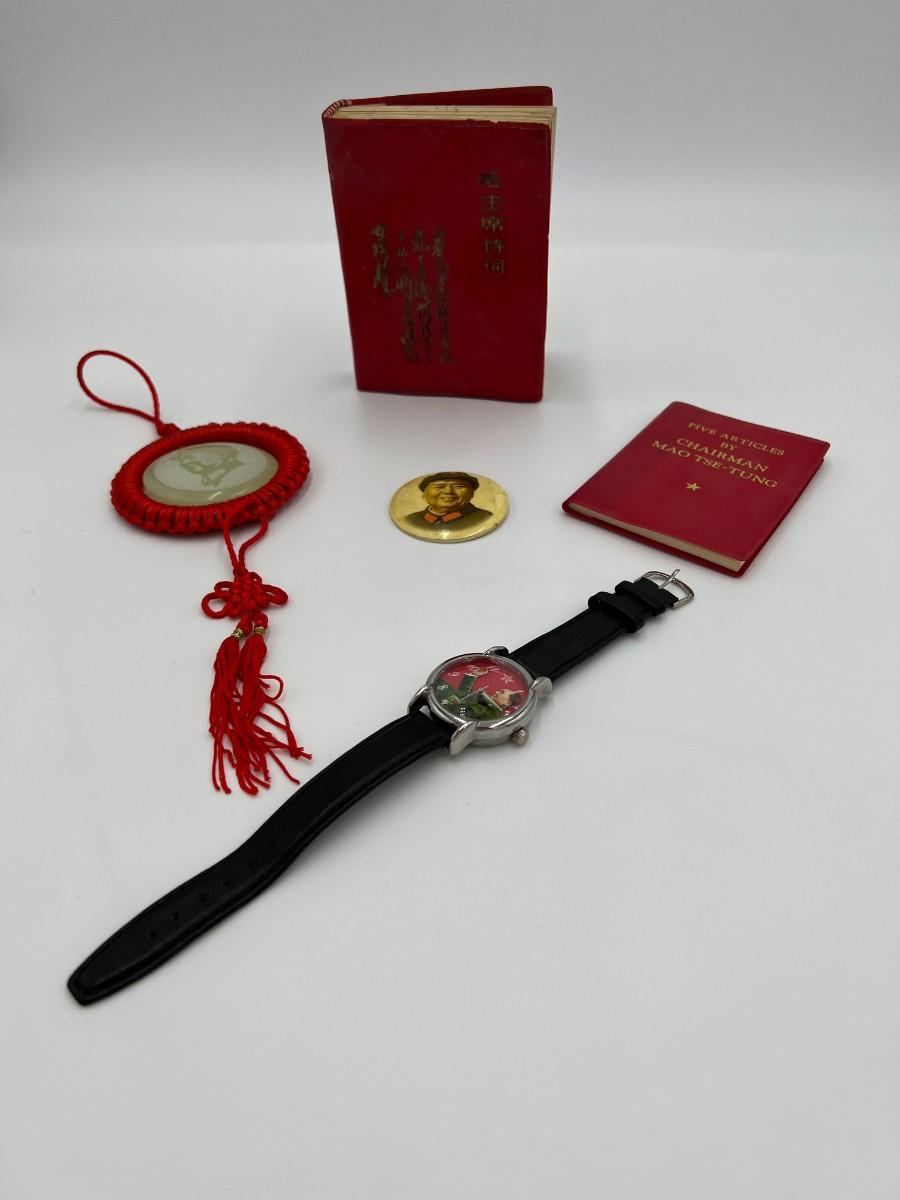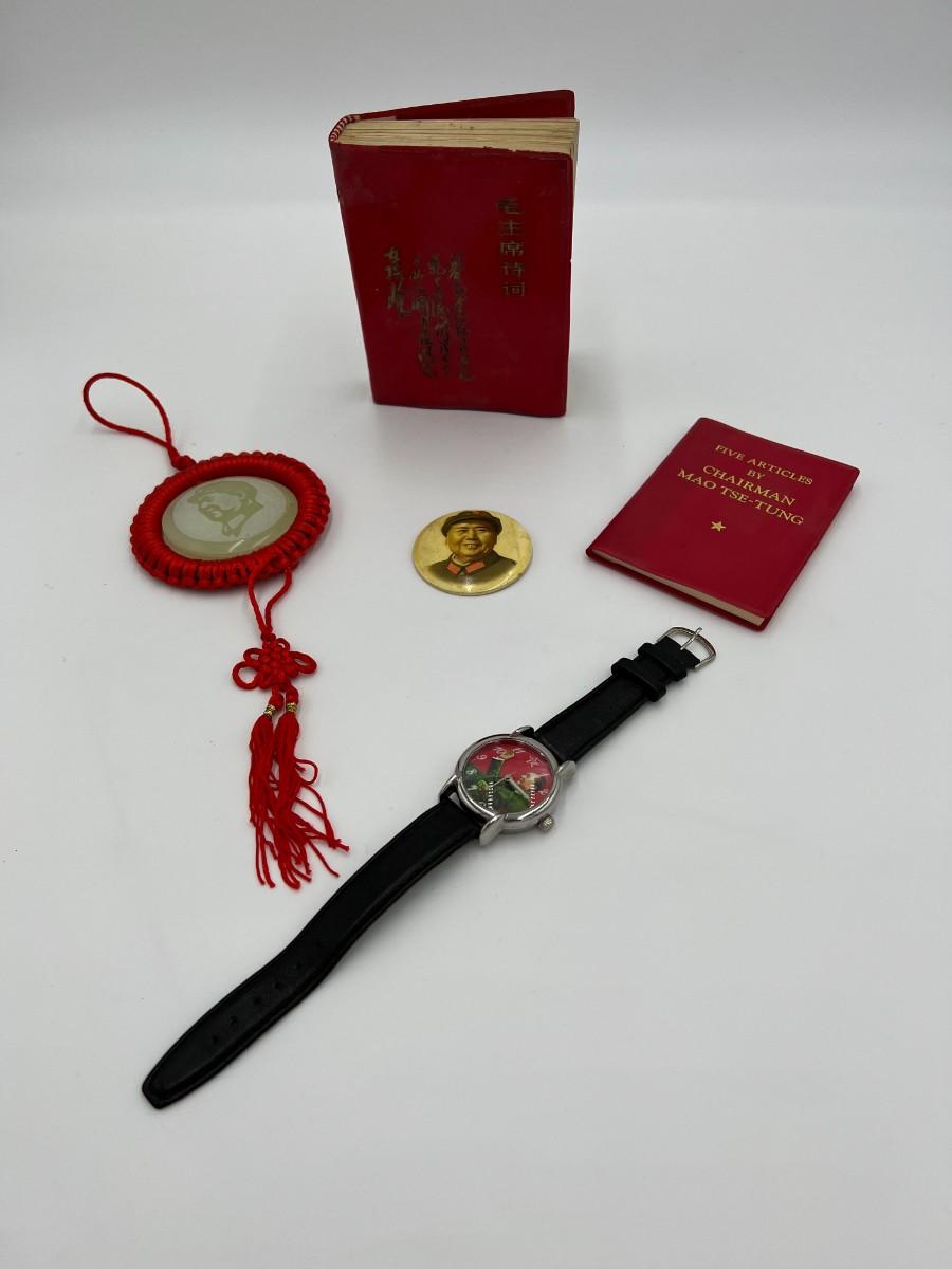 Lot of 5 Vintage Mao Tse Tung Memorabilia and Collectibles. Includes a mechanical wind up watch (in working order), small book, 1966 Red Book, glass keepsake ornament, and button. Condition as shown.