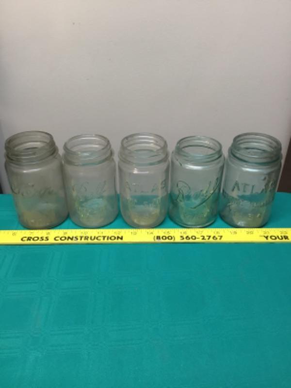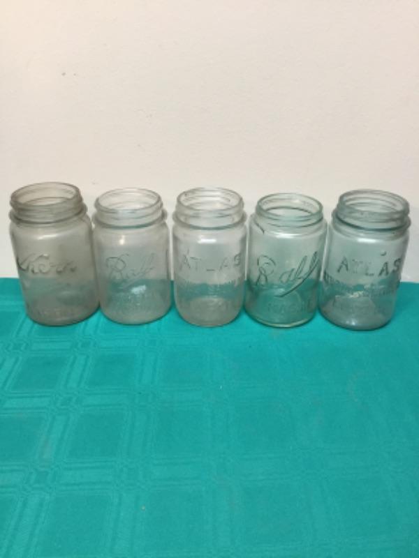 Lot of five vintage mason jars. Makes include: Atlas, Ball, and Kerr. Good condition antique glass as there are no cracks, holes, or chips on 4 of the jars. Blue Kerr has an internal line crack on the top and one Kerr has 2 tiny chips on the rim.