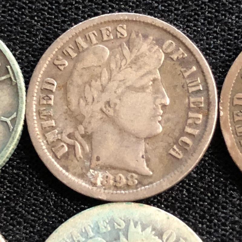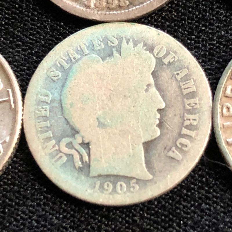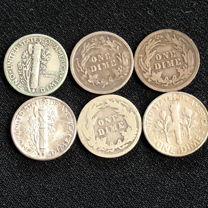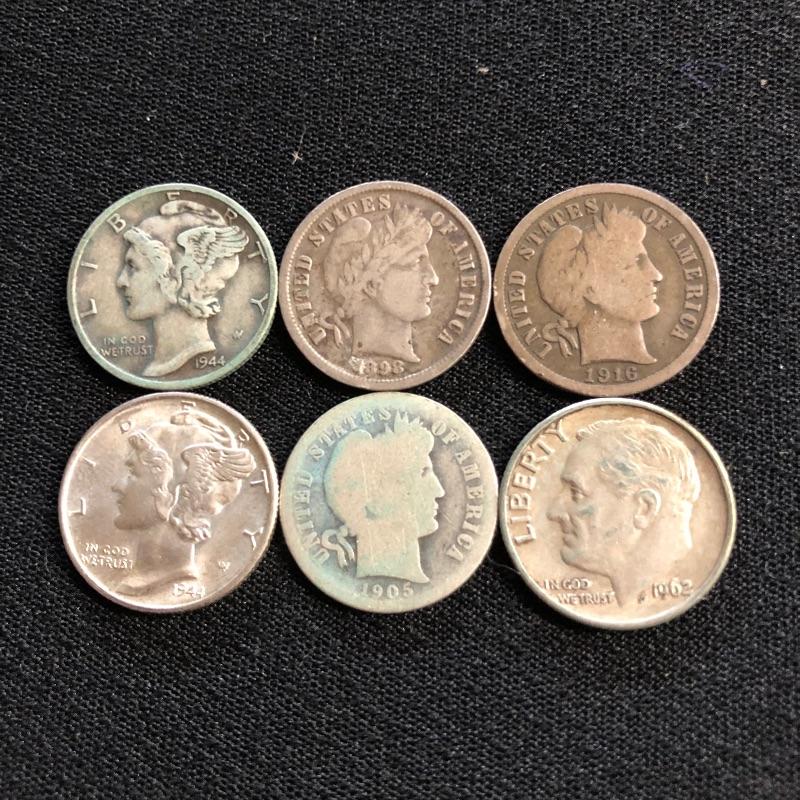 Lot of 6 90% Silver Dimes - Barber Mercury Roosevelt 1898 1905 1916 1944 1962