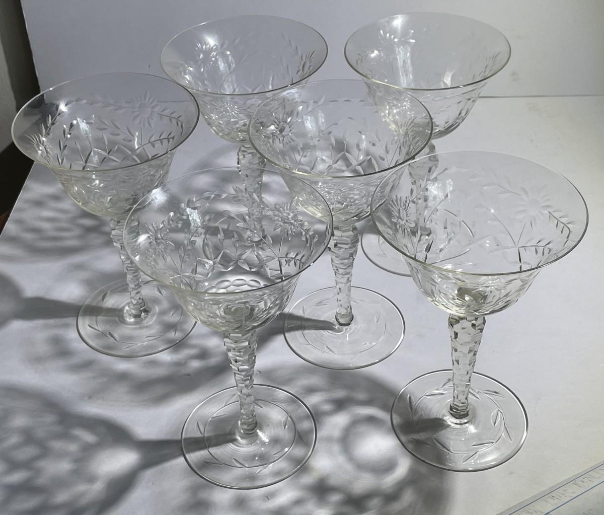 Lot of 6 Antique Early Stemware Etched Design Glasses 5-7/8" Tall in VG Preowned Condition.