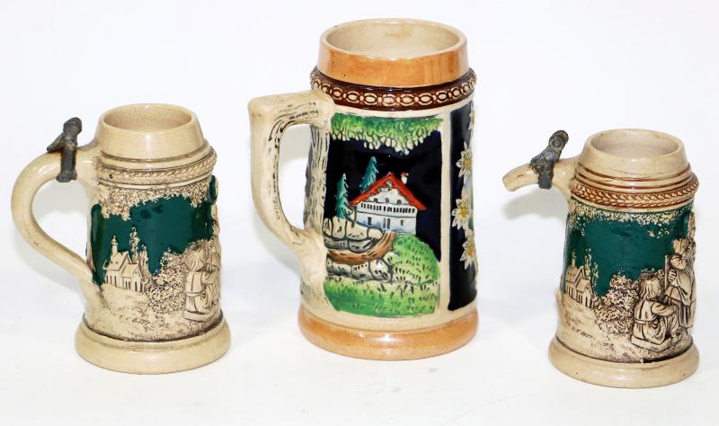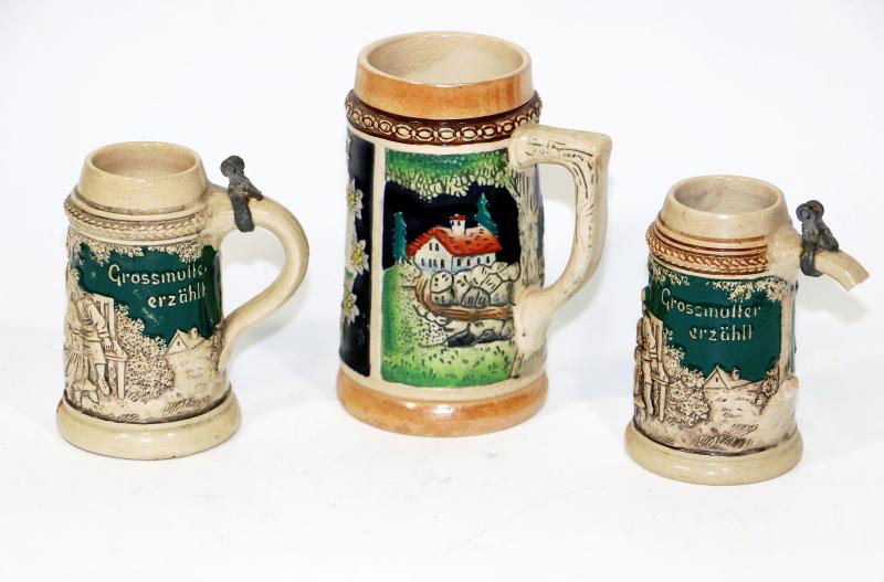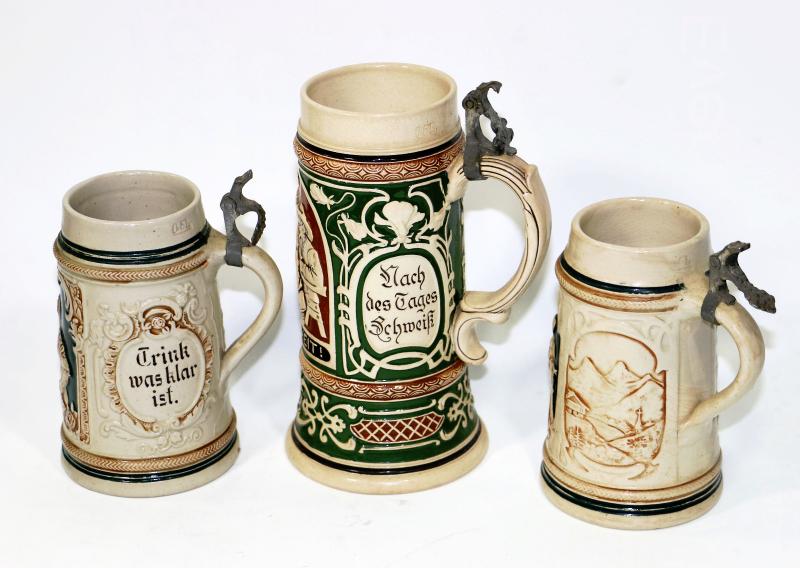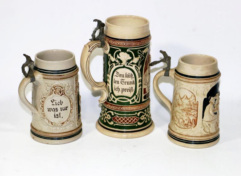You will get all 6 steins seen on pictures, these are all old antique German Steins however they have some condition issues, all have missing lids, offered with no reserve, as seen on pictures.