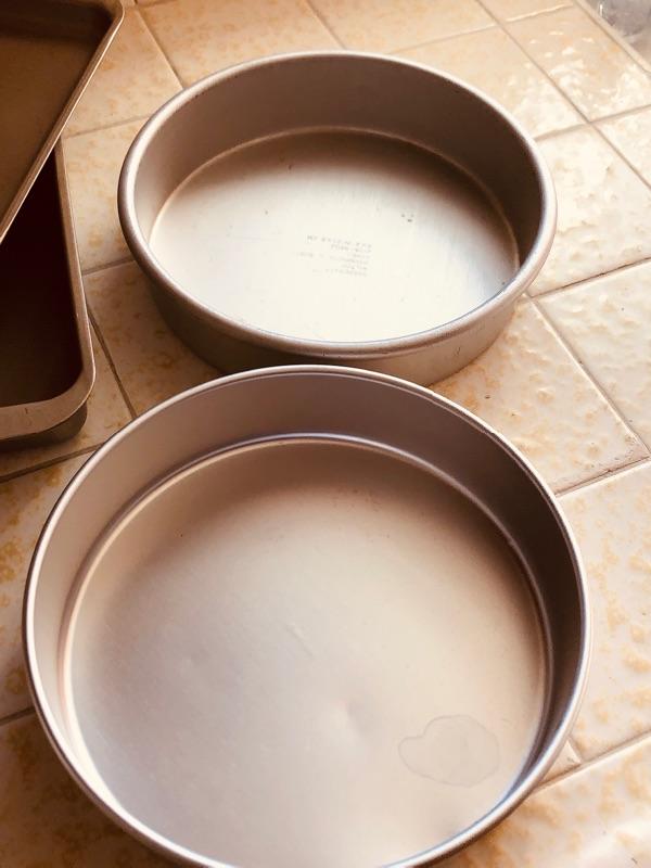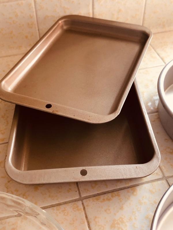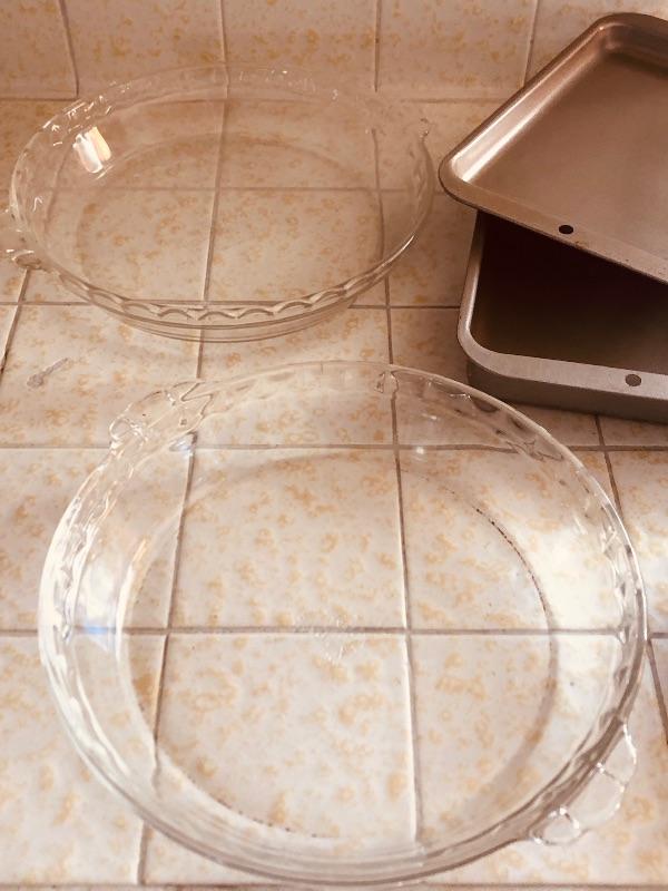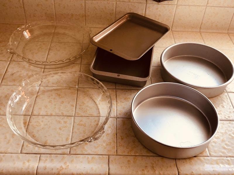 Lot of 6 baking dishes and pans. Includes 2 pie plates, 2 round cake pans, a cookie sheet, and a square metal pan. Good condition.