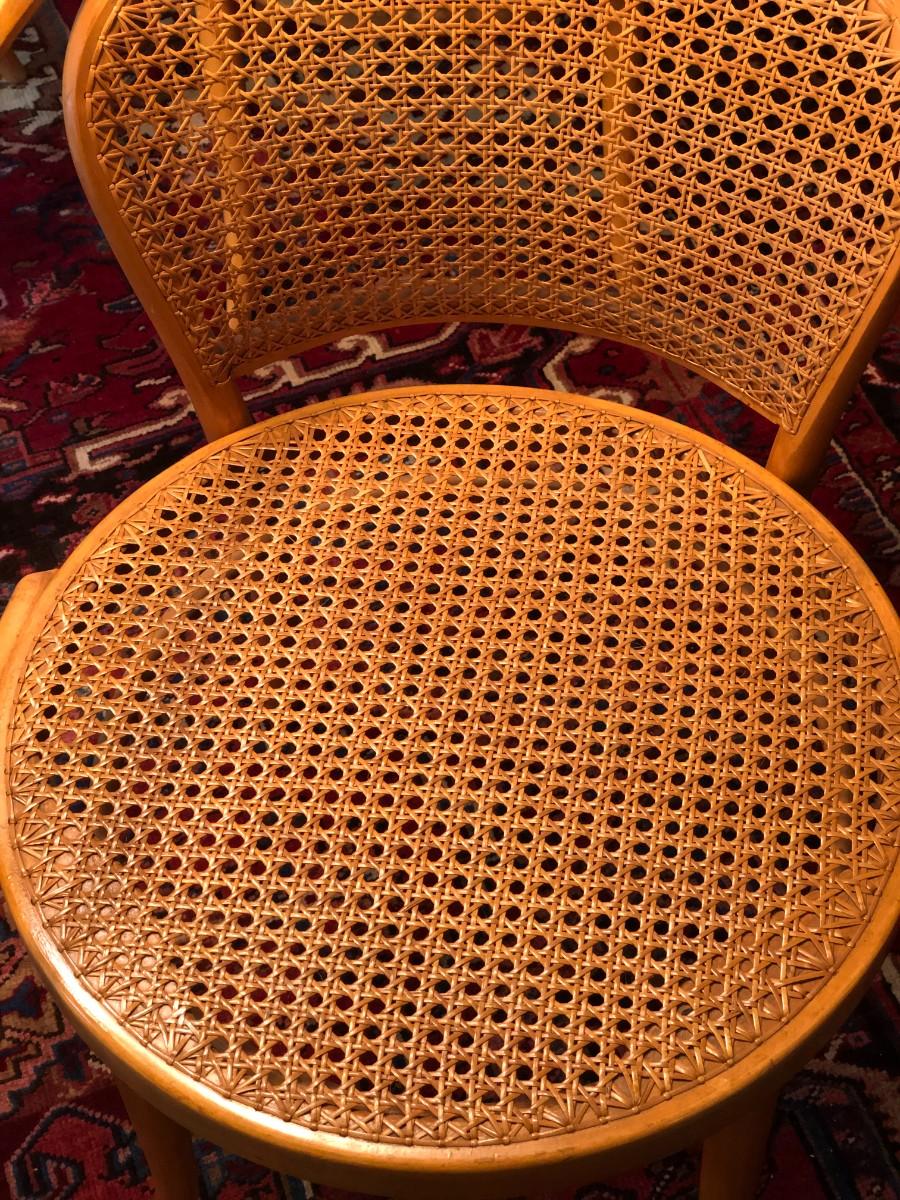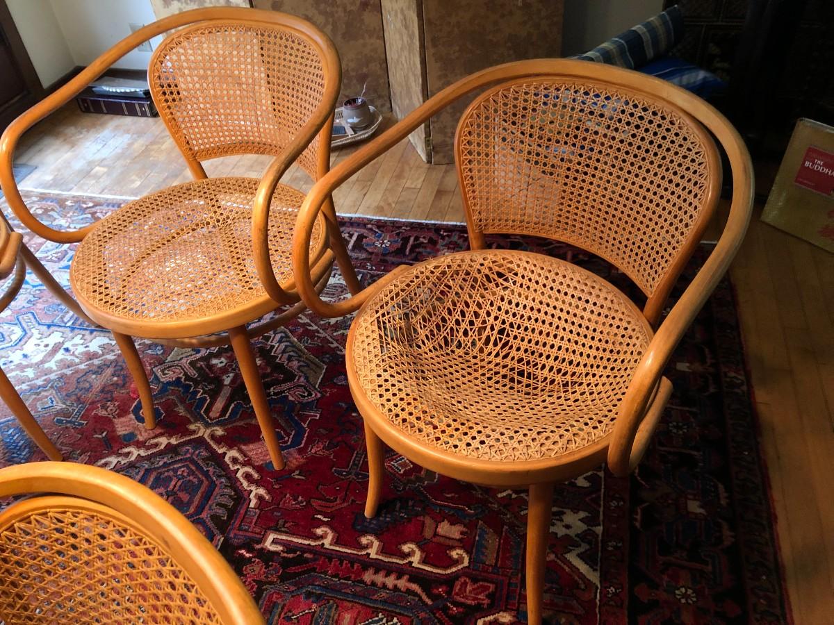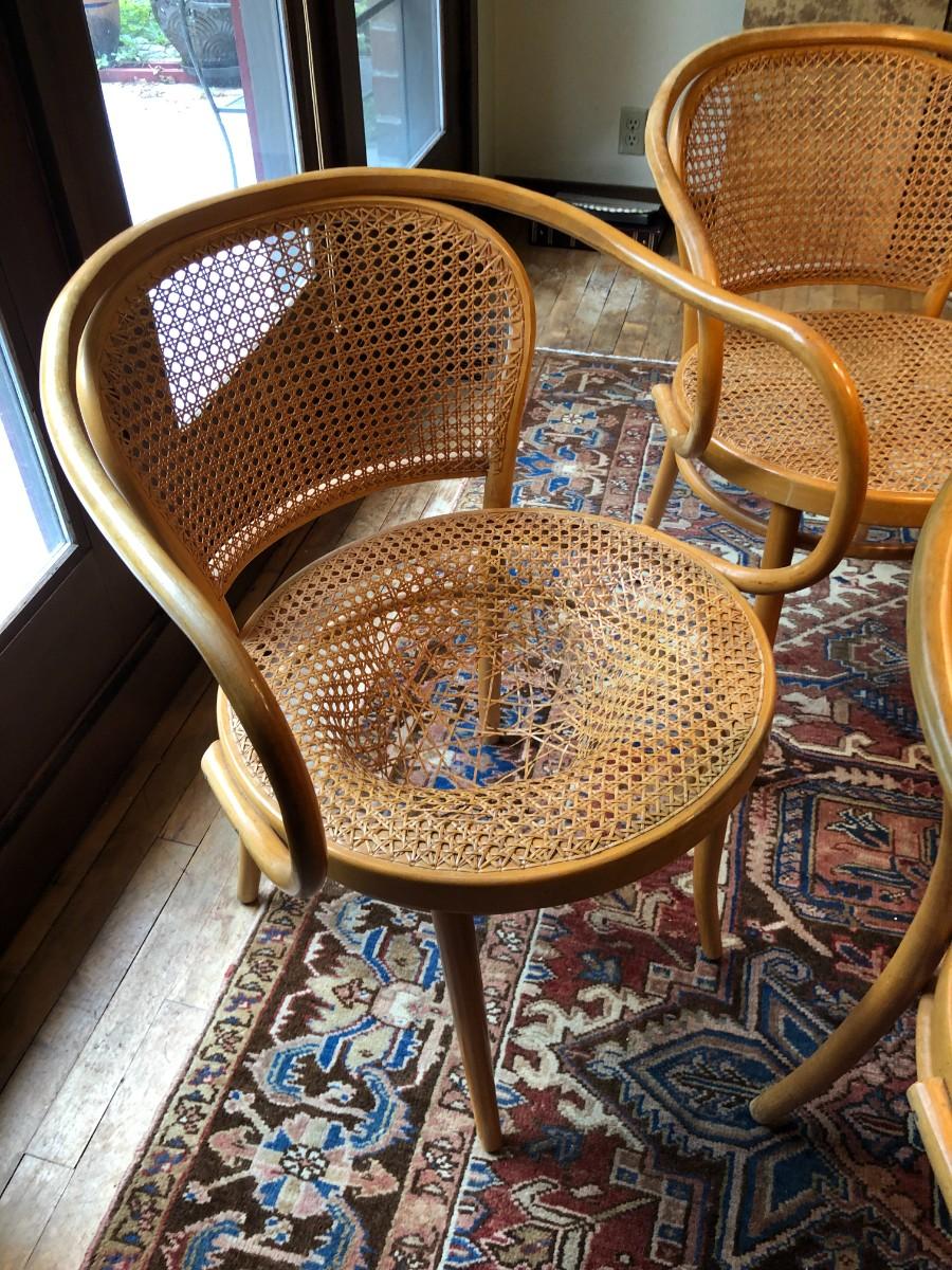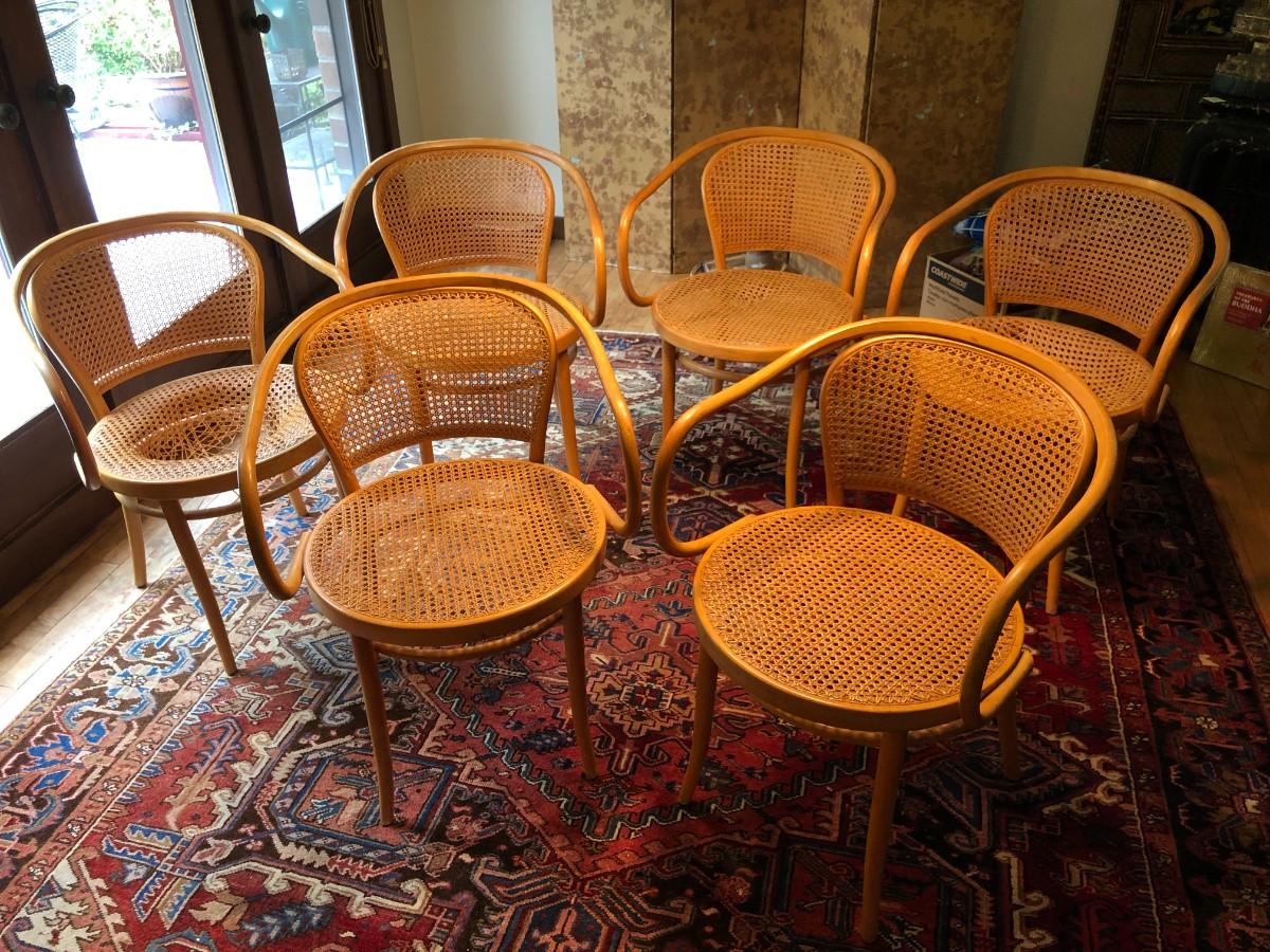 Beautiful set of 6 bentwood chairs in a blonde stain color. Vintage mid century modern. chairs made in Czechoslovakia. Generally in good condition, though several of the cane seats need to be repaired/replaced.