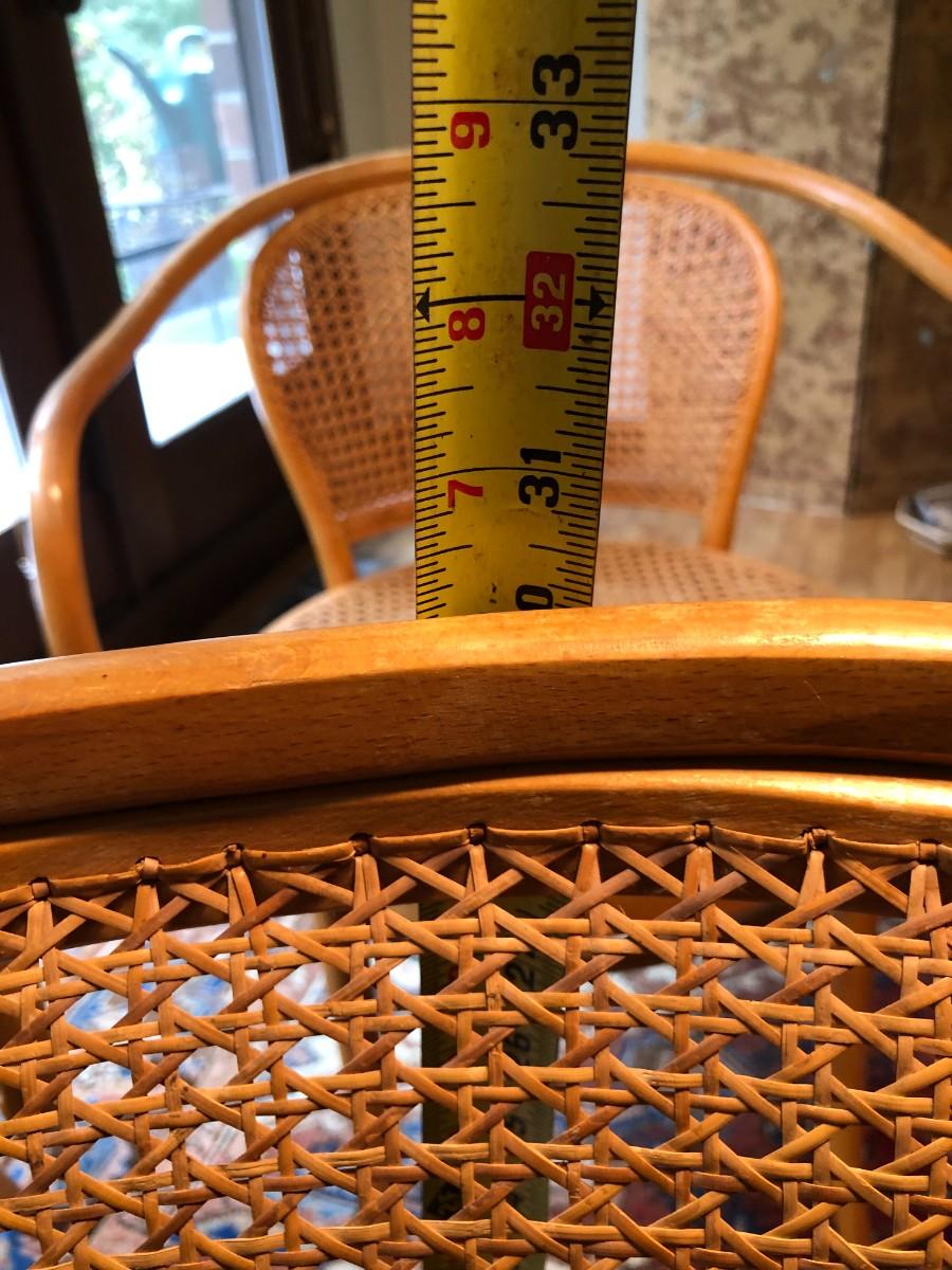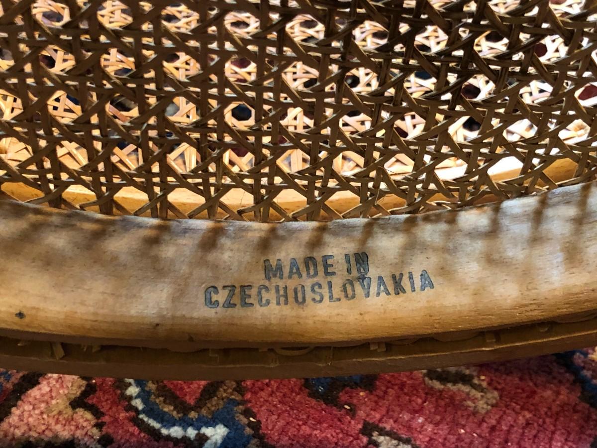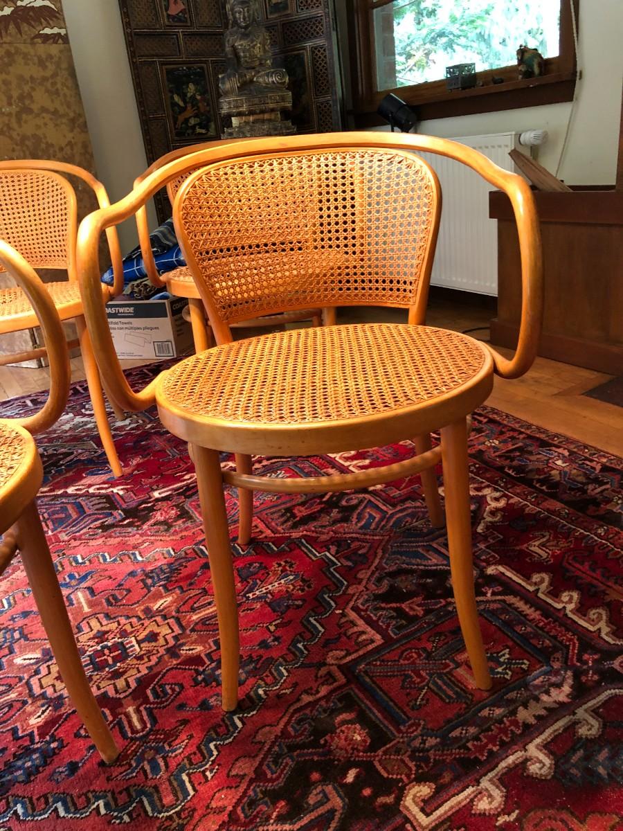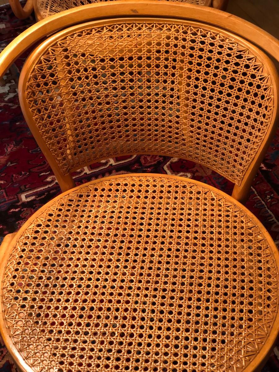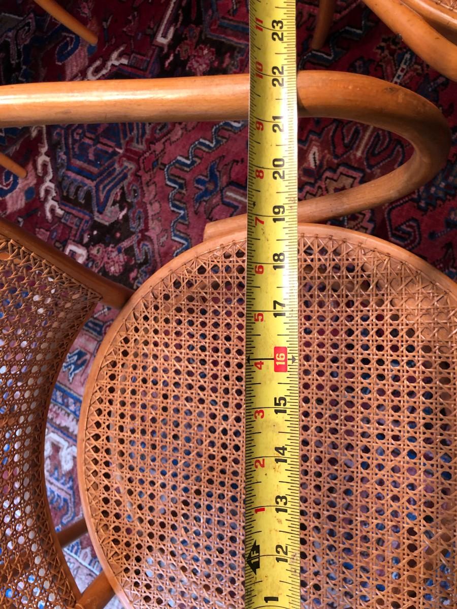 Beautiful set of 6 bentwood chairs in a blonde stain color. Vintage mid century modern. chairs made in Czechoslovakia. Generally in good condition, though several of the cane seats need to be repaired/replaced.