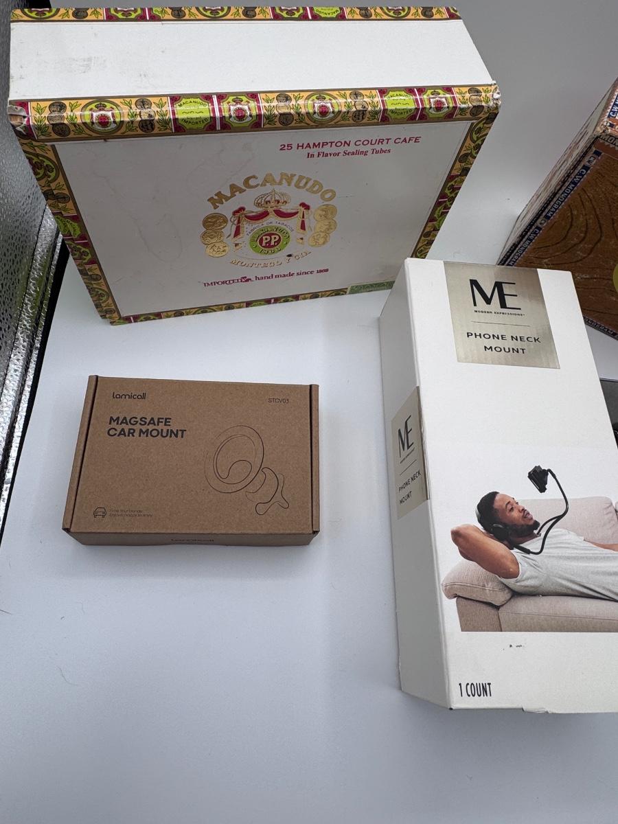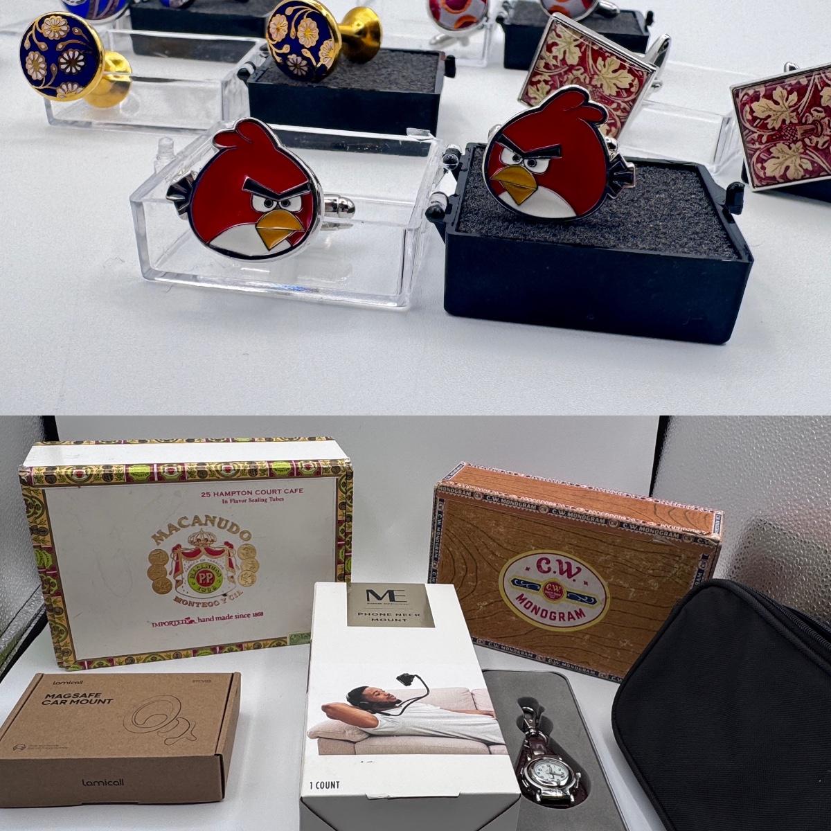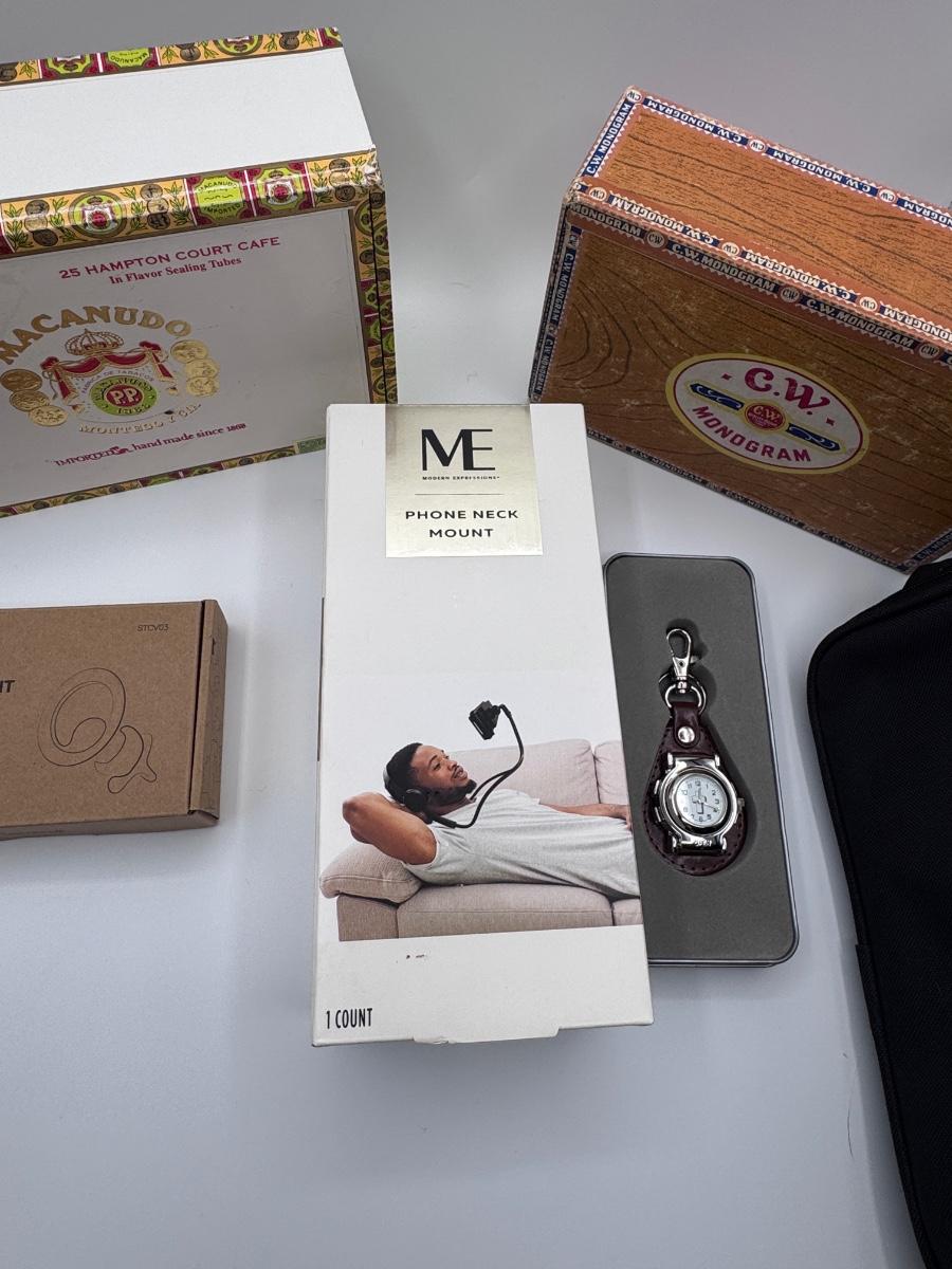 Men’s accessories: Cufflinks, cigar boxes, toiletry bag, watch, phone mount