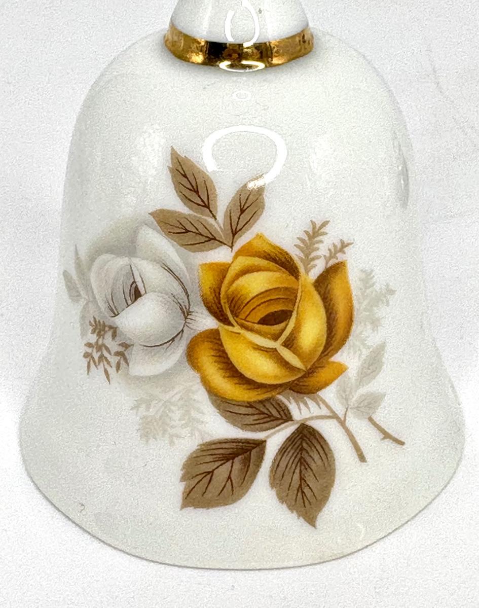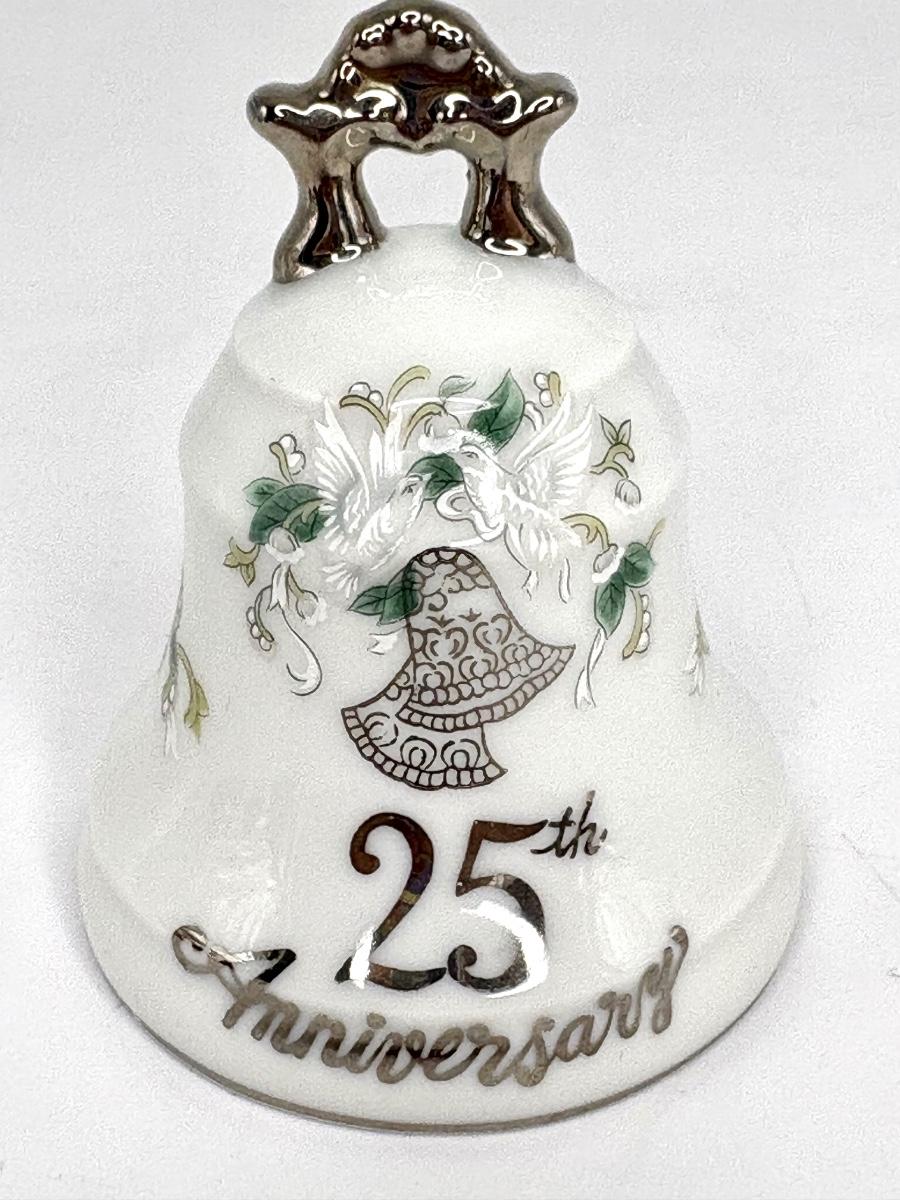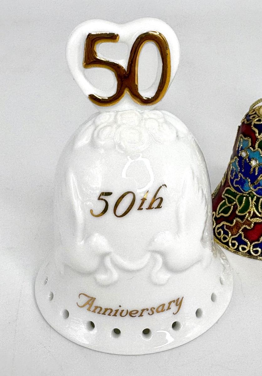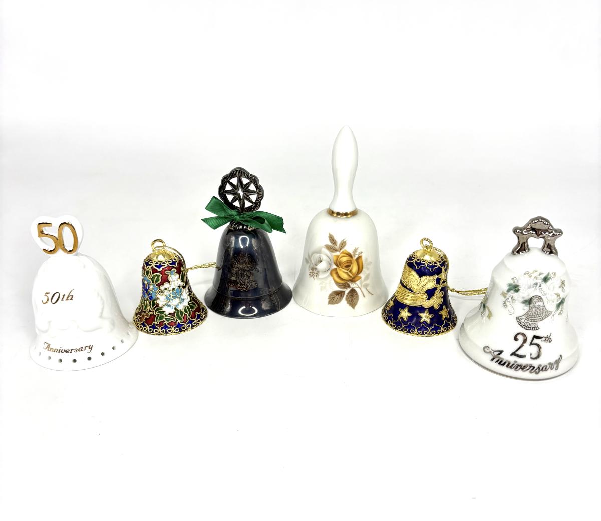 The 50th Anniversary Bell is 3-3/8” tall x 2-3/8 diameter. The red bell and blue bell is 2-1/4” tall x 1-7/8” diameter. The rose bell is 4-3/4” tall x 2-1/2” diameter. Music box bell is 3-5/8 tall x 2-3/4” diameter. 25th anniversary bell is 3-7/8 tall x 2-5/8 diameter.