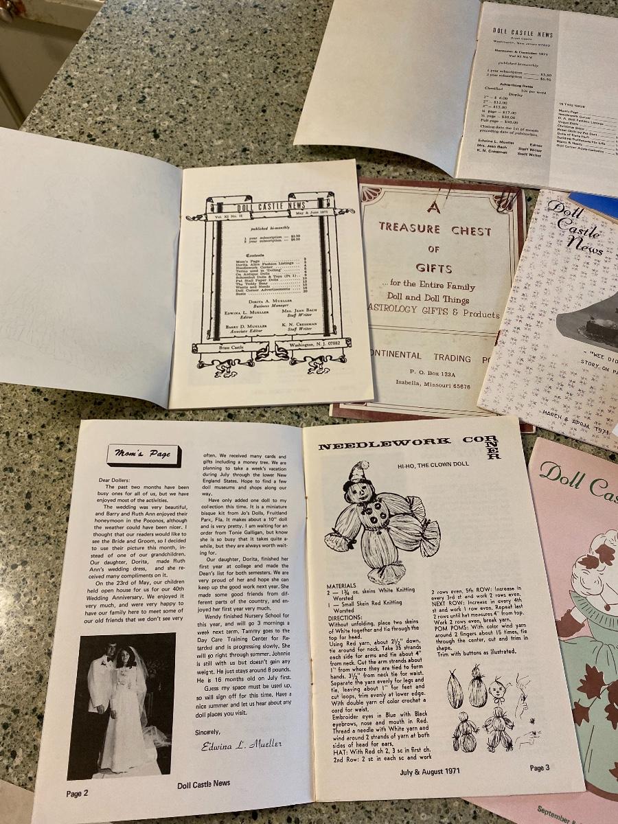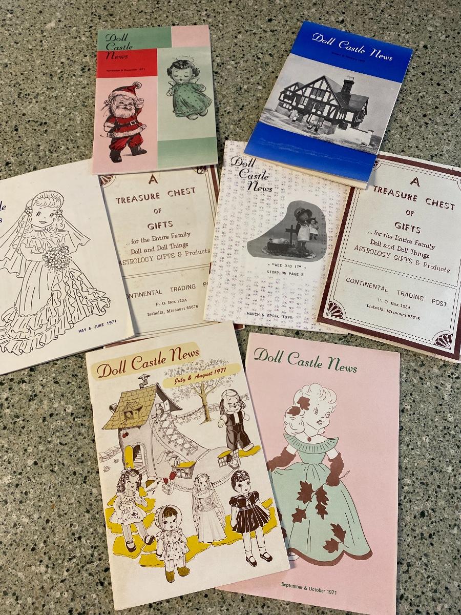 Lot of 6 Doll Castle News Brass Castle, New Jersey 1971 and 1972. Also 2 publications of doll catalogs- A Treasure Chest of Gifts- Continental Trading Post, Isabella, Missouri.