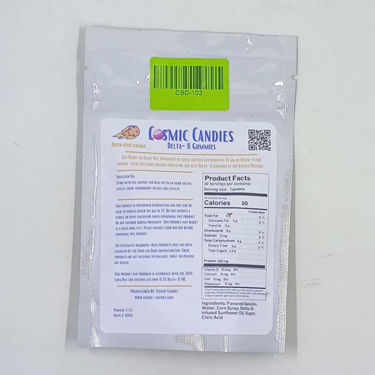 This auction is for a lot of 6 individual packages of Cosmic Candies Outer Space Orange Delta-8 Gummies. Each package contains 10 gummies. Each gummy contains 20 mg Delta-8.
