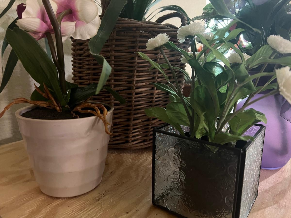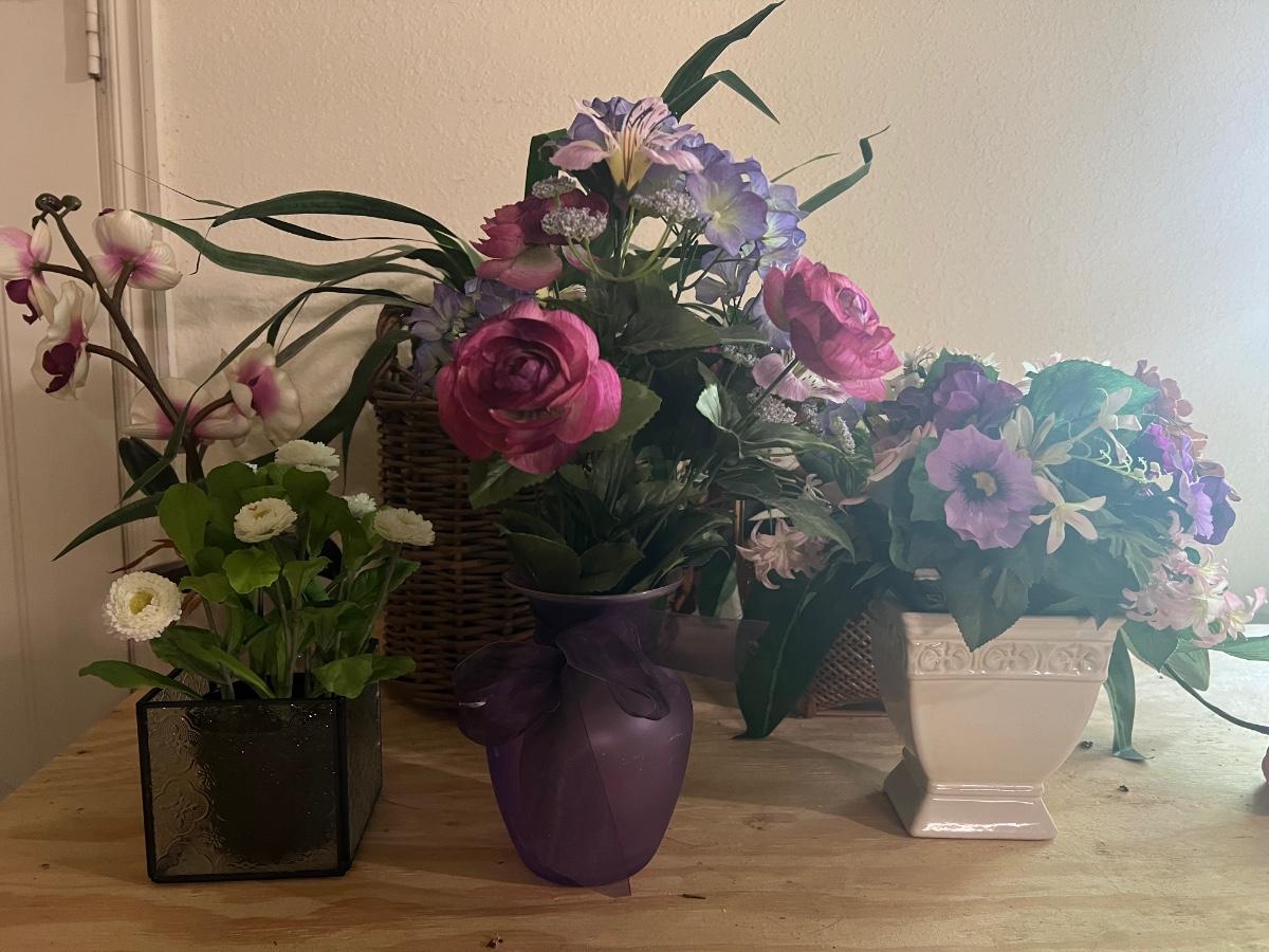 Variety of faux flowers and plants in baskets, vases, or pots.