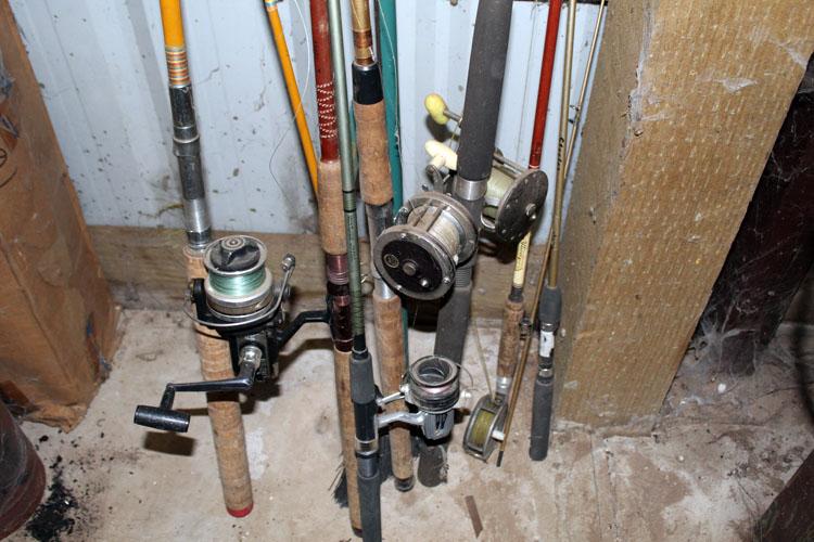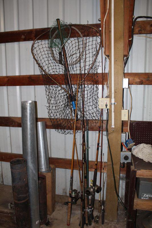 Lot of 6 fiberglass fishing rods, 5 reels, and 2 nets (#250a)