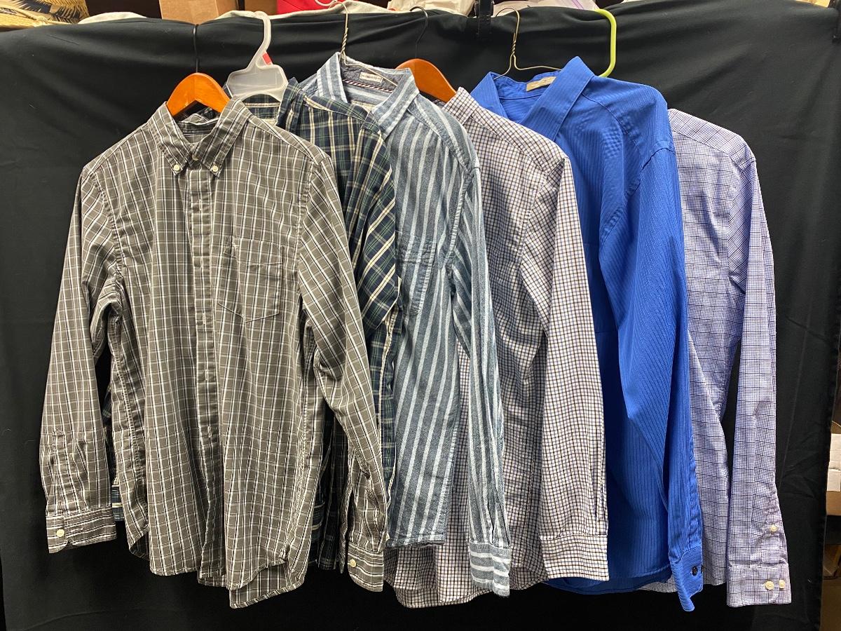 Lot of 6 men's button front long sleeve business casual dress shirts. Size medium/large, may be slim fit. Good previously worn condition, did not notice any holes or stains. Brands included Dockers, Chaps, Goodfellow, PD&C, & Van Heusen.