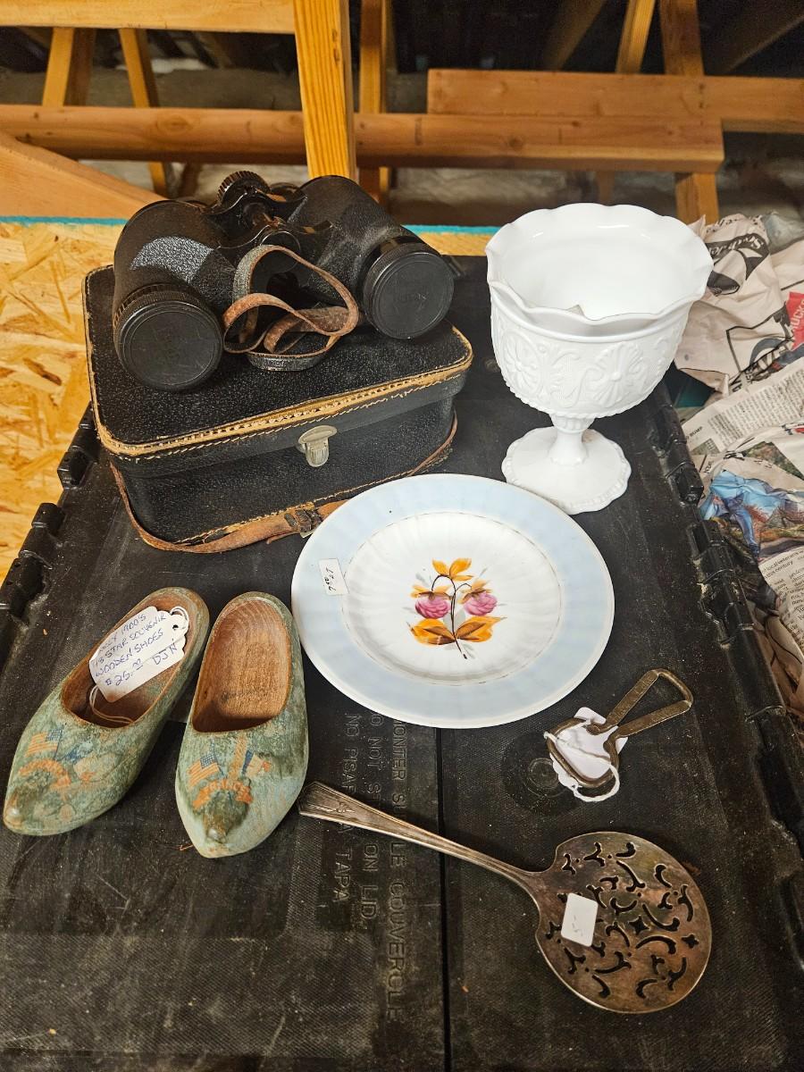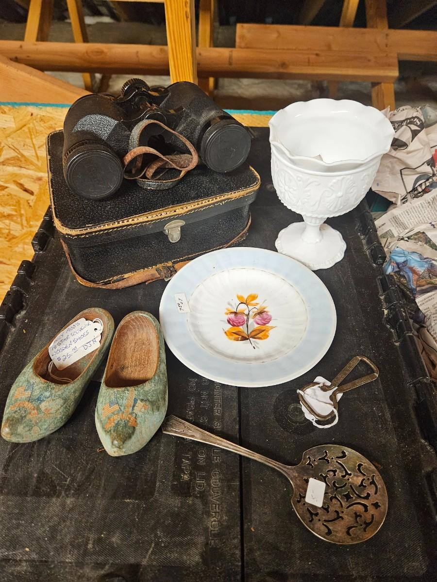 Lot of 6 Misc Vintage Items Including Wooden Clogs, Binoculars, Milk Glass Compote and More