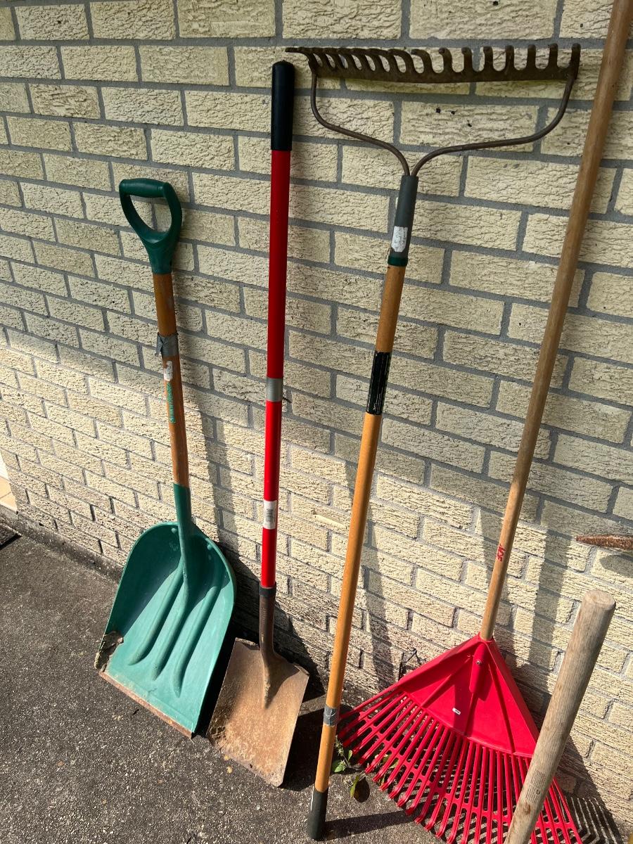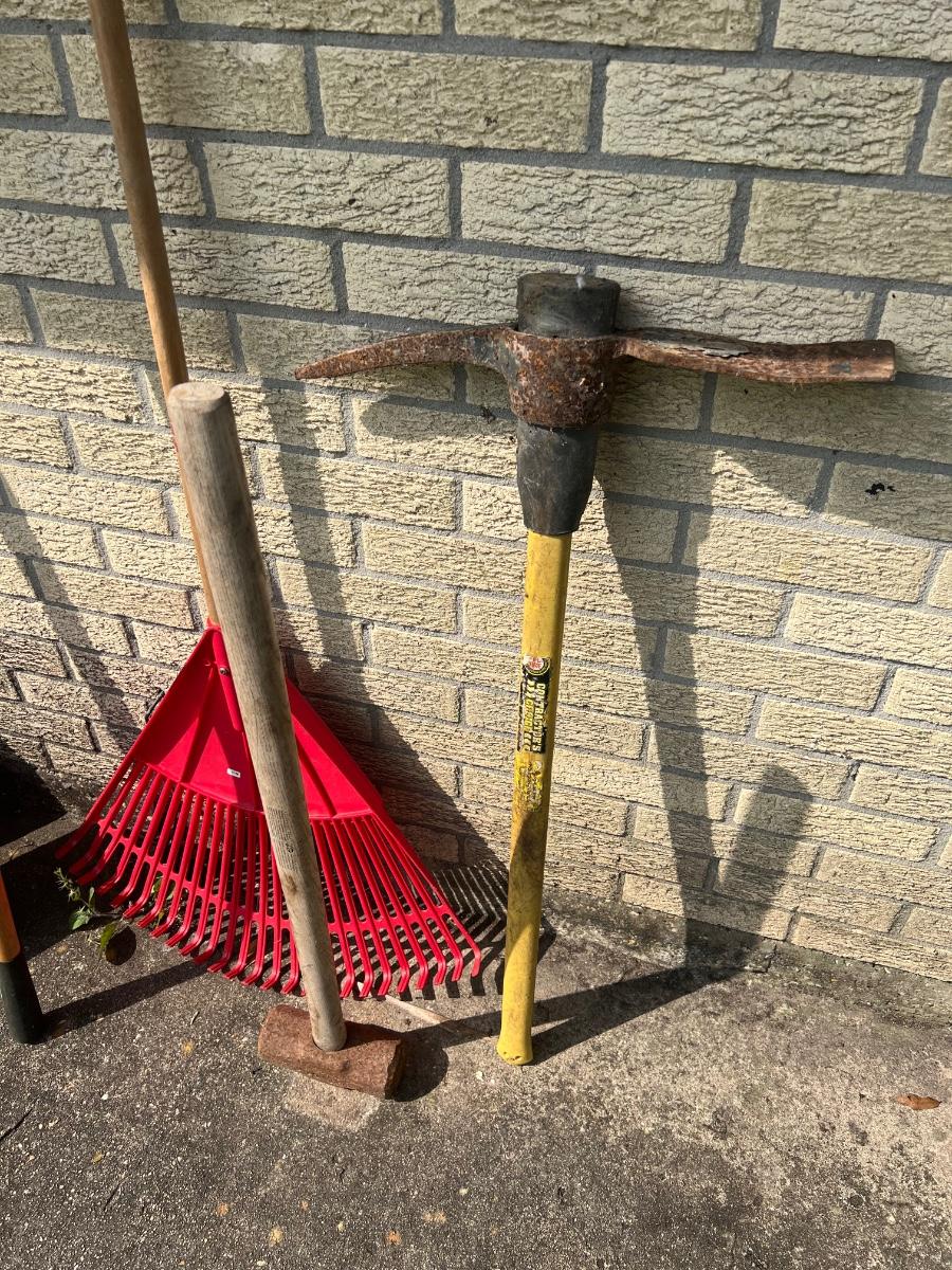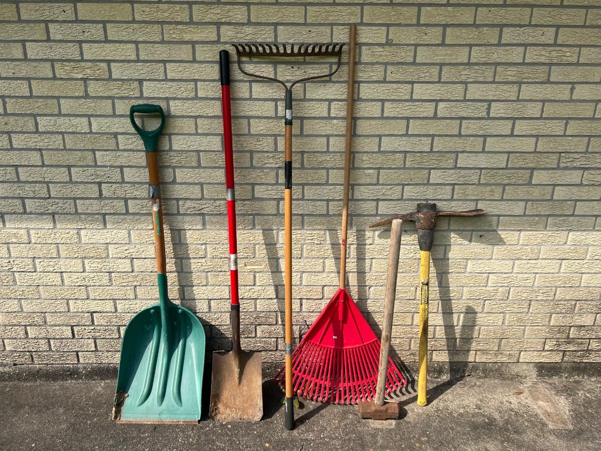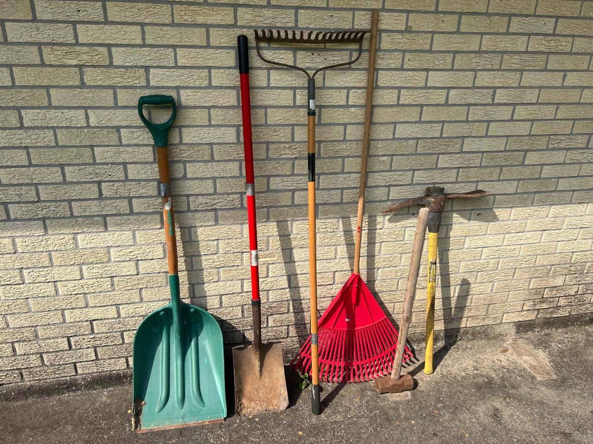 Lot of all 6 hand tools pictured. Notice rust on the pick axe and sledge hammer.