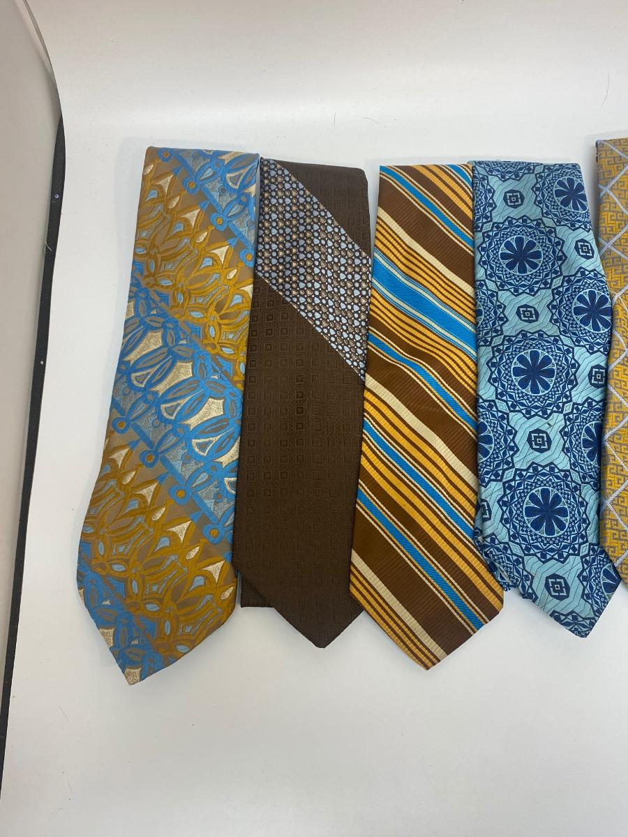 Lot of 6 funky retro neck ties. Similar blue & gold color scheme. Good used condition, may have discolor to back of neck but no spots or stains to the front of ties.
