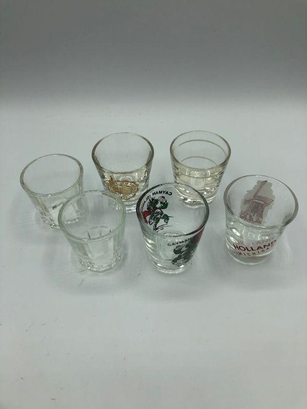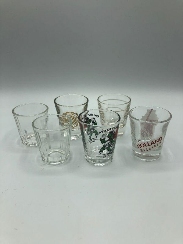 Lot of 6 shot glasses. 3 clear and 3 souvenir glasses.