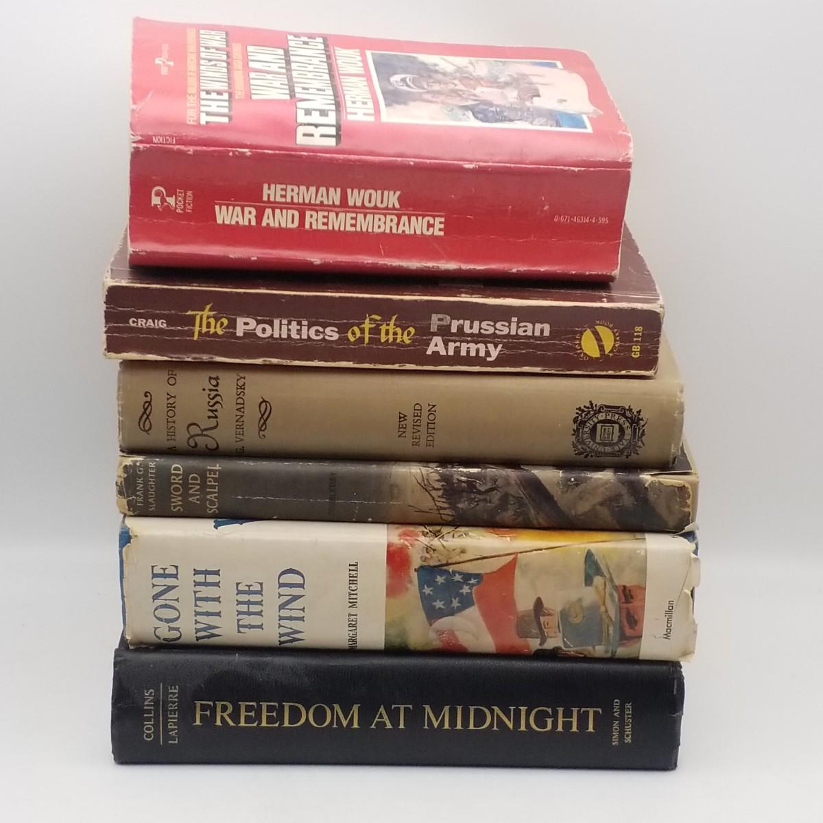 Lot of 6 Vintage Books - Novels / History / Military: Gone with The Wind, Freedom at Midnight, Sword and Scalpel, The Politics of the Prussian Army 1640-1945, War and Remembrance, A History of Russia
