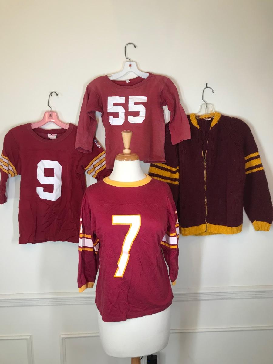 Varying sizes and condition. One has NFL logo. They are the colors of the Red Skins now Commanders. Sweater has zipper closure. In ok to good vintage condition. Tags: vintage clothing, vintage clothes, childrens, football, sports
