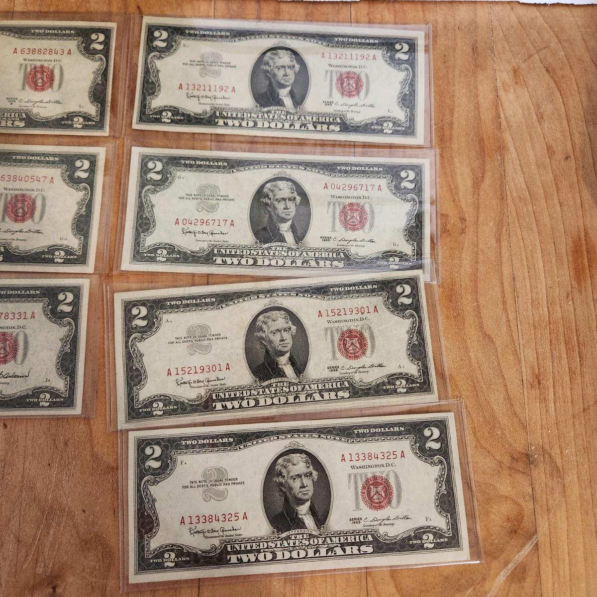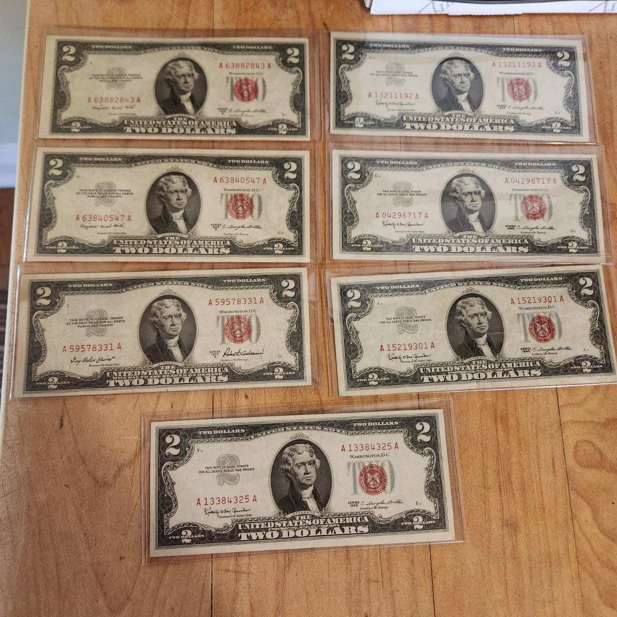 Lot of 7 $2 Dollar Bills ***Red Seal*** in Plastic Sleeves 3 1953 4 1963