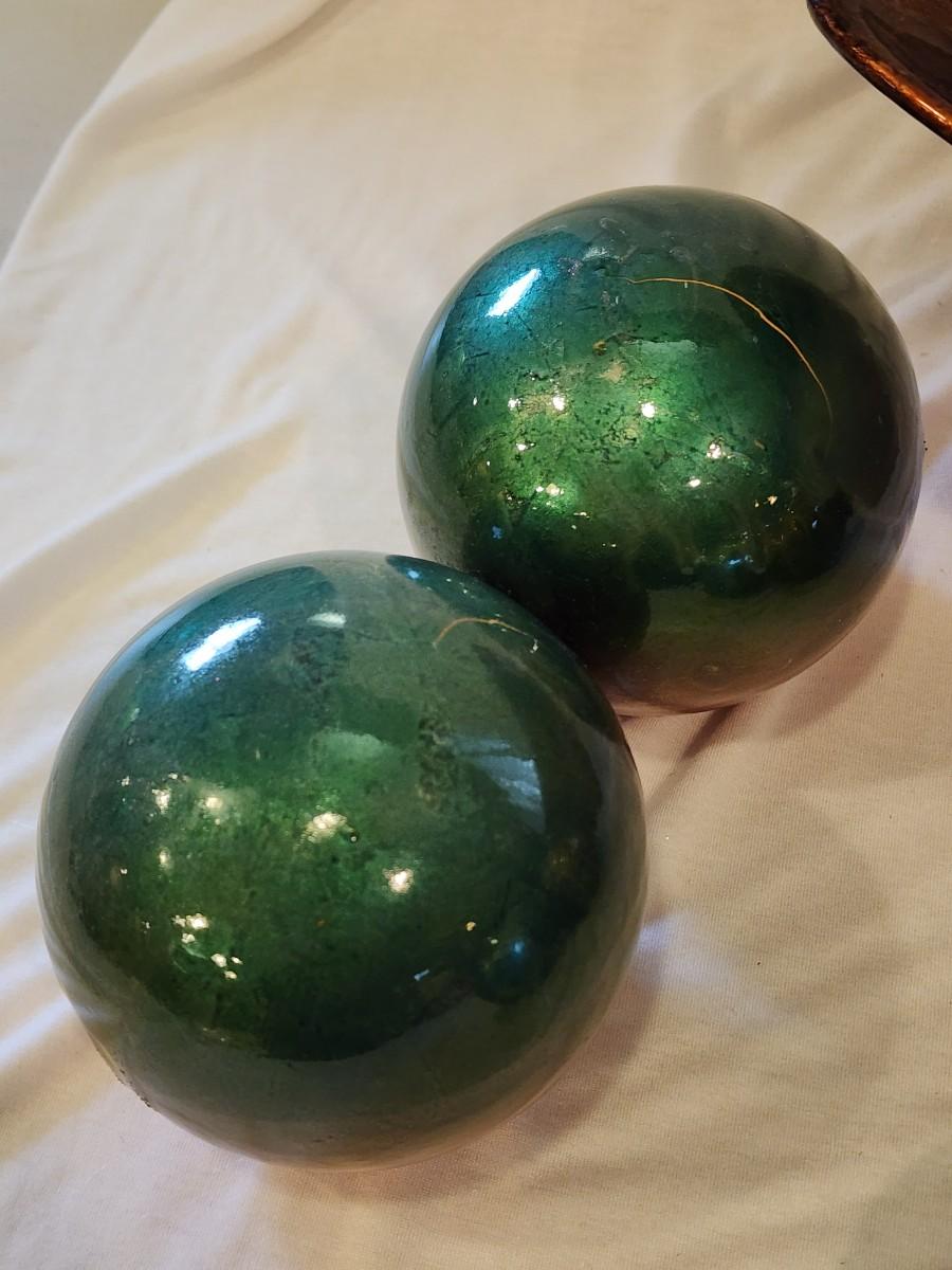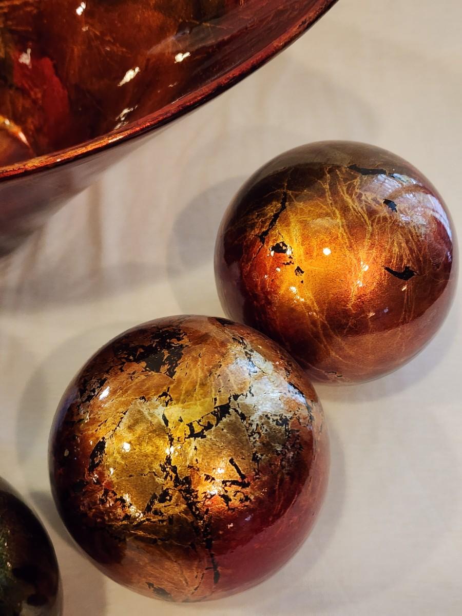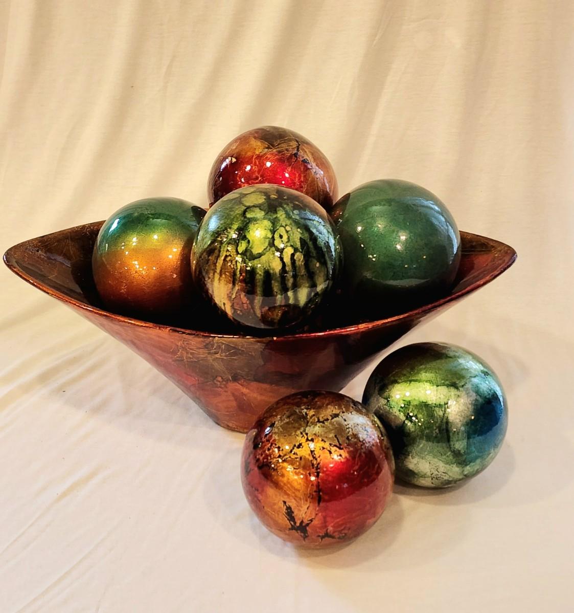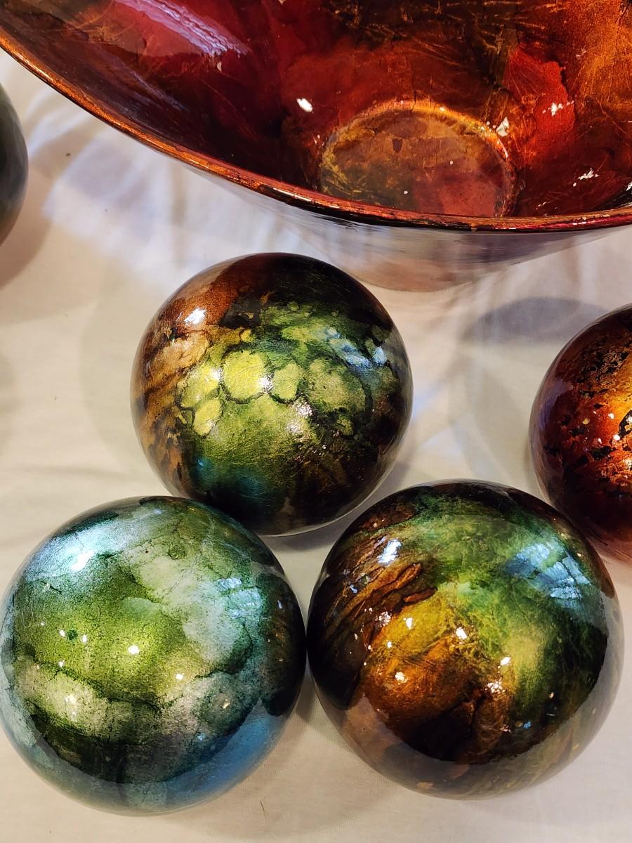 Metallic lacquered 15" x 8" bowl in red, orange and a hint of green. Each ball has one felted flat side so it can sit on a surface or in a bowl. The 2 mor solid colored balls have some cracking in the finish as shown in photos.