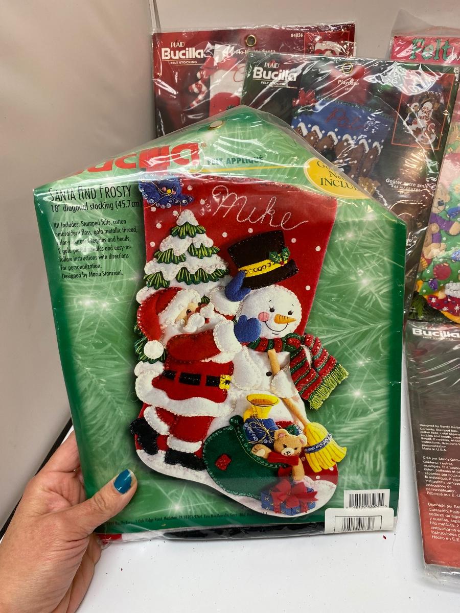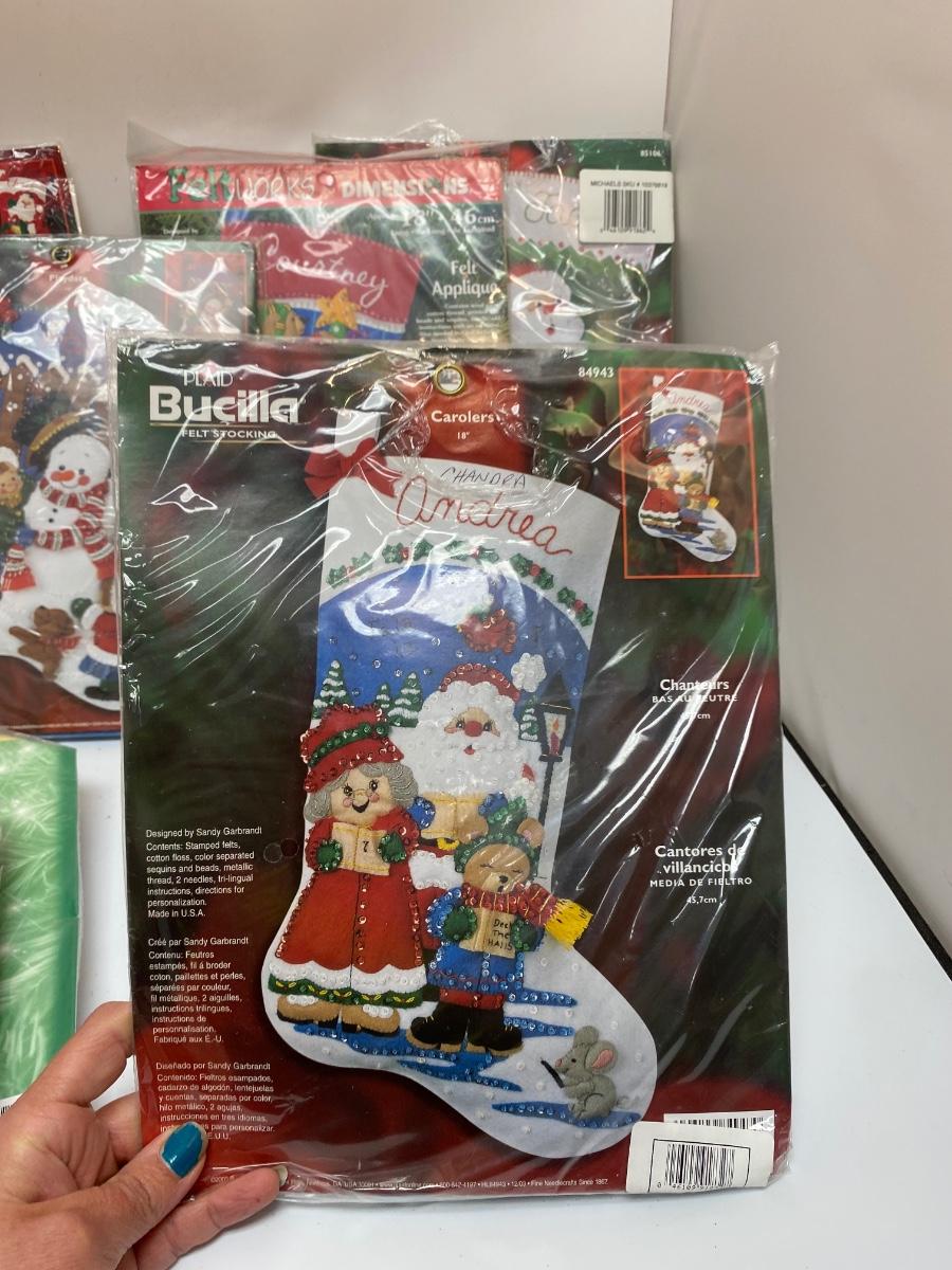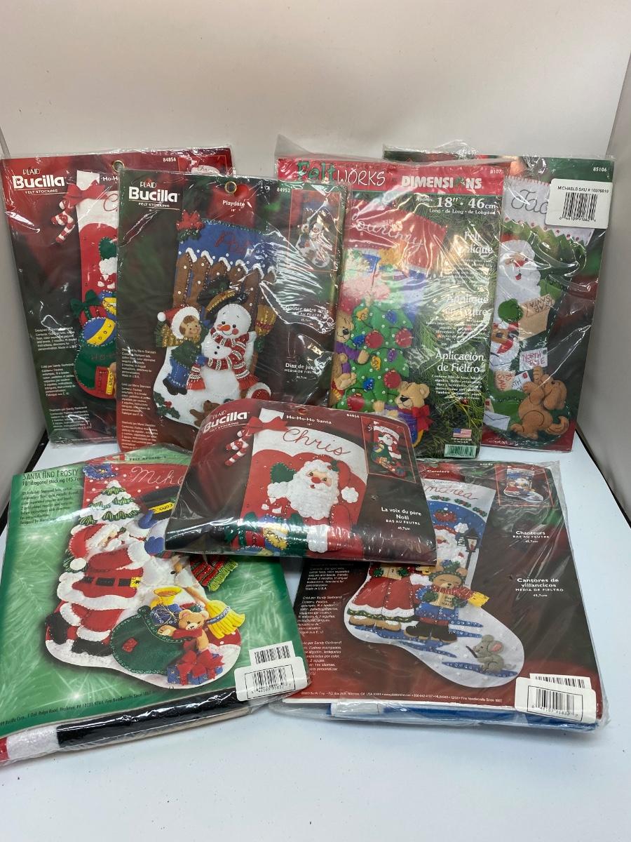 Lot of 7 Bucilla felt stocking craft kits. All but one are unopened. The one that has been opened looks to be complete. Sets come with instructions and the needed materials to make holiday stocking.