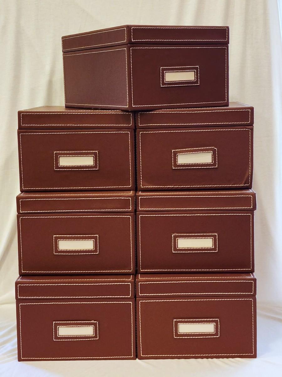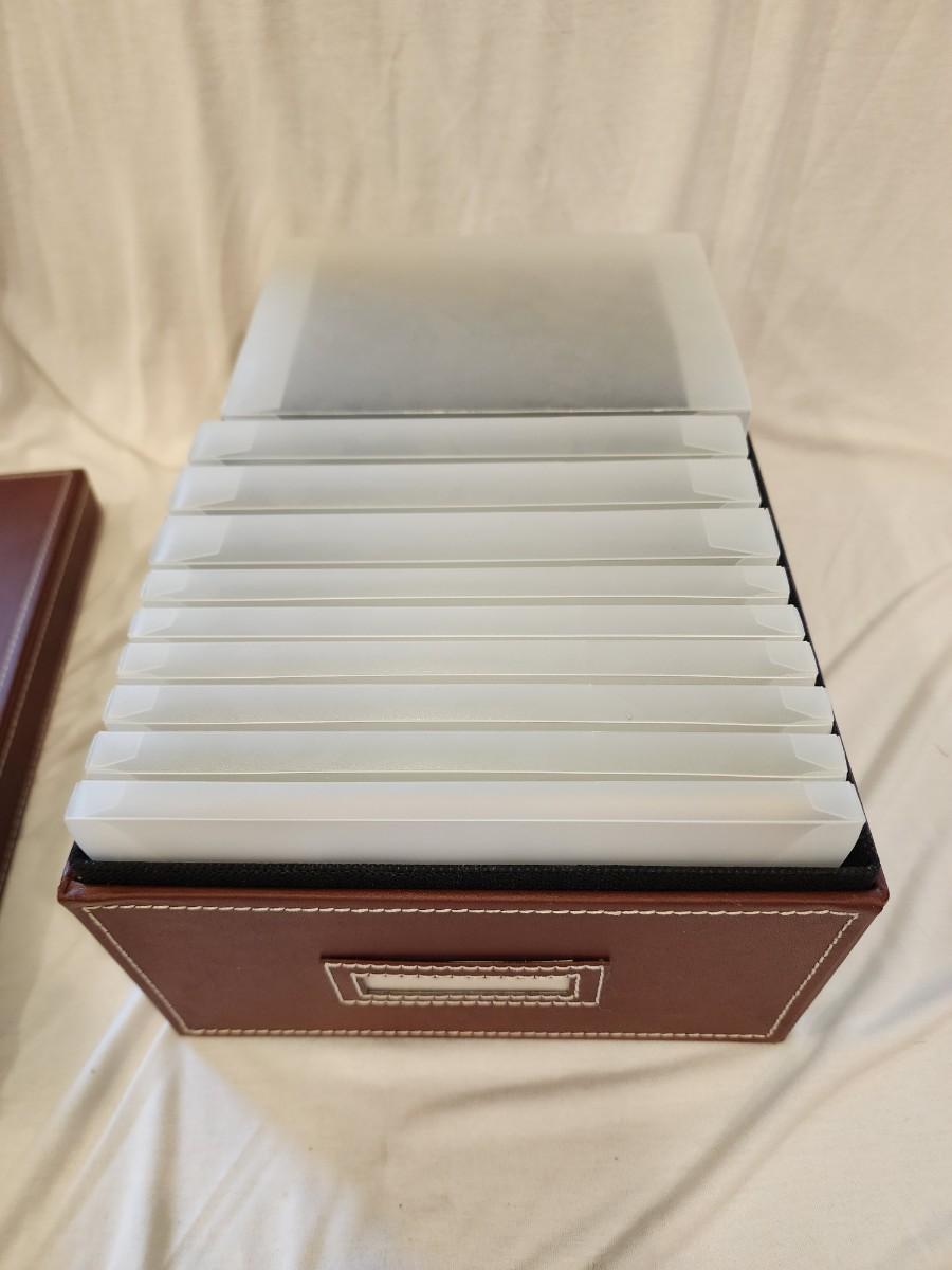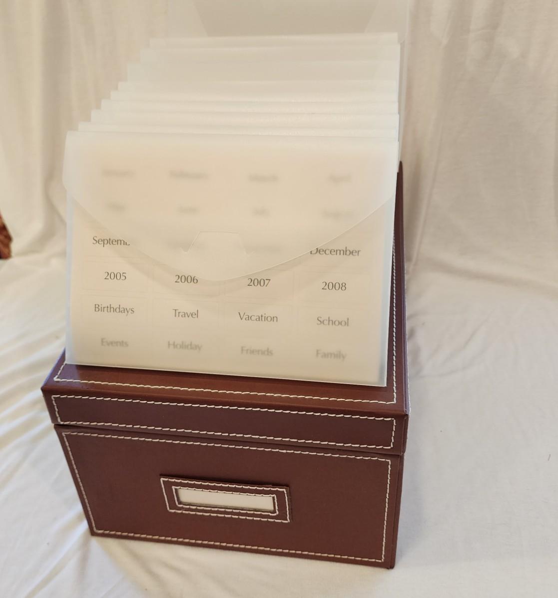 One has a flaw on the front as.shown. also included - one set of 10 plastic organizer envelopes that fit inside a box as shown..