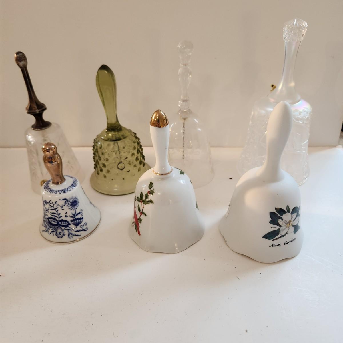Lot of 7 Glass Bells Fenton, RCR Italian Crystal, Enesco, Lefton,