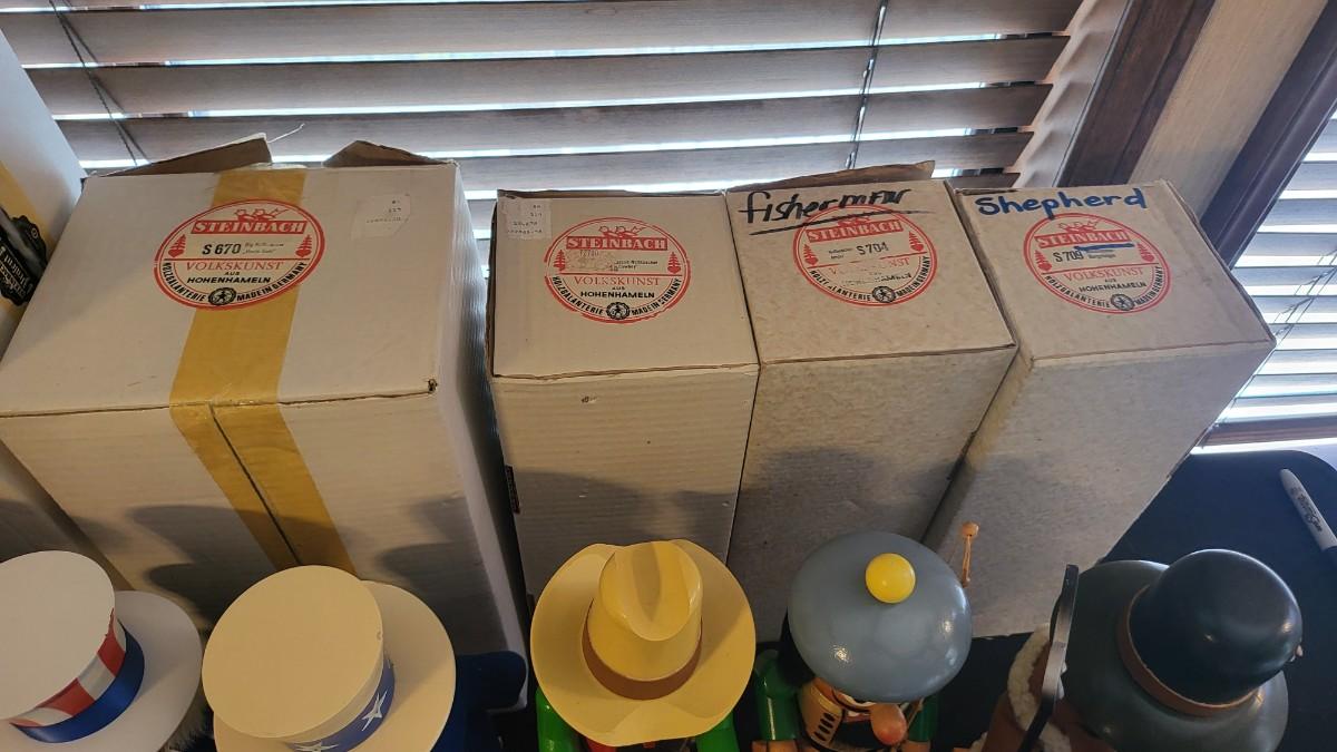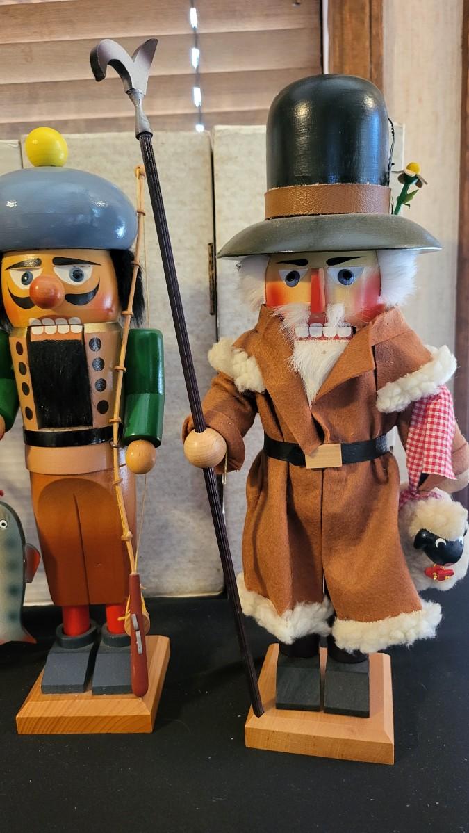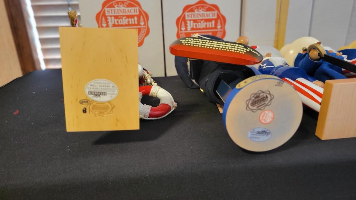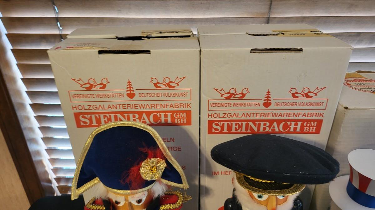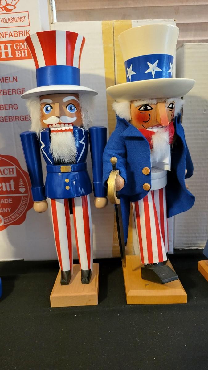 This lot includes 2 larer nutcrackers & 2 Uncle Sam's. 1 uncle Sam is not Steinbach. The measure 14" to 18" tall. All in good condition. All stored in original boxes for the last 15 years!