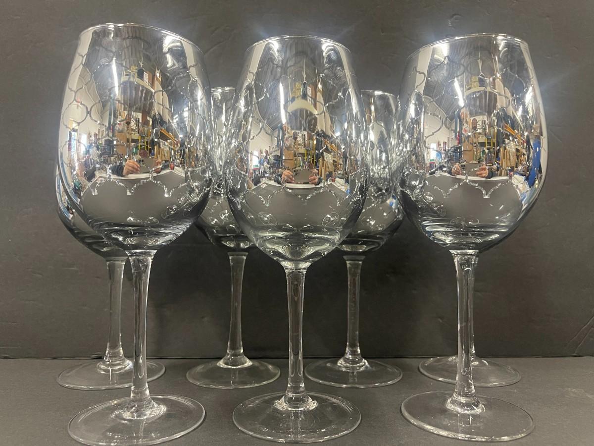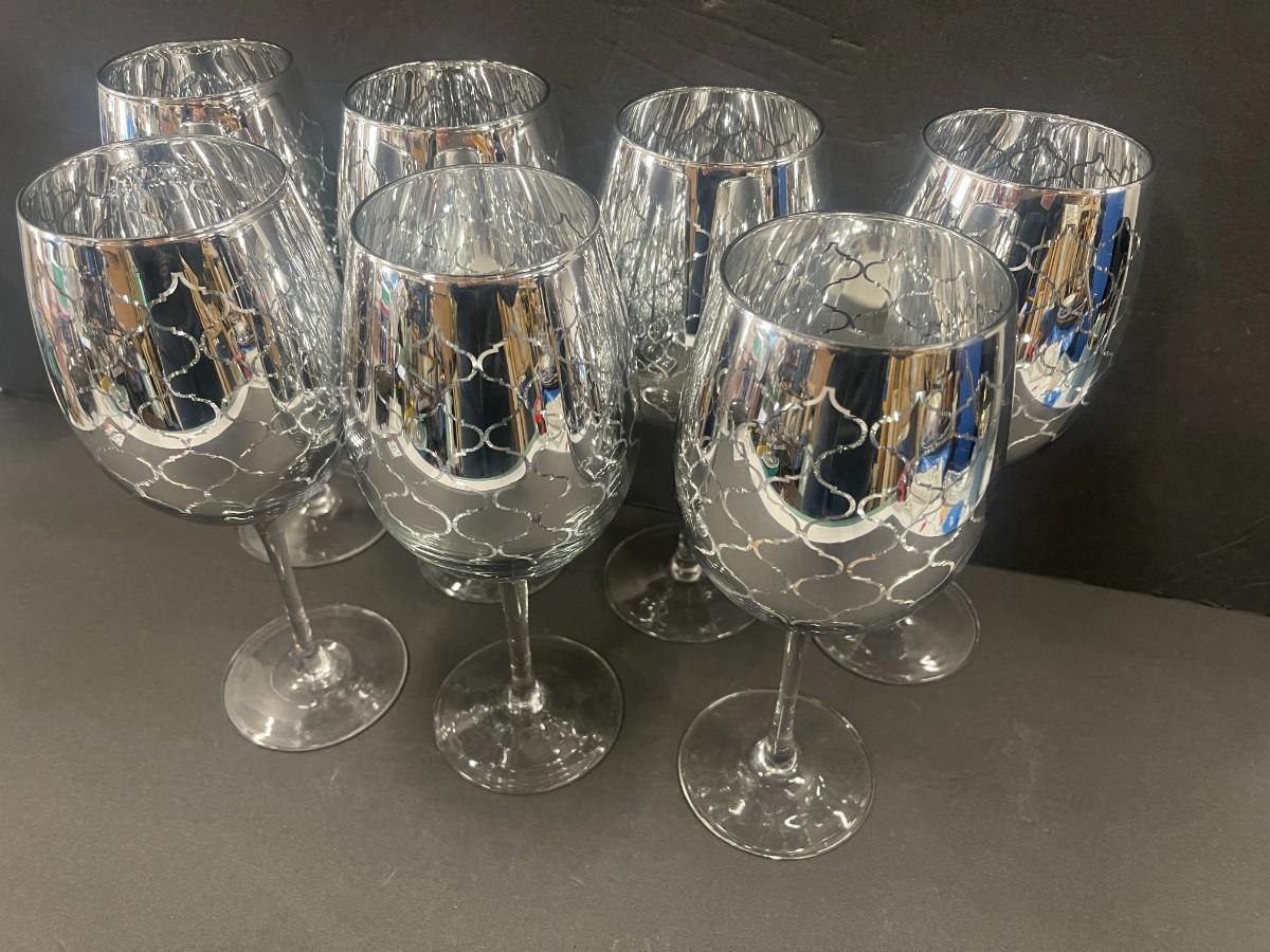 Lot of 7 Mirrored Glass Trellis Pattern Wine Glasses, all in excellent condition.