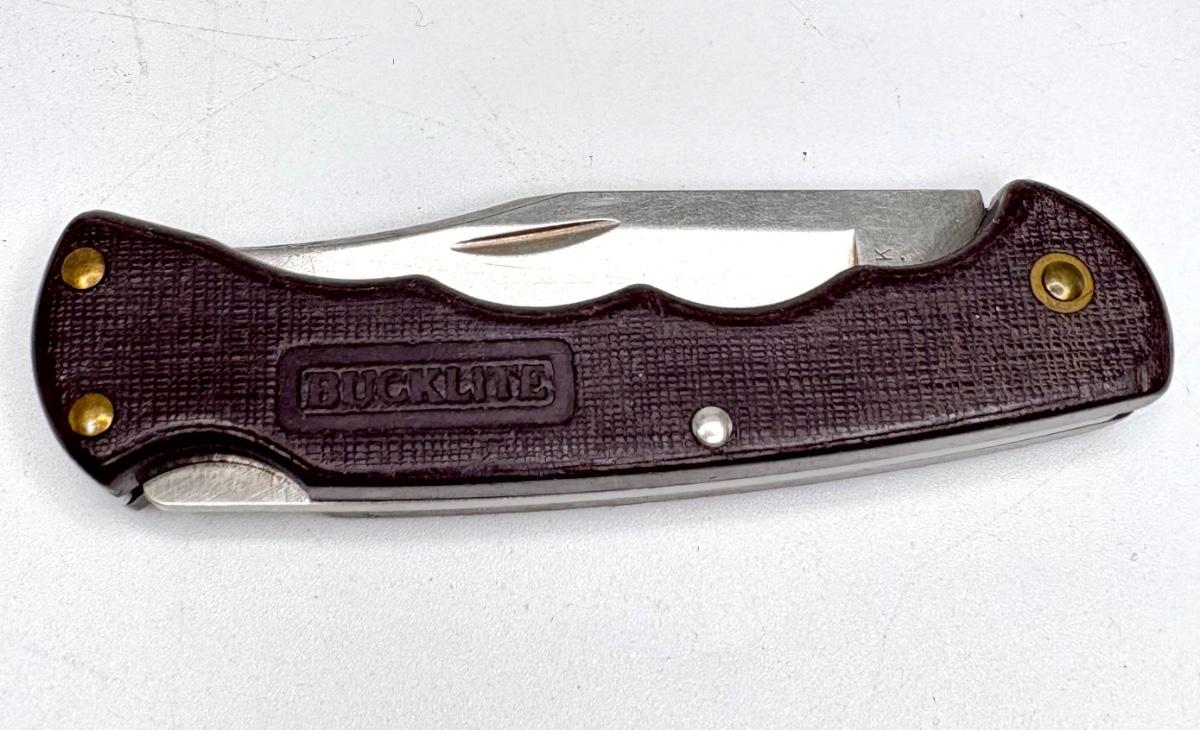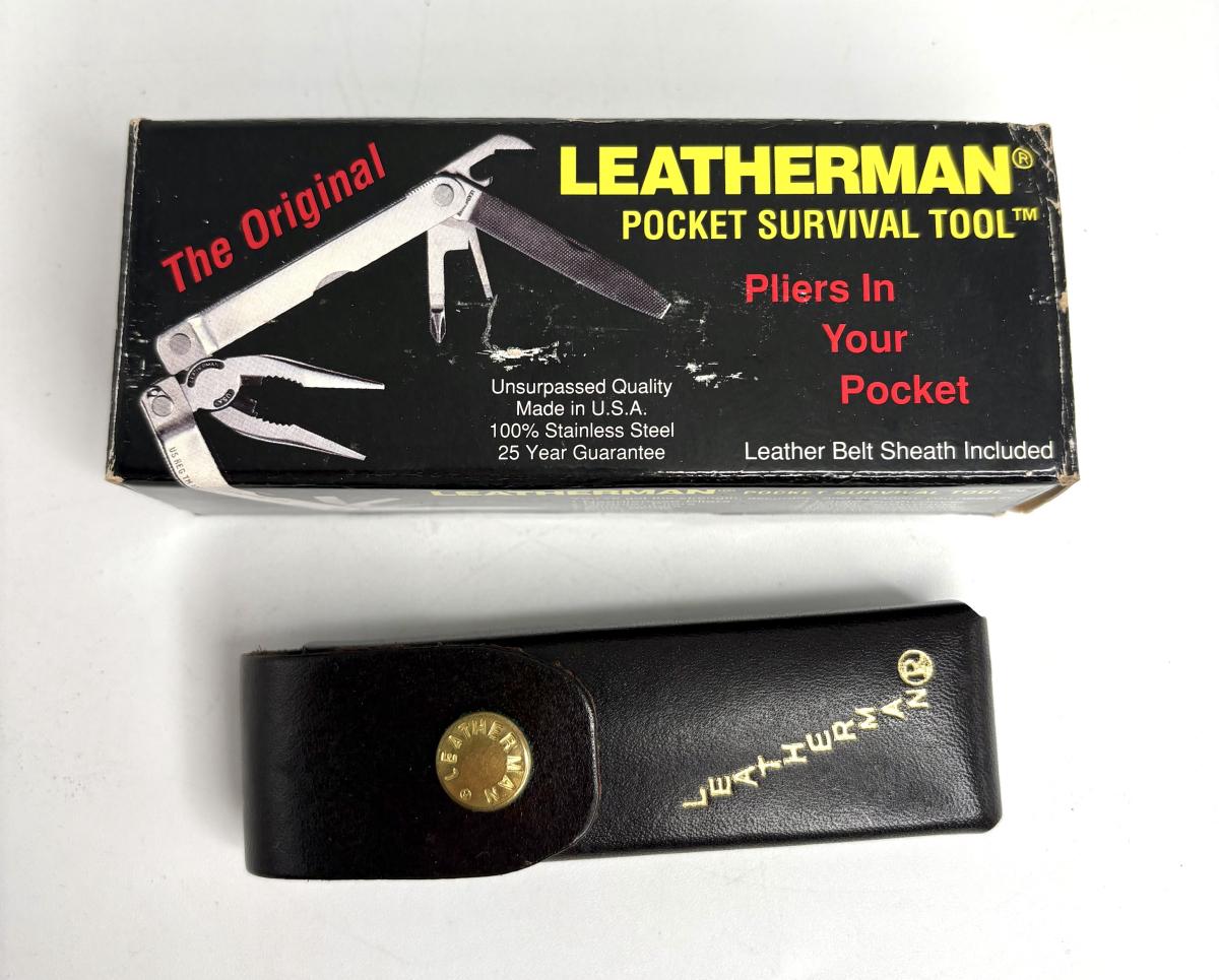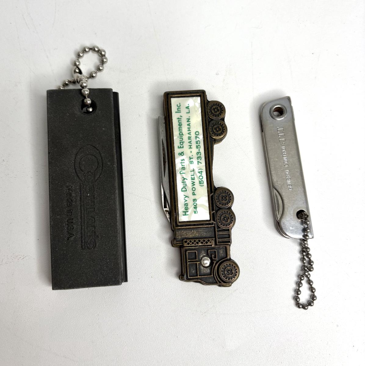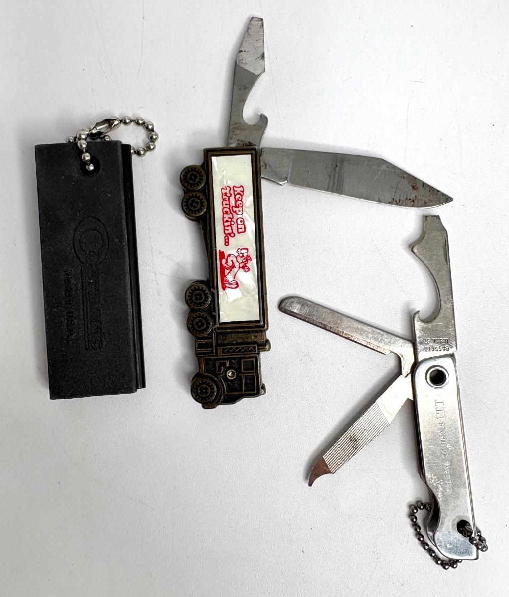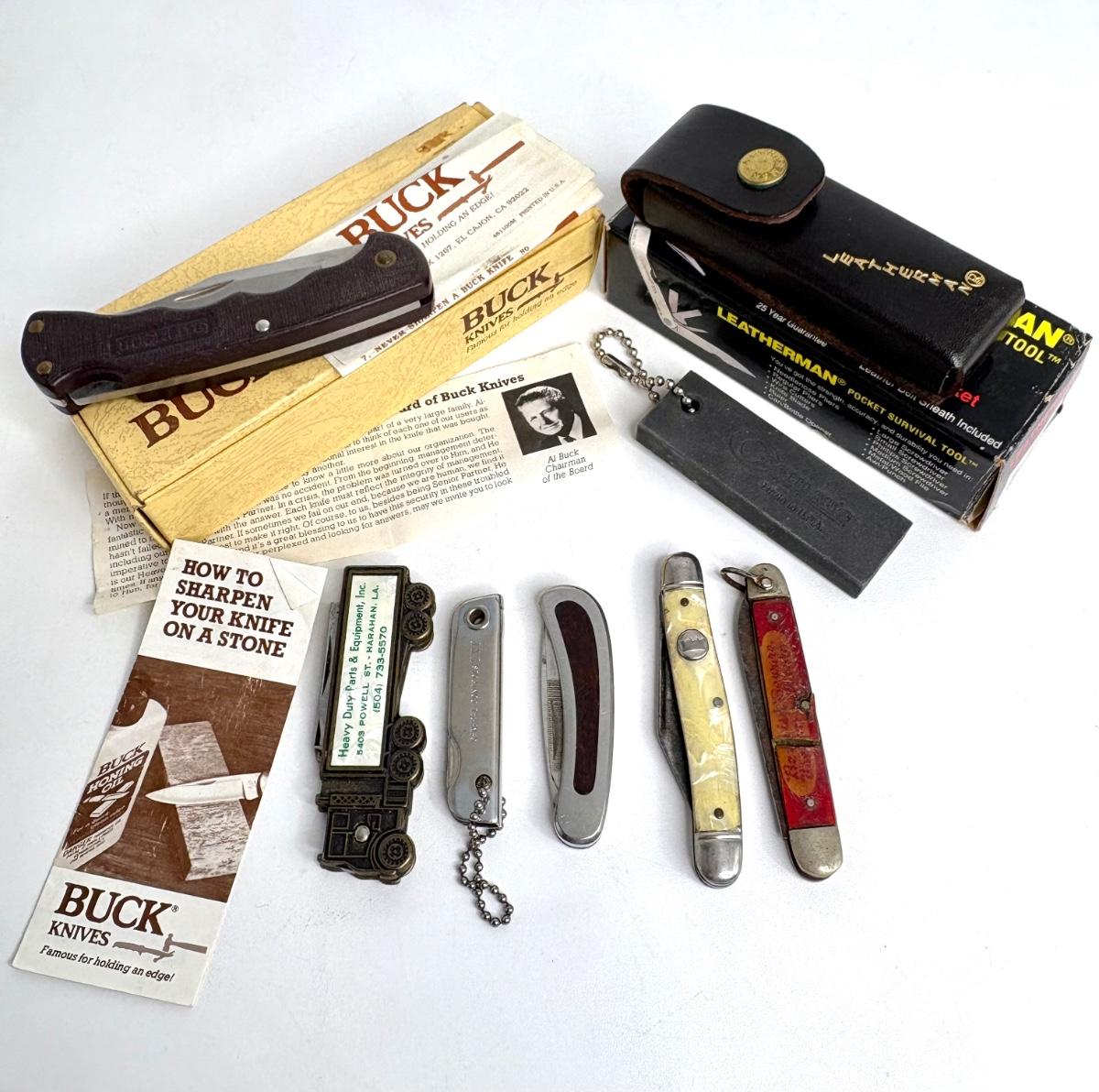 Buck knife is 4-1/4” long; Leatherman is 4” long; truck pocket knife is 3-1/3” long; cream colored knife is 3-1/4” long; red knife is 3” long; silver and brown knife is 2-1/2” long; steel knife is 2-1/2” long; sharpener is 3”.