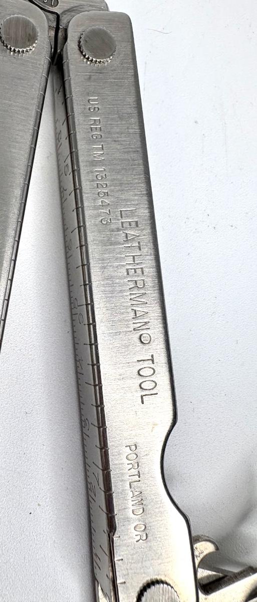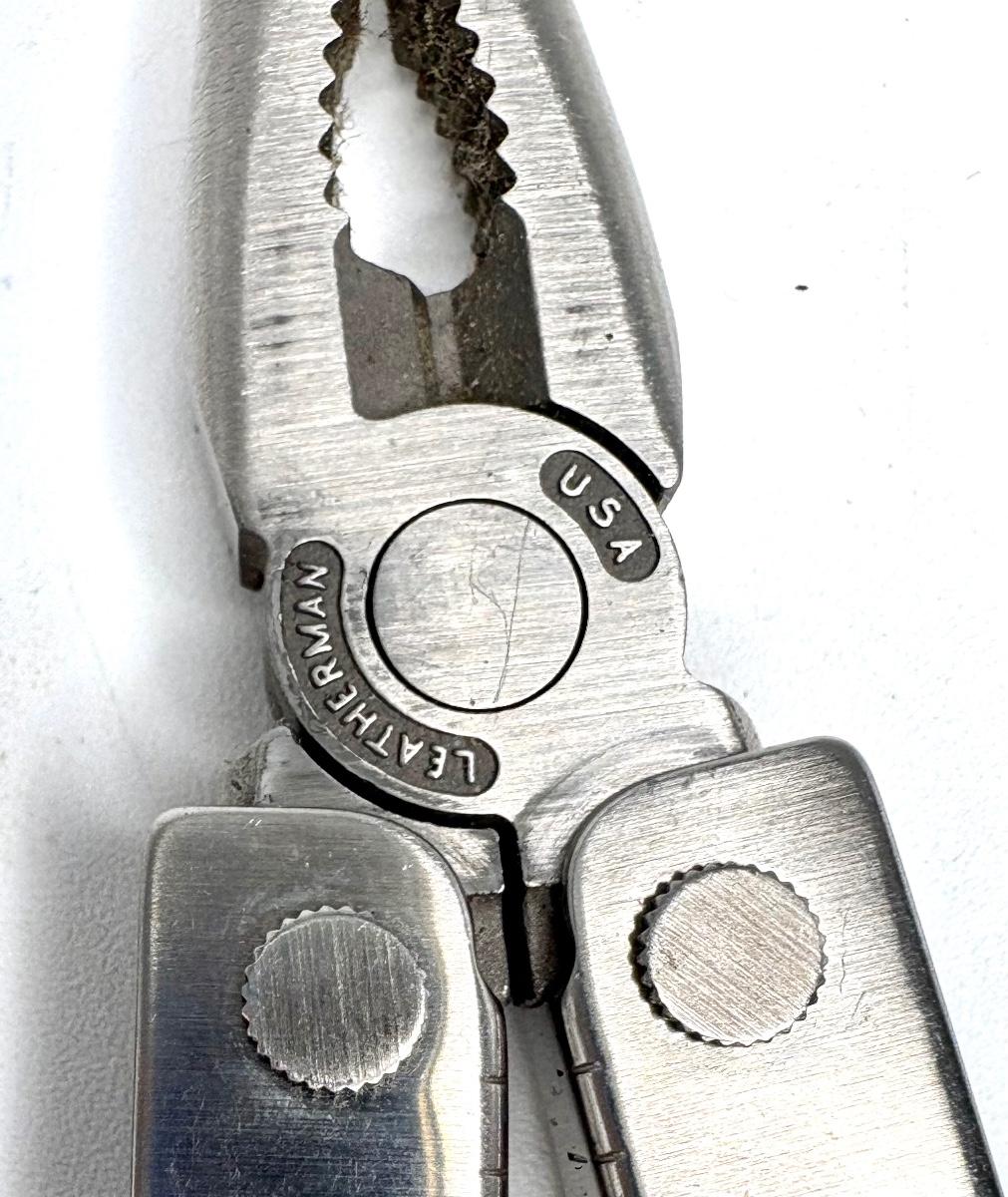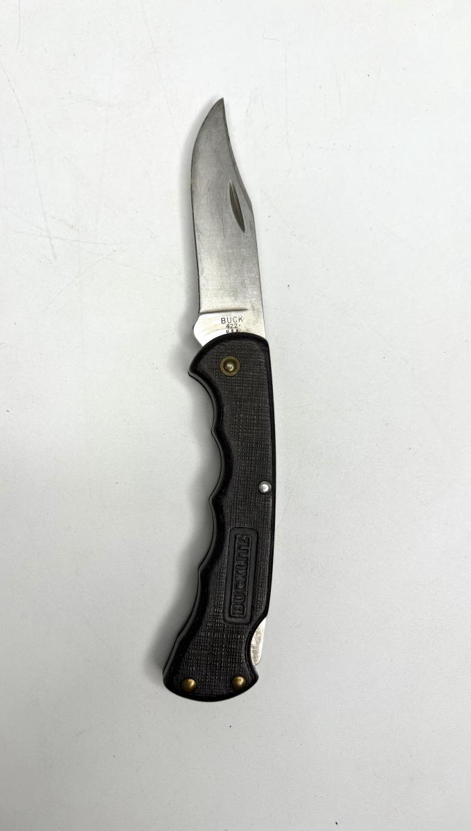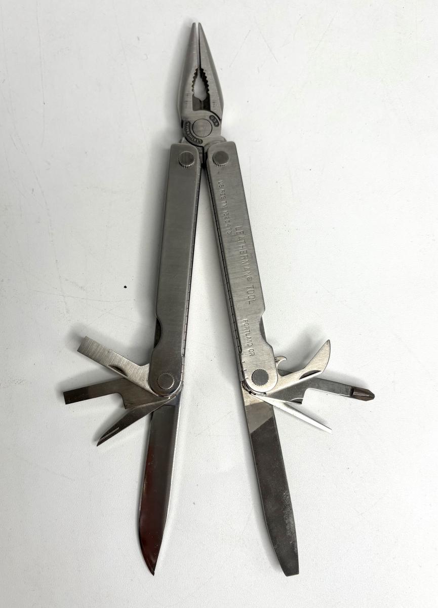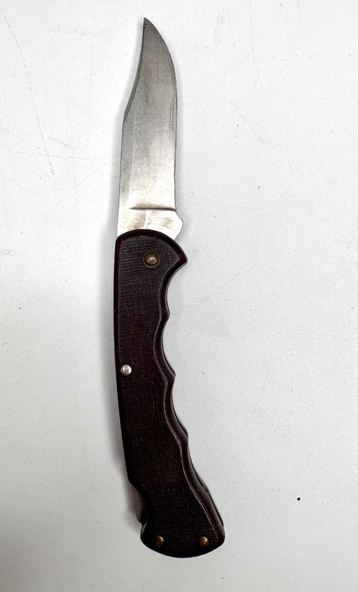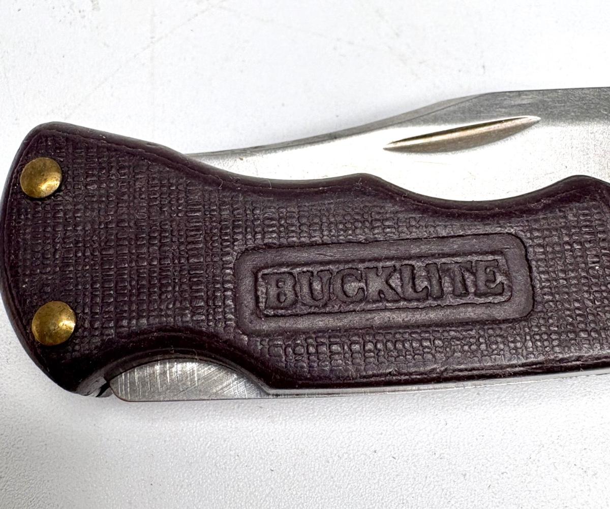 Buck knife is 4-1/4” long; Leatherman is 4” long; truck pocket knife is 3-1/3” long; cream colored knife is 3-1/4” long; red knife is 3” long; silver and brown knife is 2-1/2” long; steel knife is 2-1/2” long; sharpener is 3”.